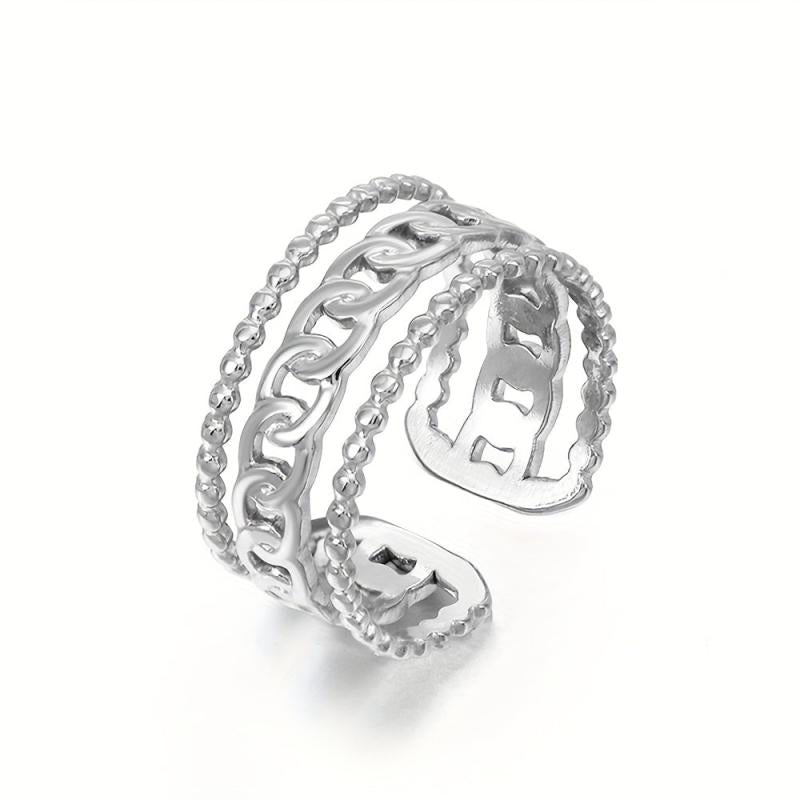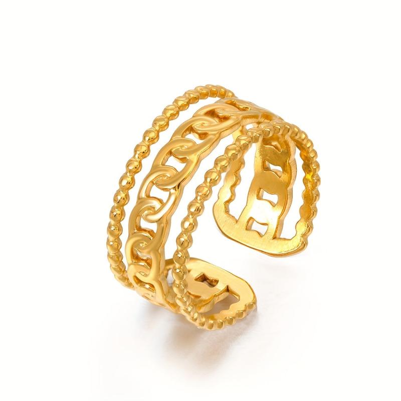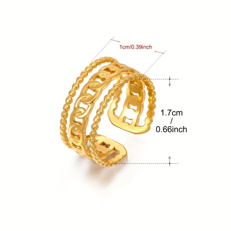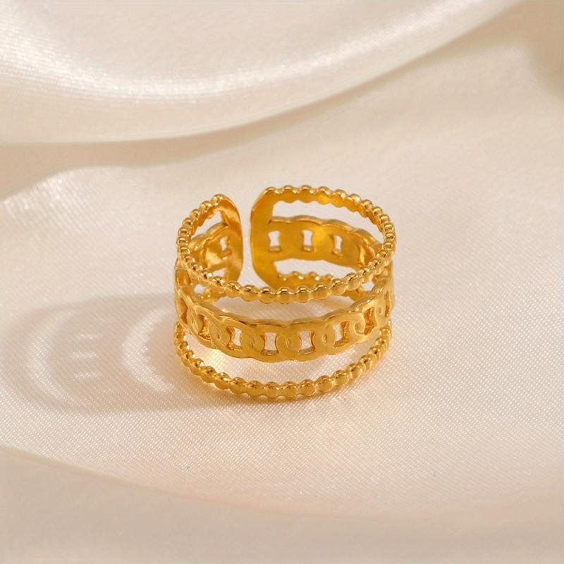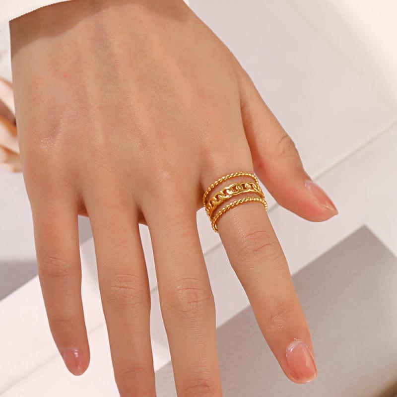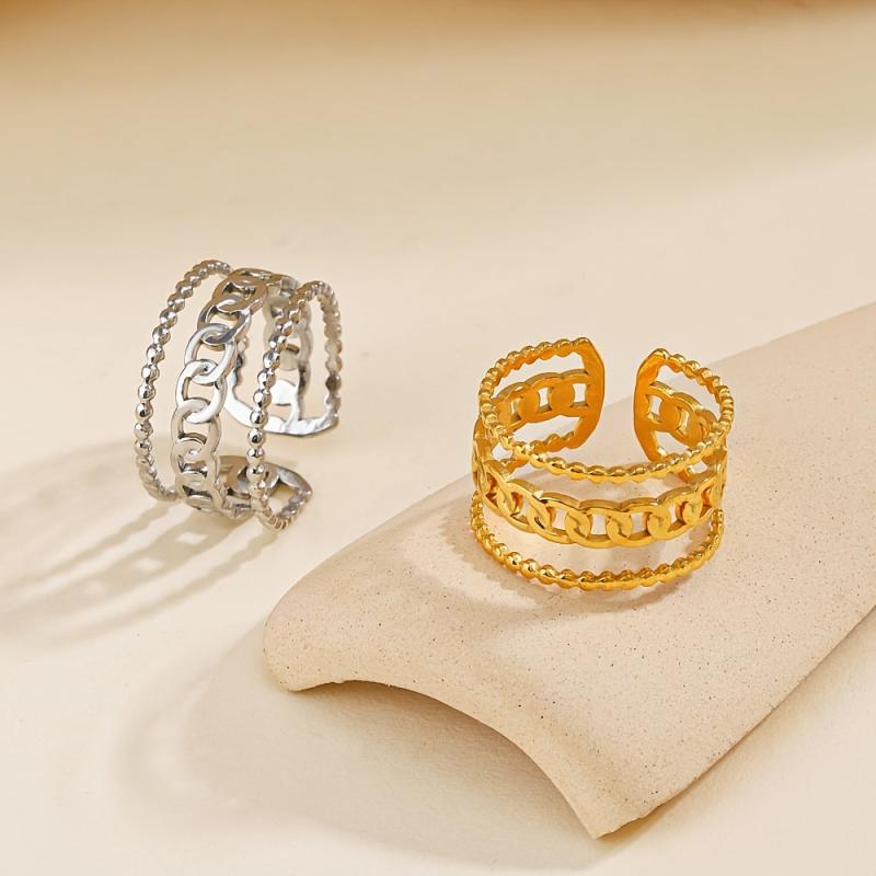 This versatile ring is perfect for casual attire or parties. It features three layers of chain links and is minimalist in design, suitable for stacking with other jewelry pieces.