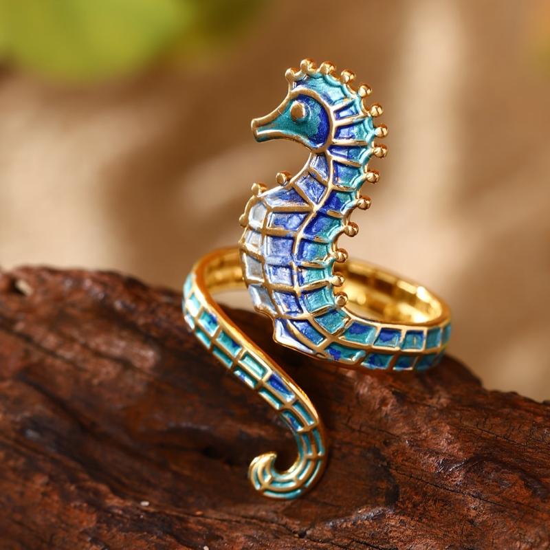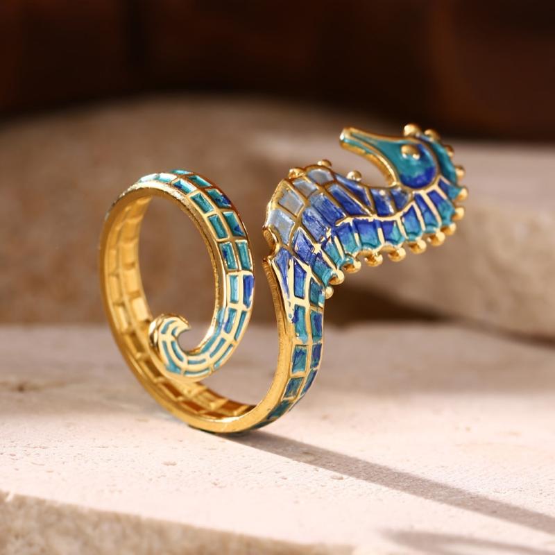 Add a touch of Bohemian charm to your outfit with this colorful seahorse ring. Featuring vibrant and green enamel tiles, this nautical-themed accessory is perfect for everyday wear in the spring and summer seasons.