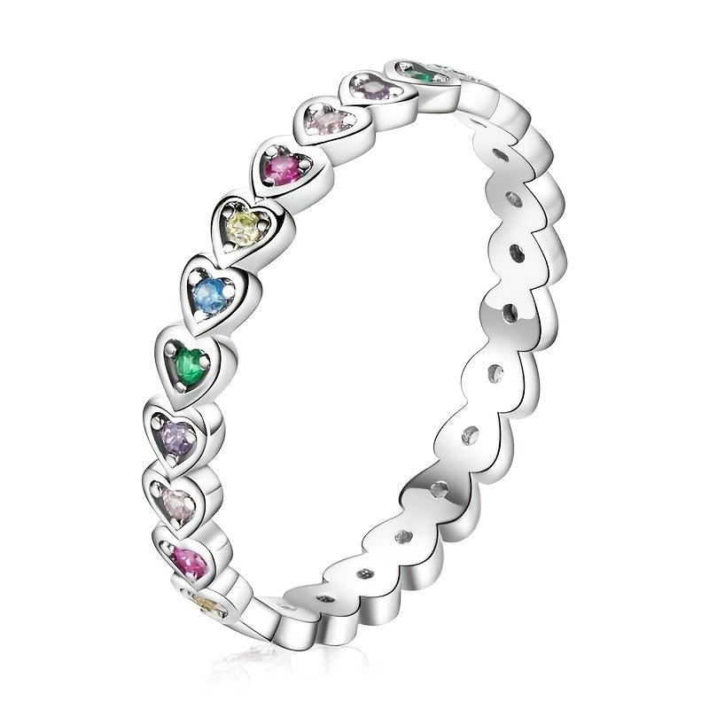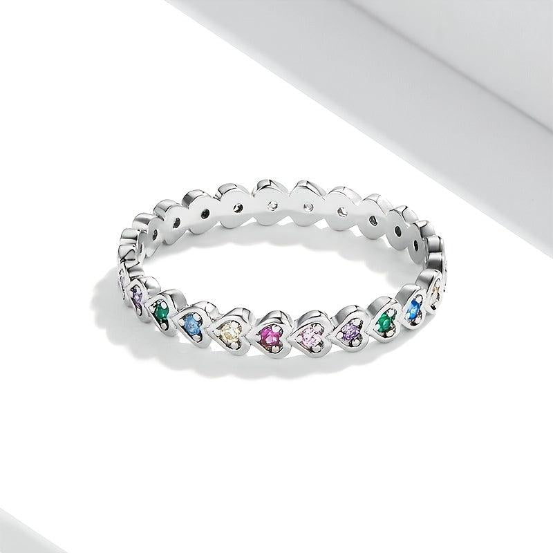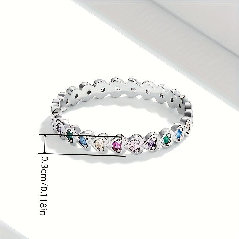 This stunning ring is intricately set with colorful synthetic zirconia in a continuous heart design. Perfect for casual outings, dates, and parties.