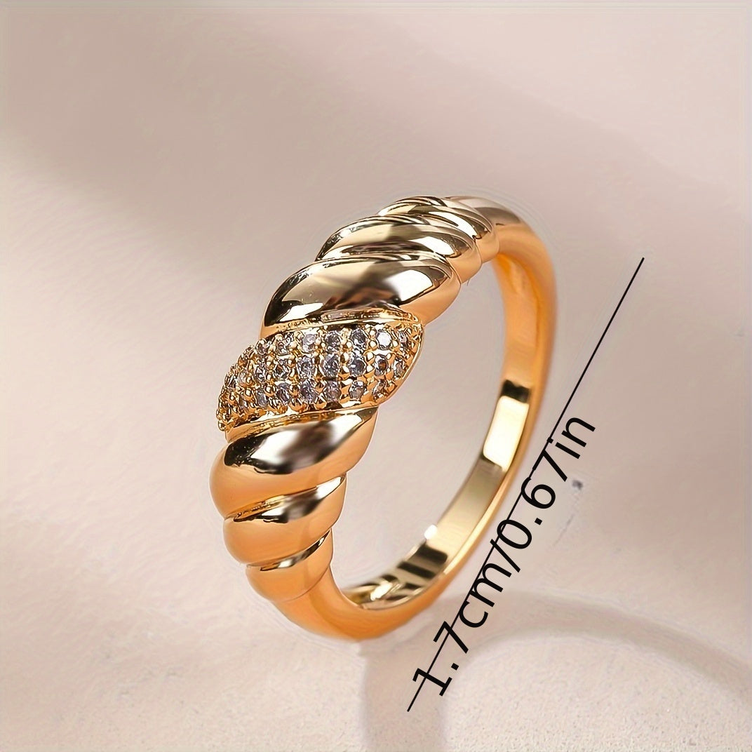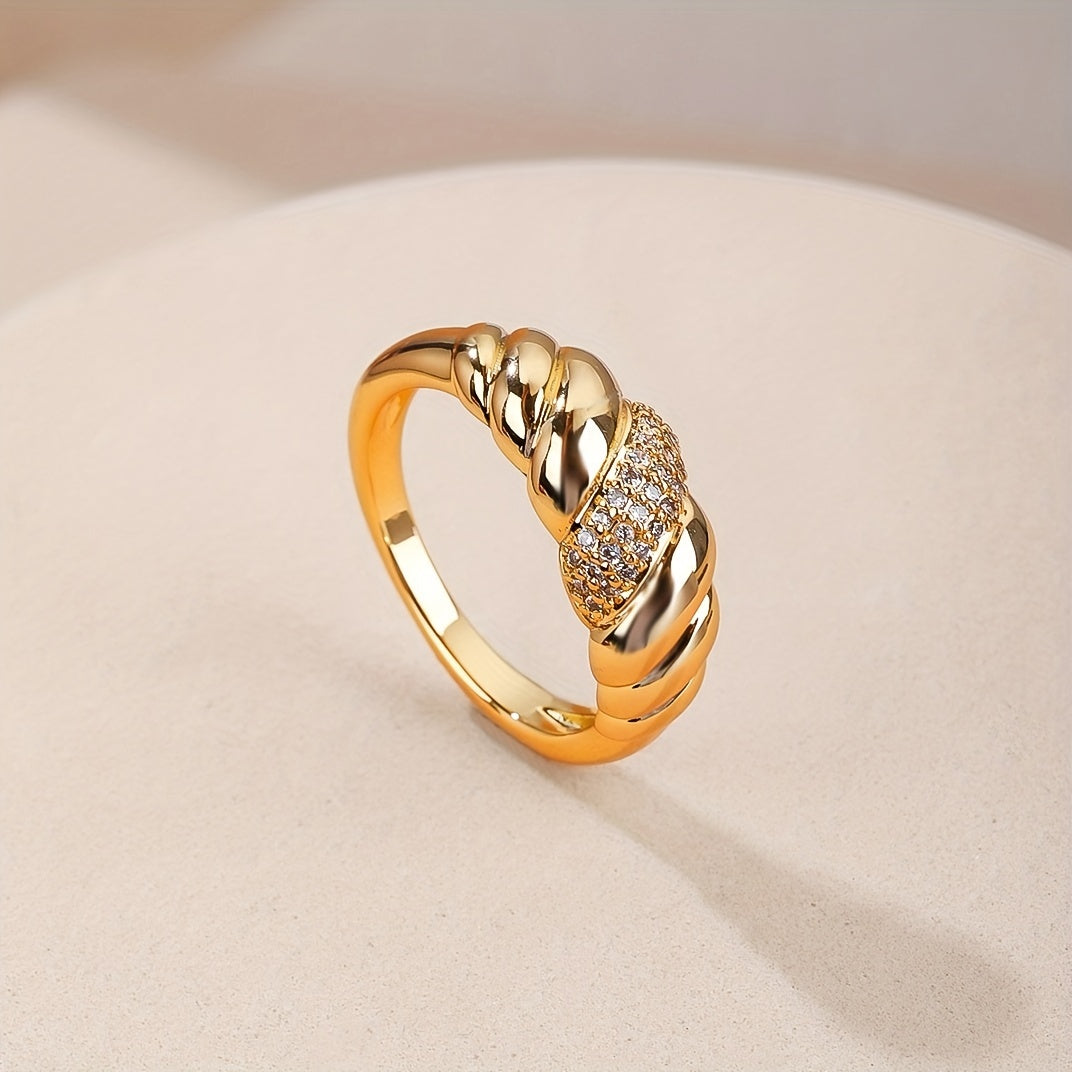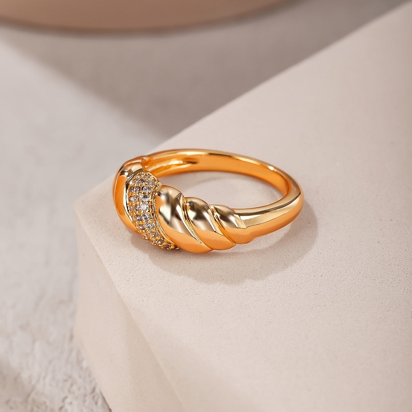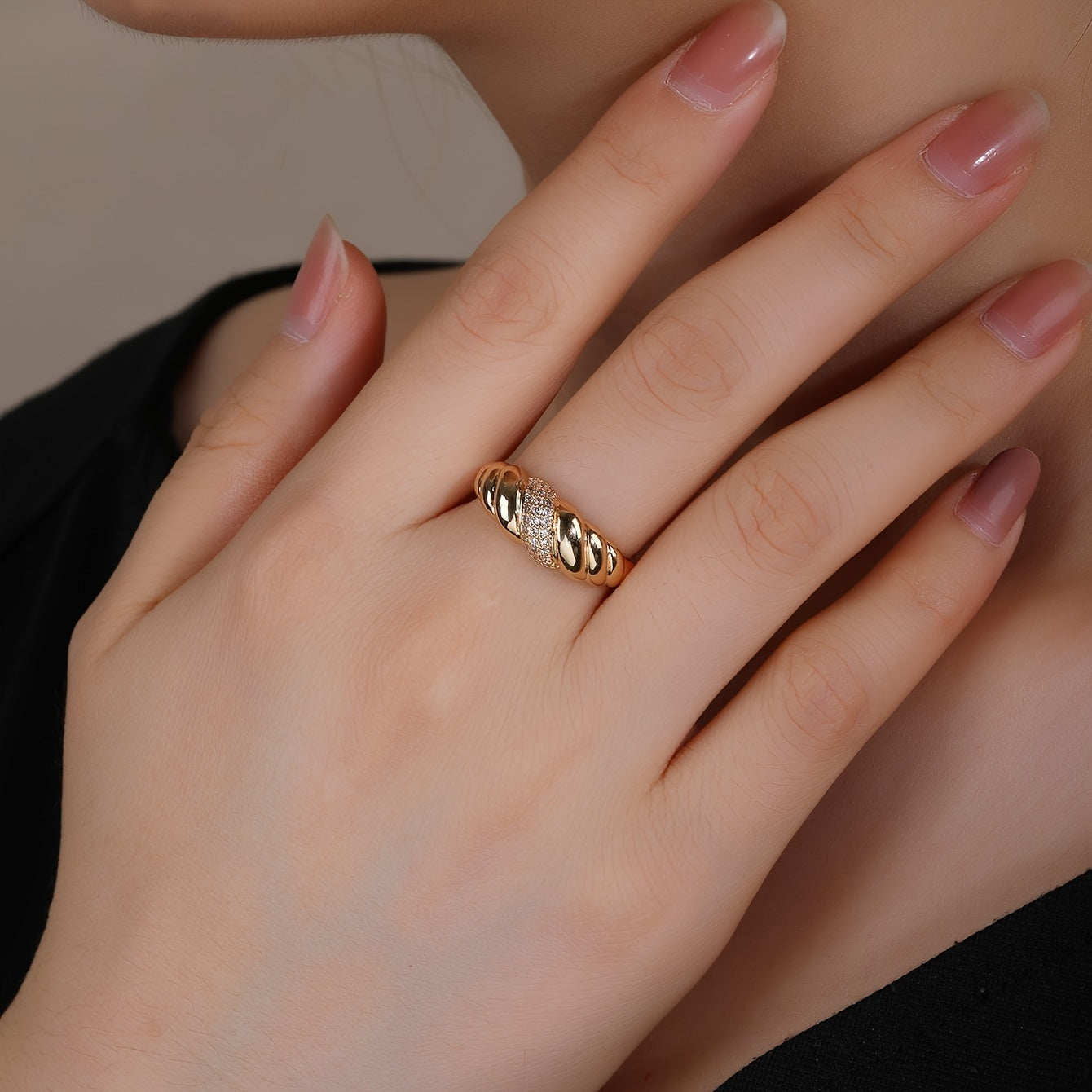This stylish croissant ring is plated with 14k gold and paved with shining zirconia. It is suitable for both men and women to match daily outfits or as a party accessory.