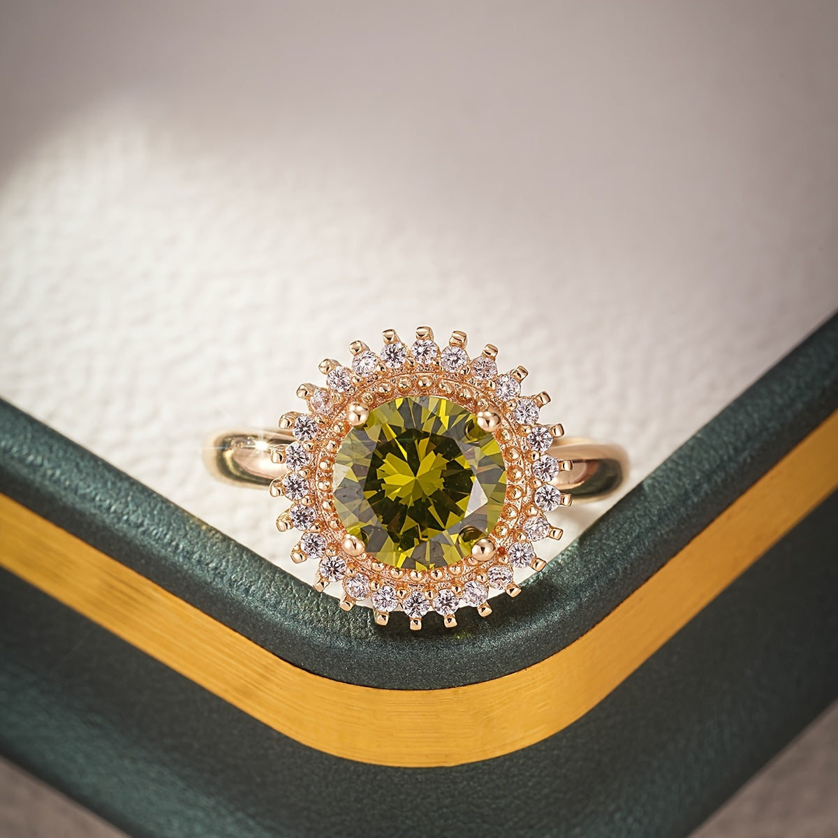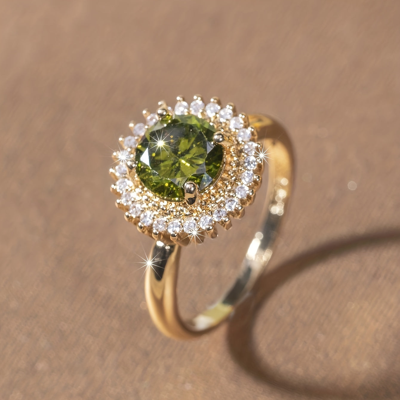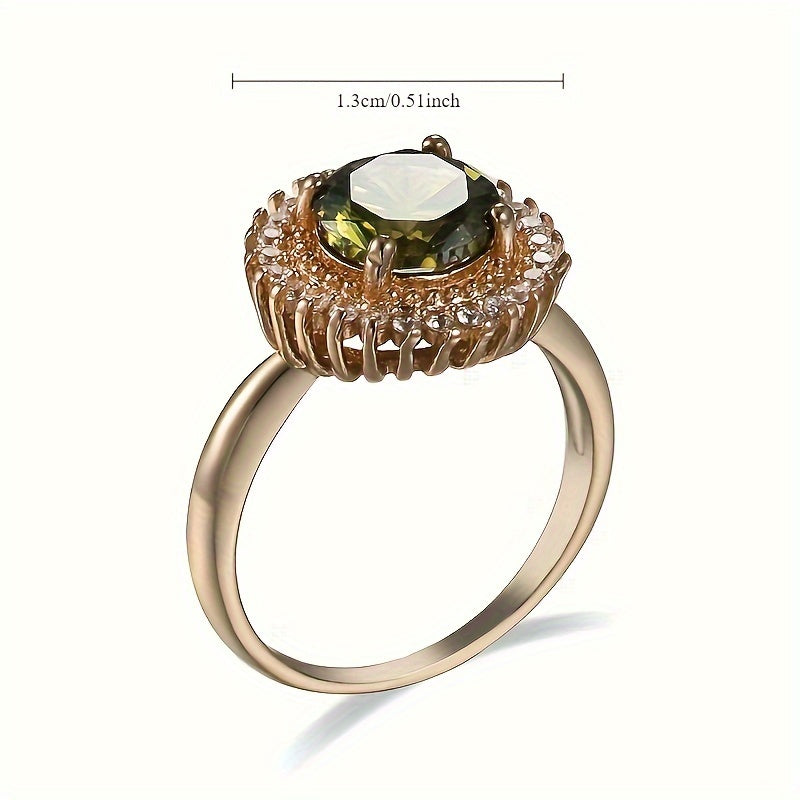 This geometric ring for women features a golden tone copper design with synthetic cubic zirconia, making it perfect for weddings and parties. Available in sizes 6 to 11. Box not included.