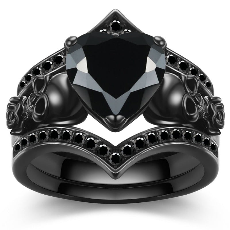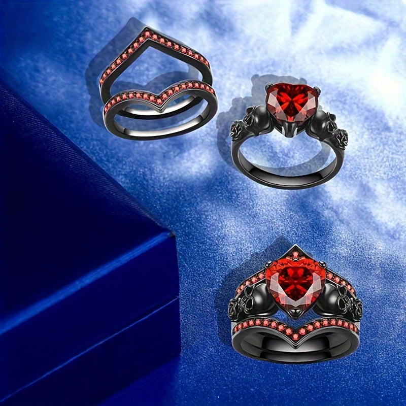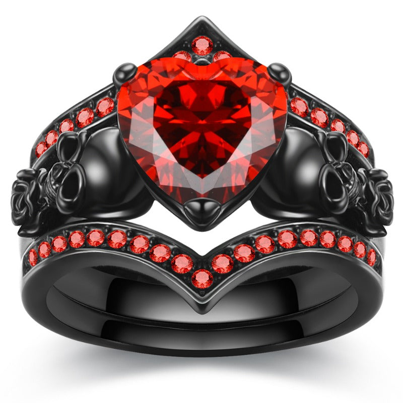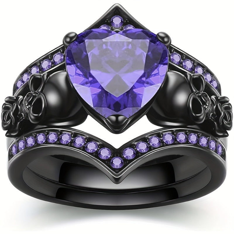 This stunning Gothic Rose Flower Skull engagement rings set features red and purple heart-shaped zirconia crystals. Perfect for weddings, anniversaries, holidays, or Halloween gifts.
