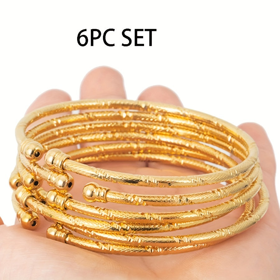 Enhance your look with this set of 6 classic bangles featuring intricate embossed patterns. Perfect for open jewelry parties, Ramadan, and Valentine's Day.