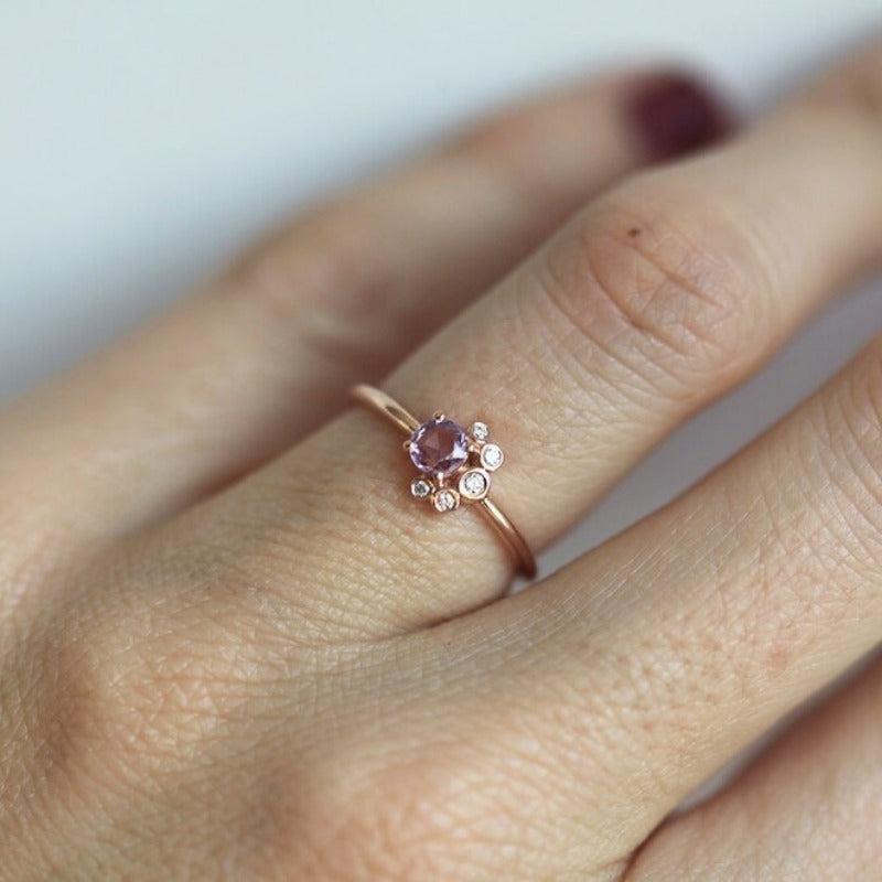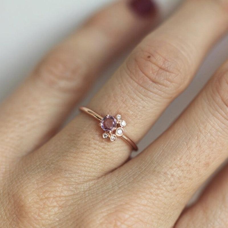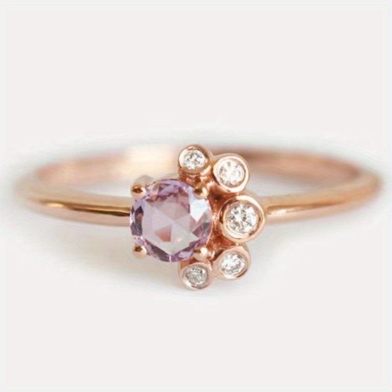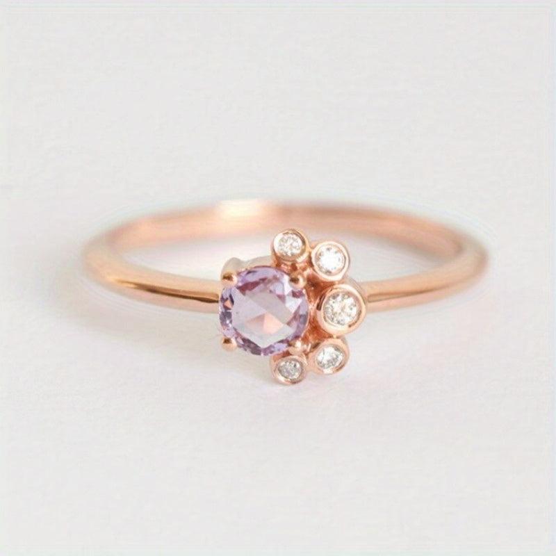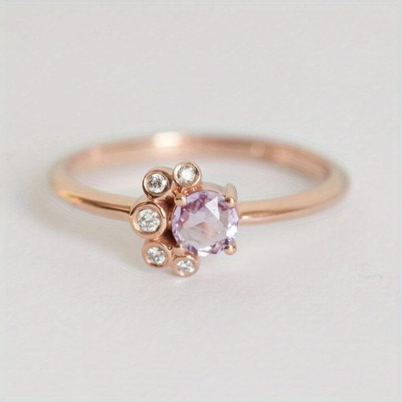 Upgrade your look with this stunning rose gold-plated ring featuring pinkish purple synthetic zirconia and clear stones. Perfect for weddings, engagements, or casual wear.