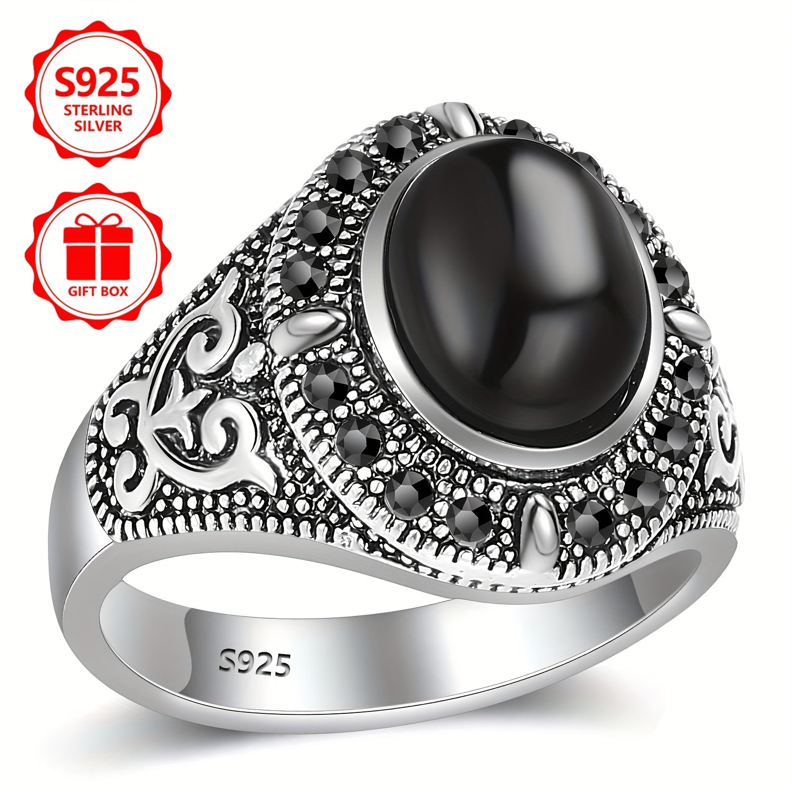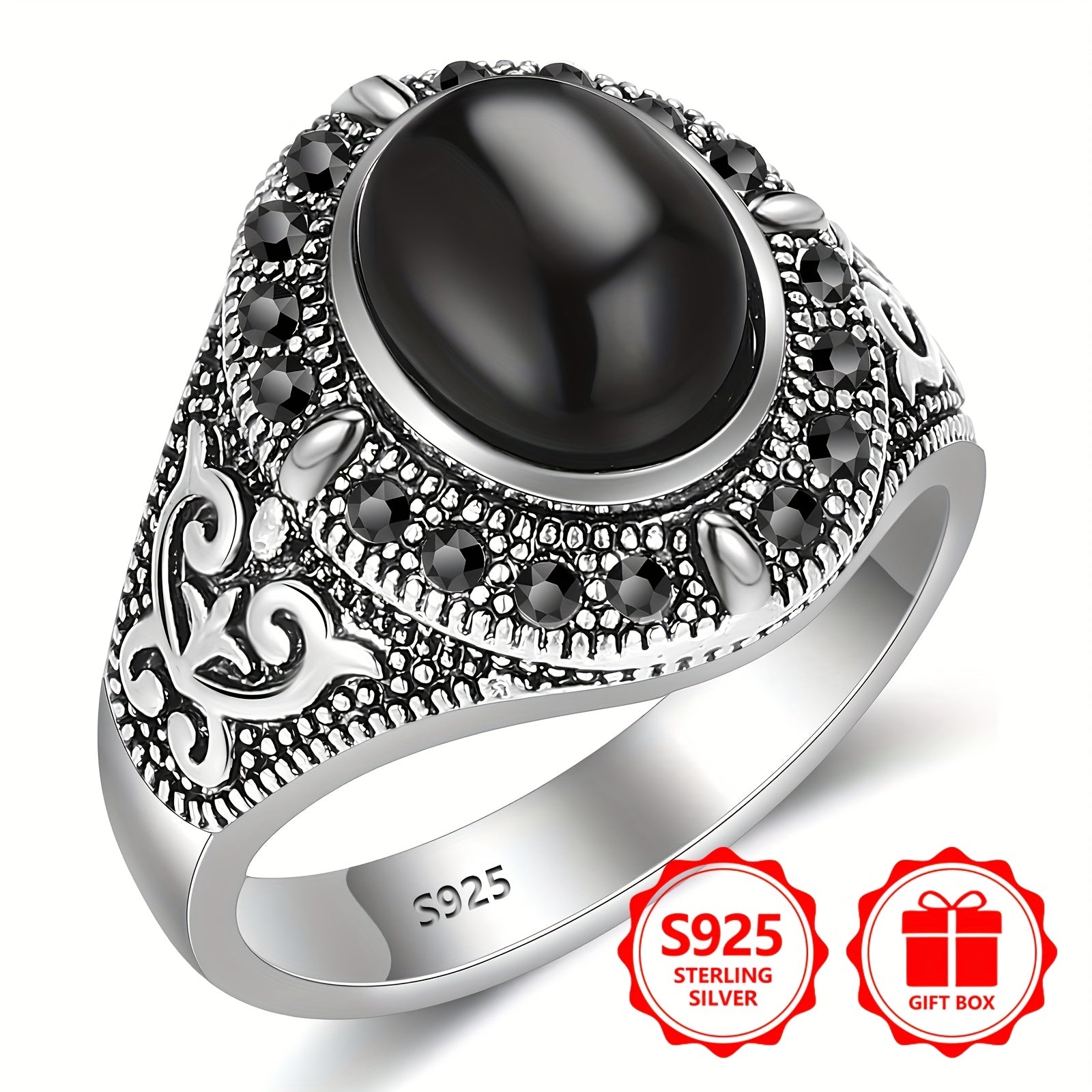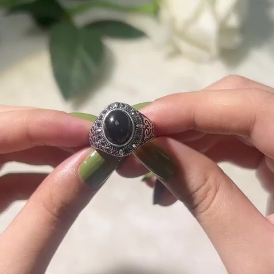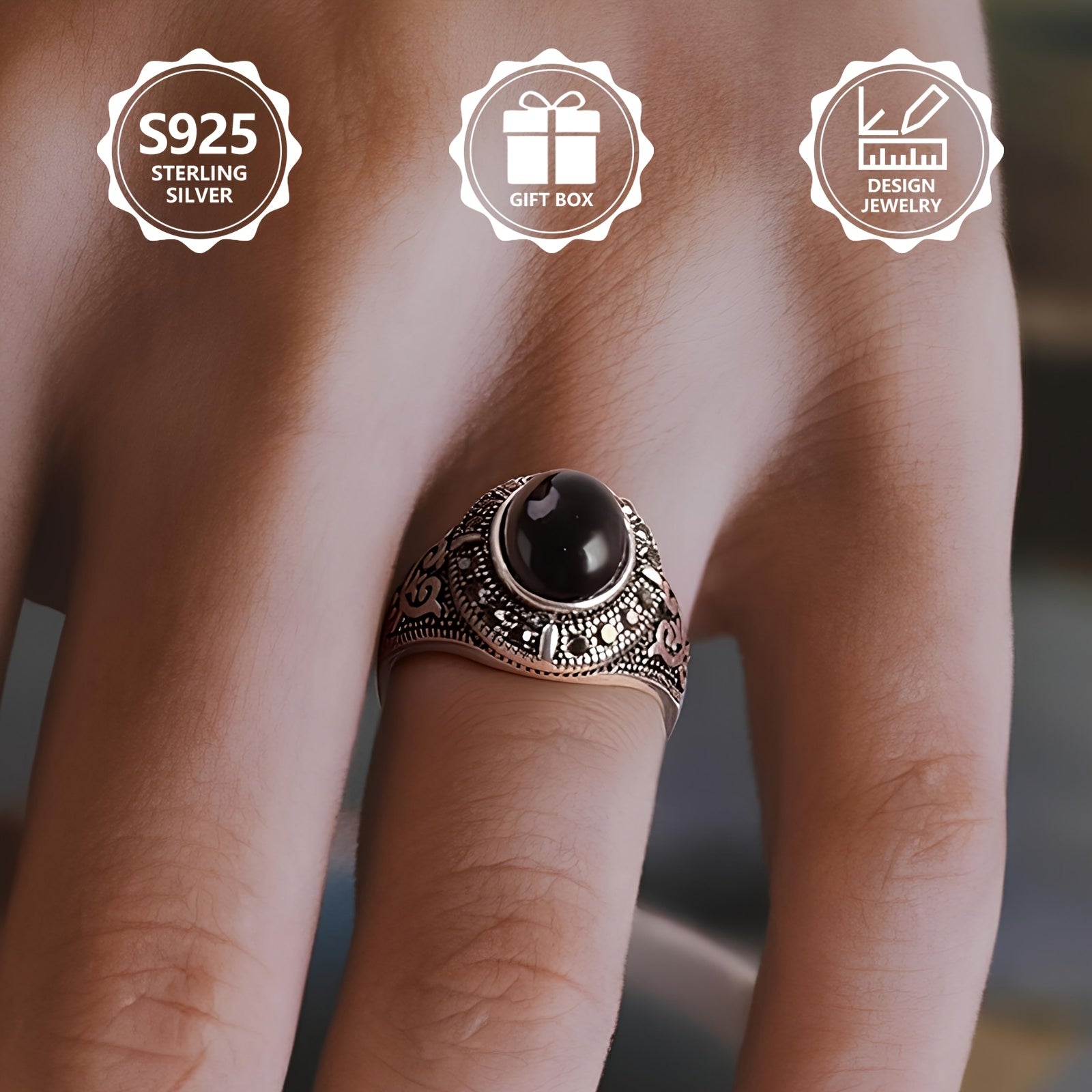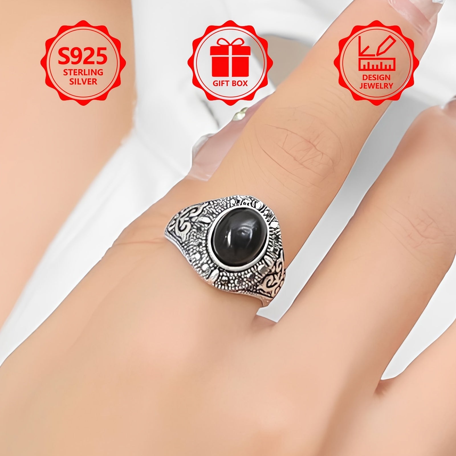 This vintage ring features a heart carved pattern with high-quality S925 silver, agate, and zirconia stones. Suitable for both men and women.