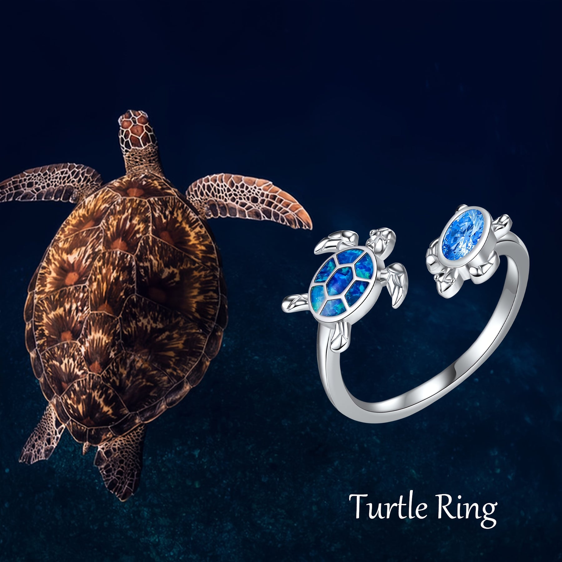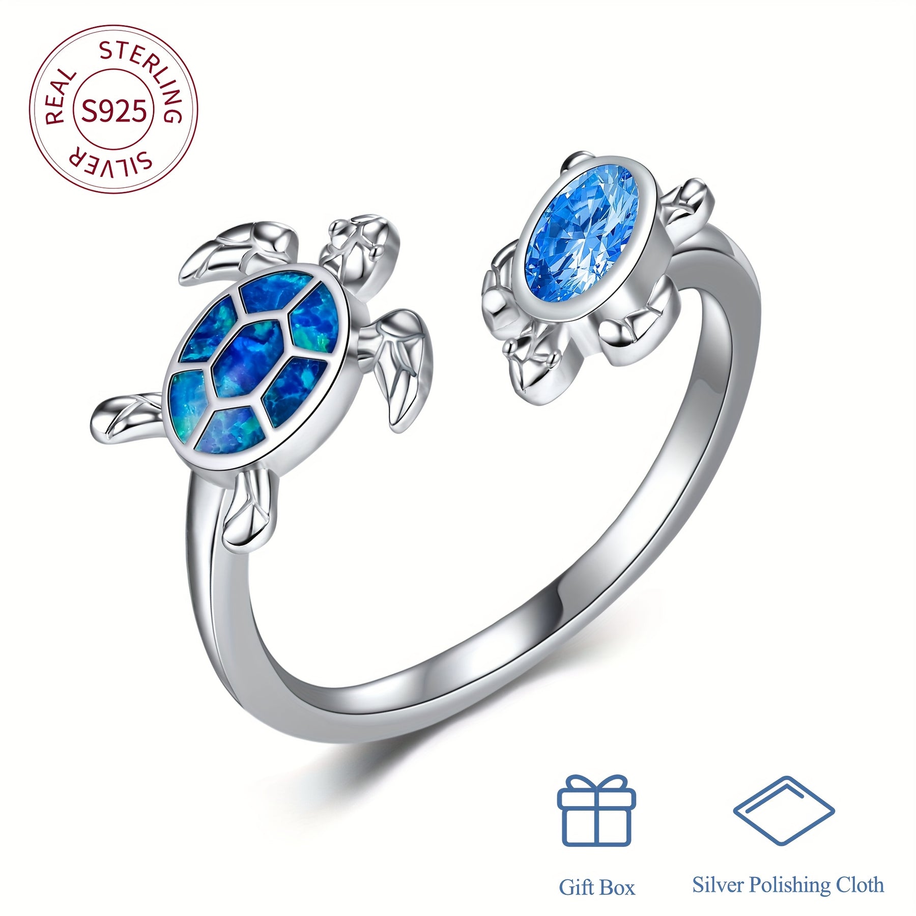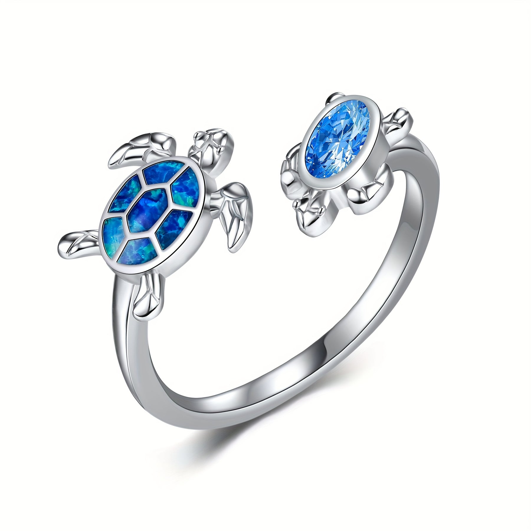 This stunning Sea Turtle Ring is crafted in 925 sterling silver with a synthetic opal setting. A perfect gift for sea turtle and ocean enthusiasts, this adjustable ring is a beautiful piece of sea turtle jewelry.