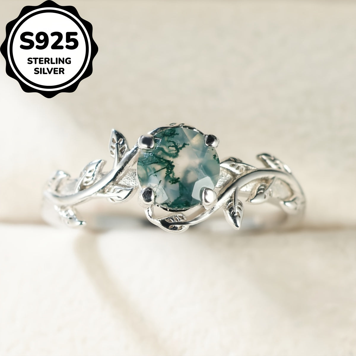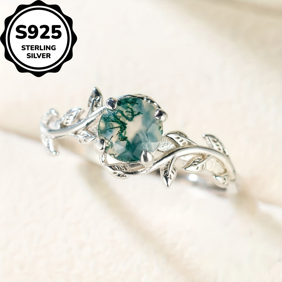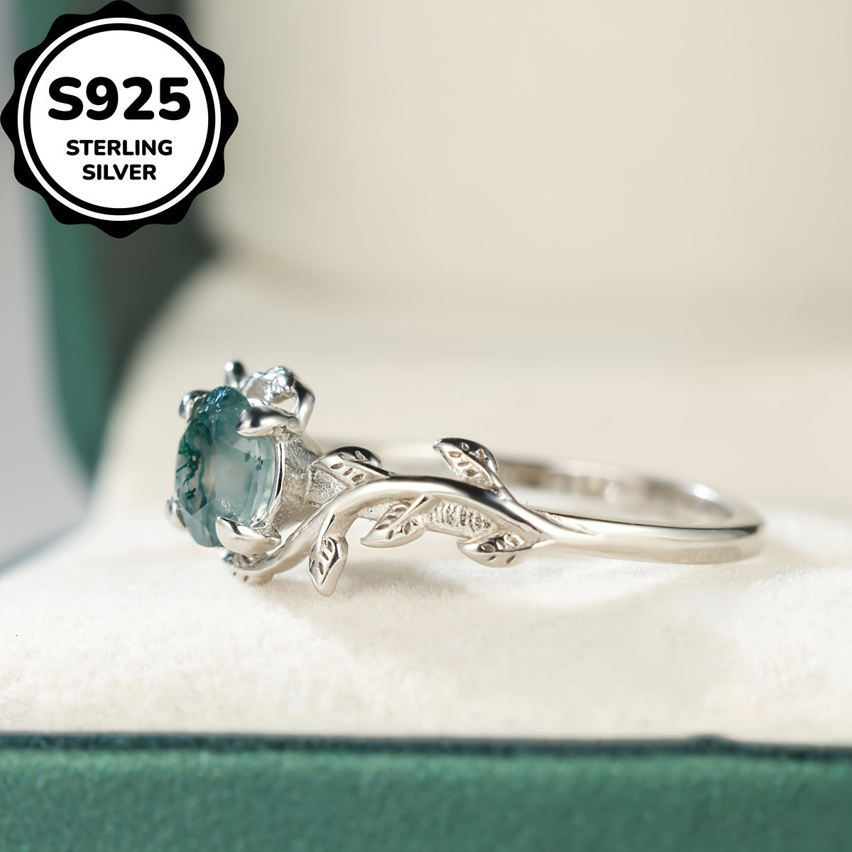 This beautiful ring features a natural water grass agate stone set in a retro round design with a leaf edge. Perfect for daily wear or as a gift.