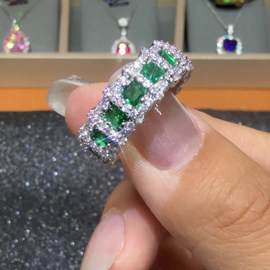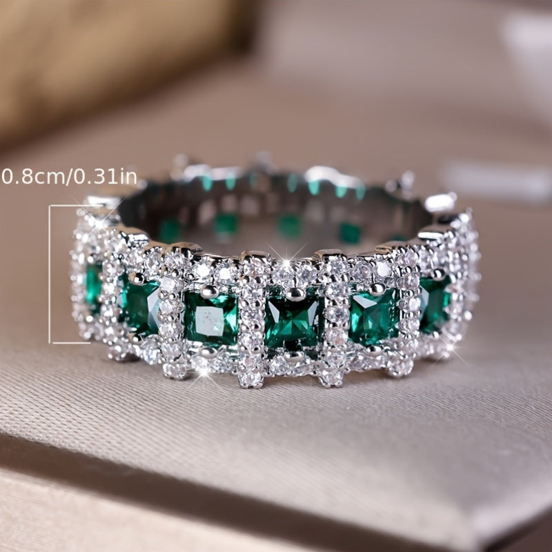 This stunning vintage boho style eternity band ring features green zirconia stones set in copper. Perfect for weddings, engagements, banquets, and other special events.