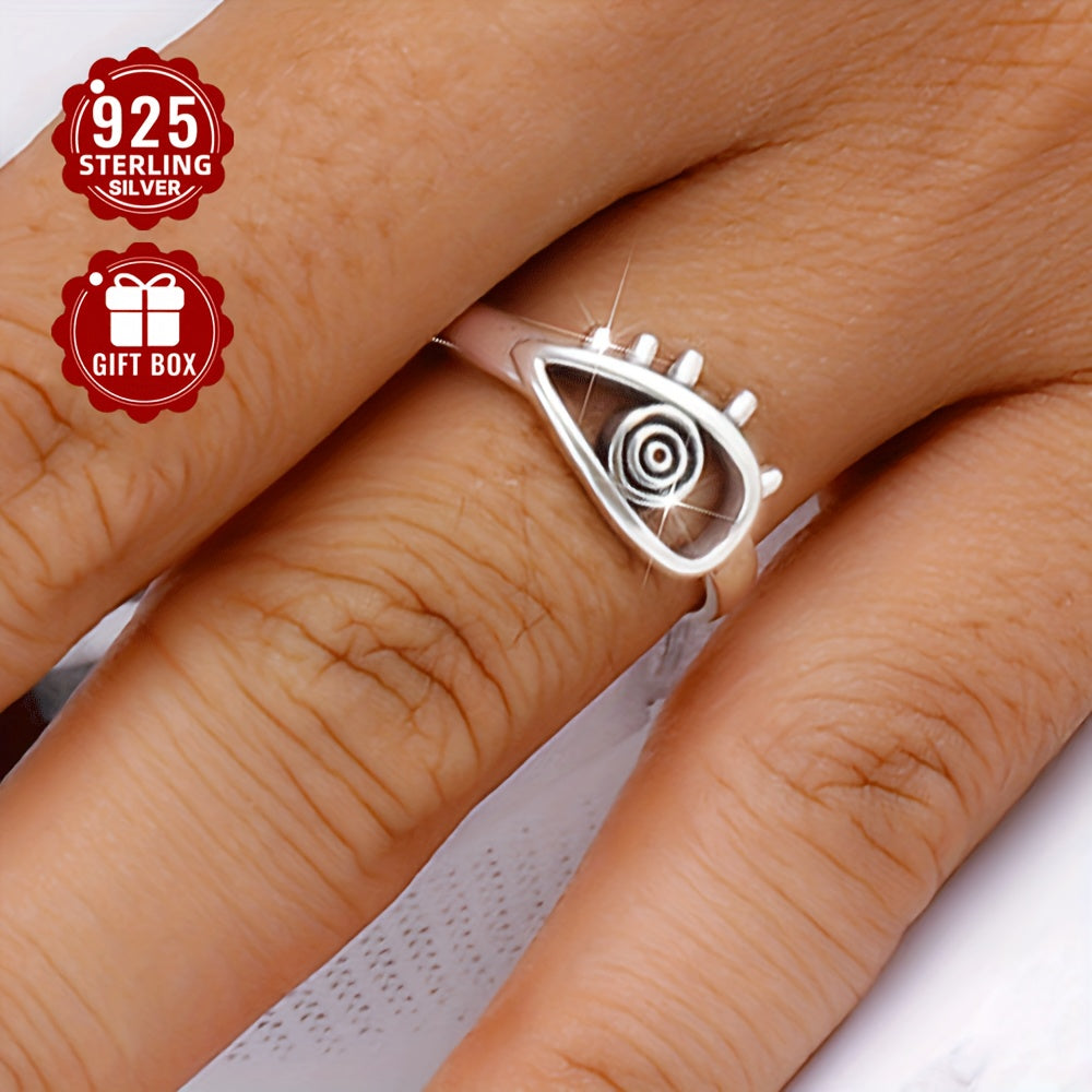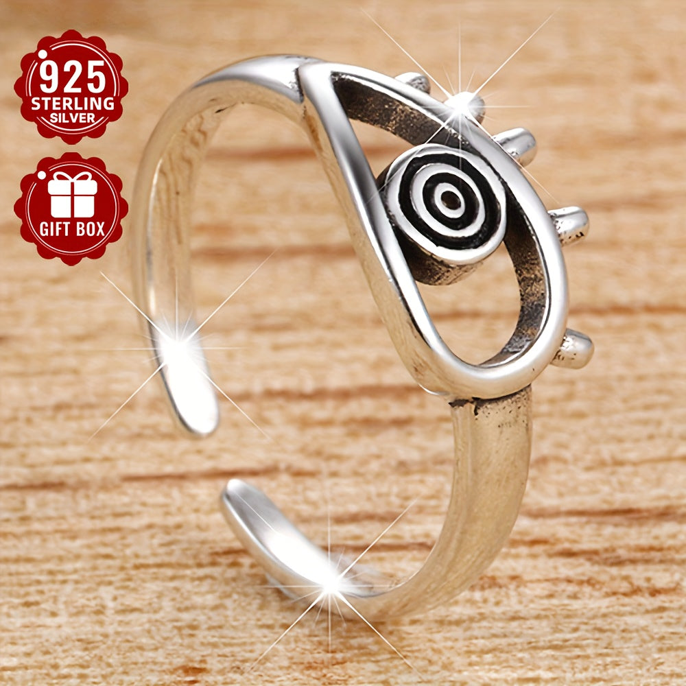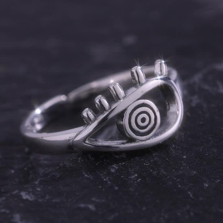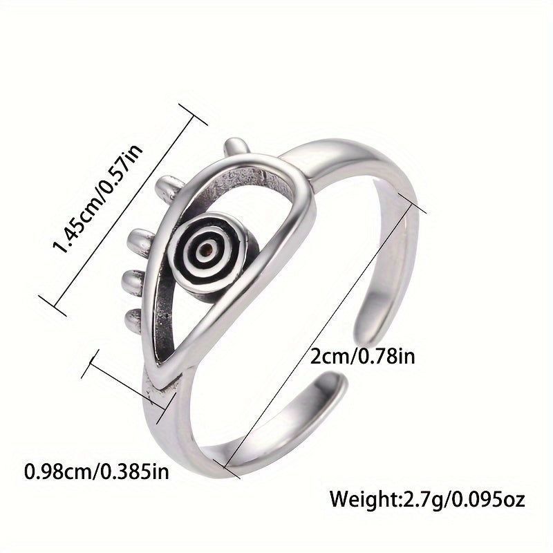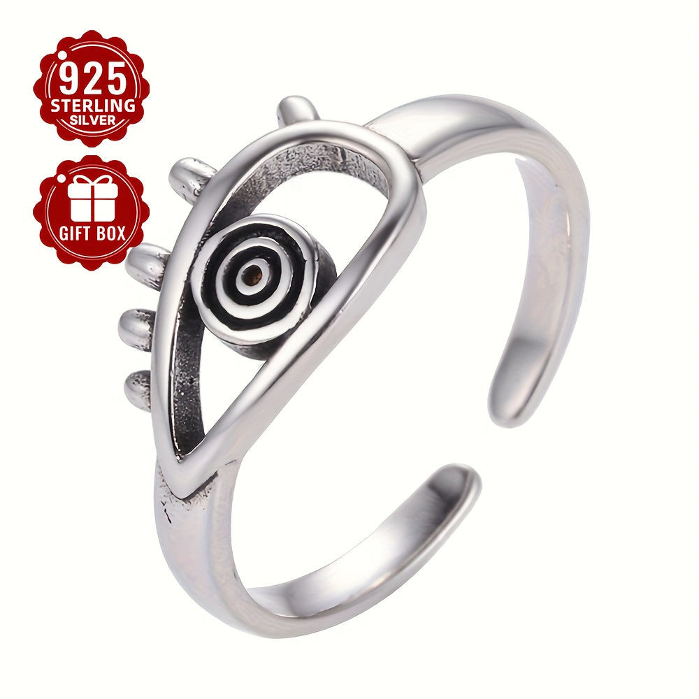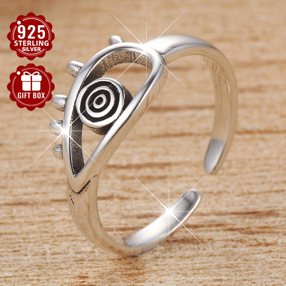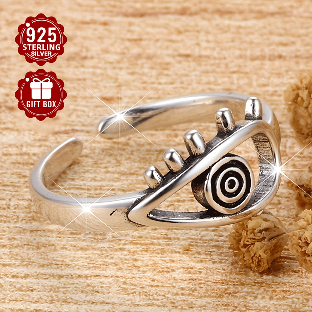 This adjustable wide band ring features an evil eye design in a vintage style. Made of 925 silver, it weighs 2.7g and adds a mystical touch to any outfit.