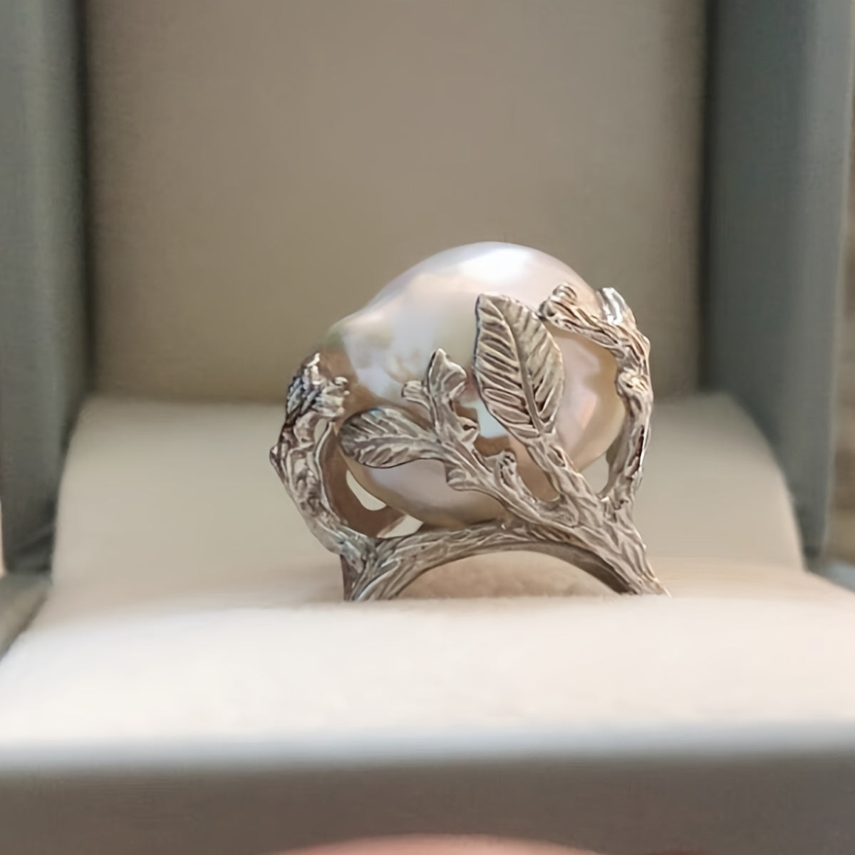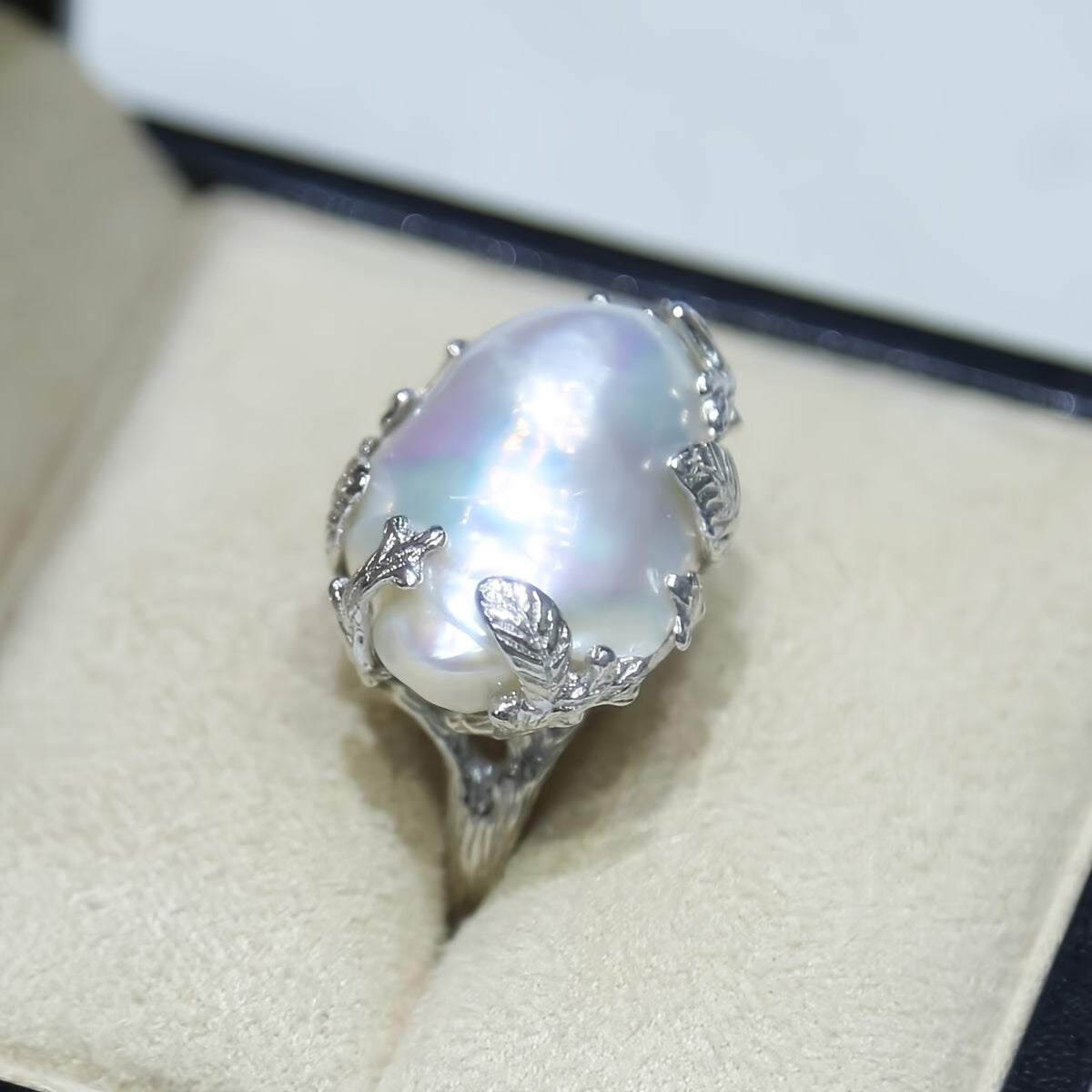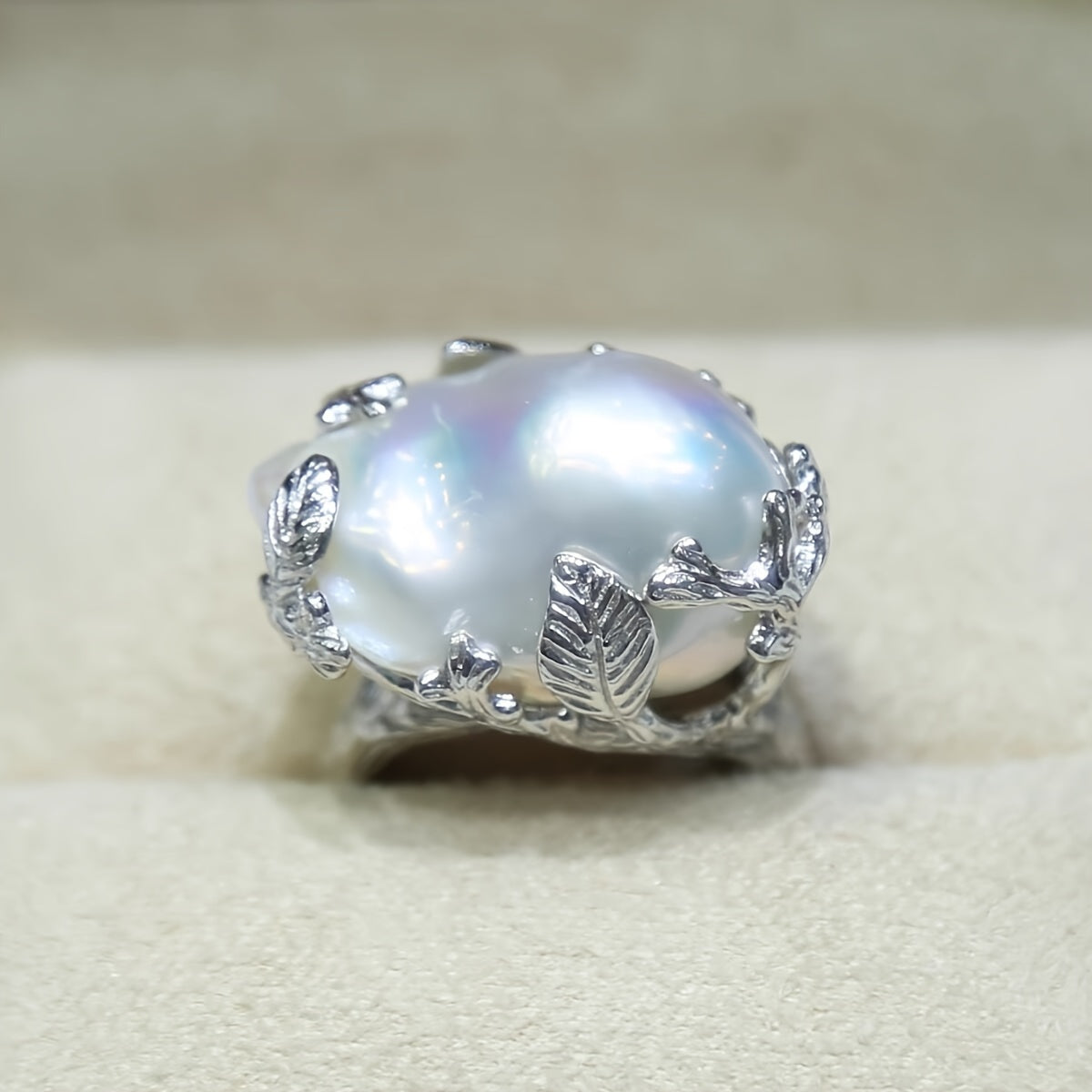 Elegant open ring featuring 20-25mm Aurora freshwater pearl inlaid on a leaf textured band. Perfect for weddings, parties, or as a gift for brides.