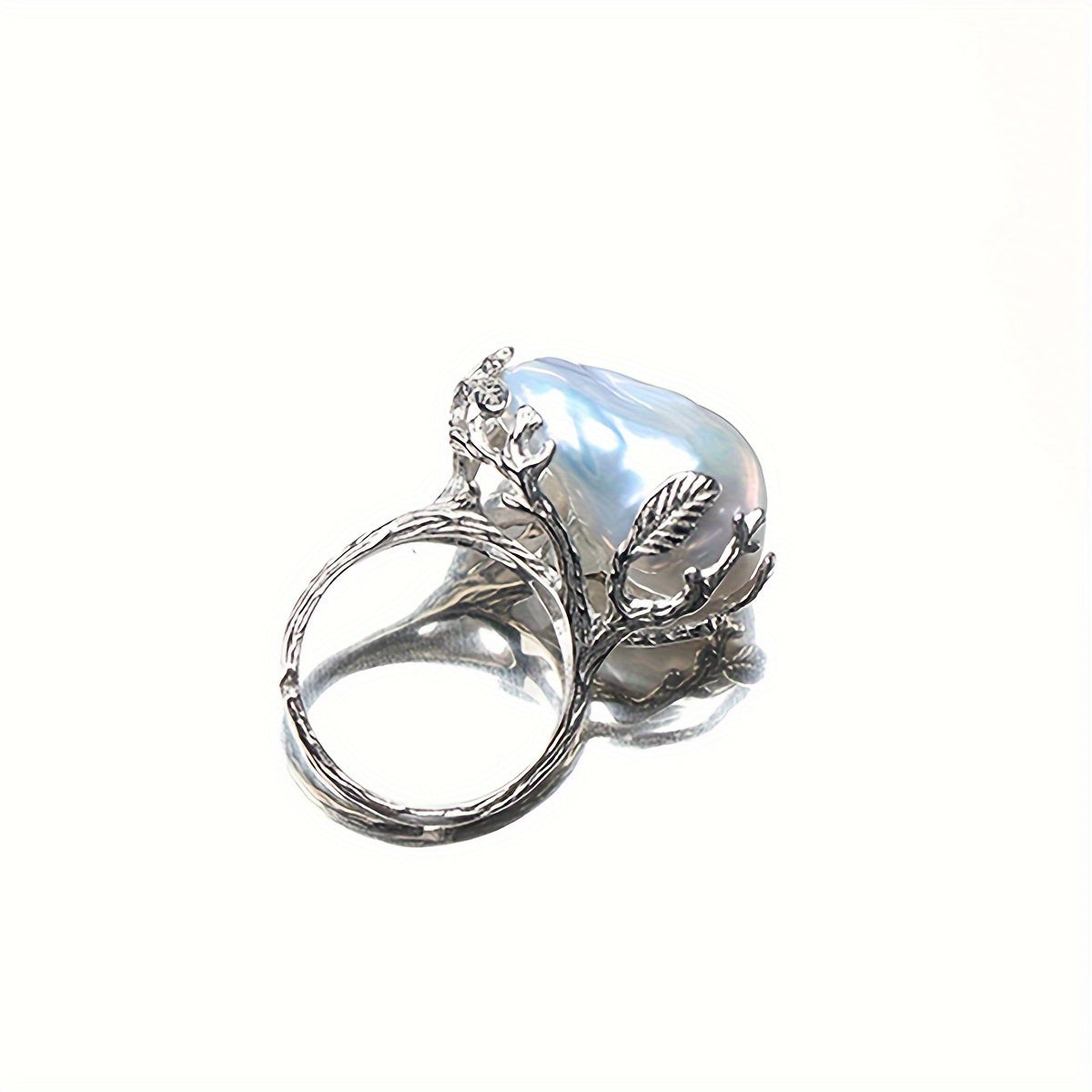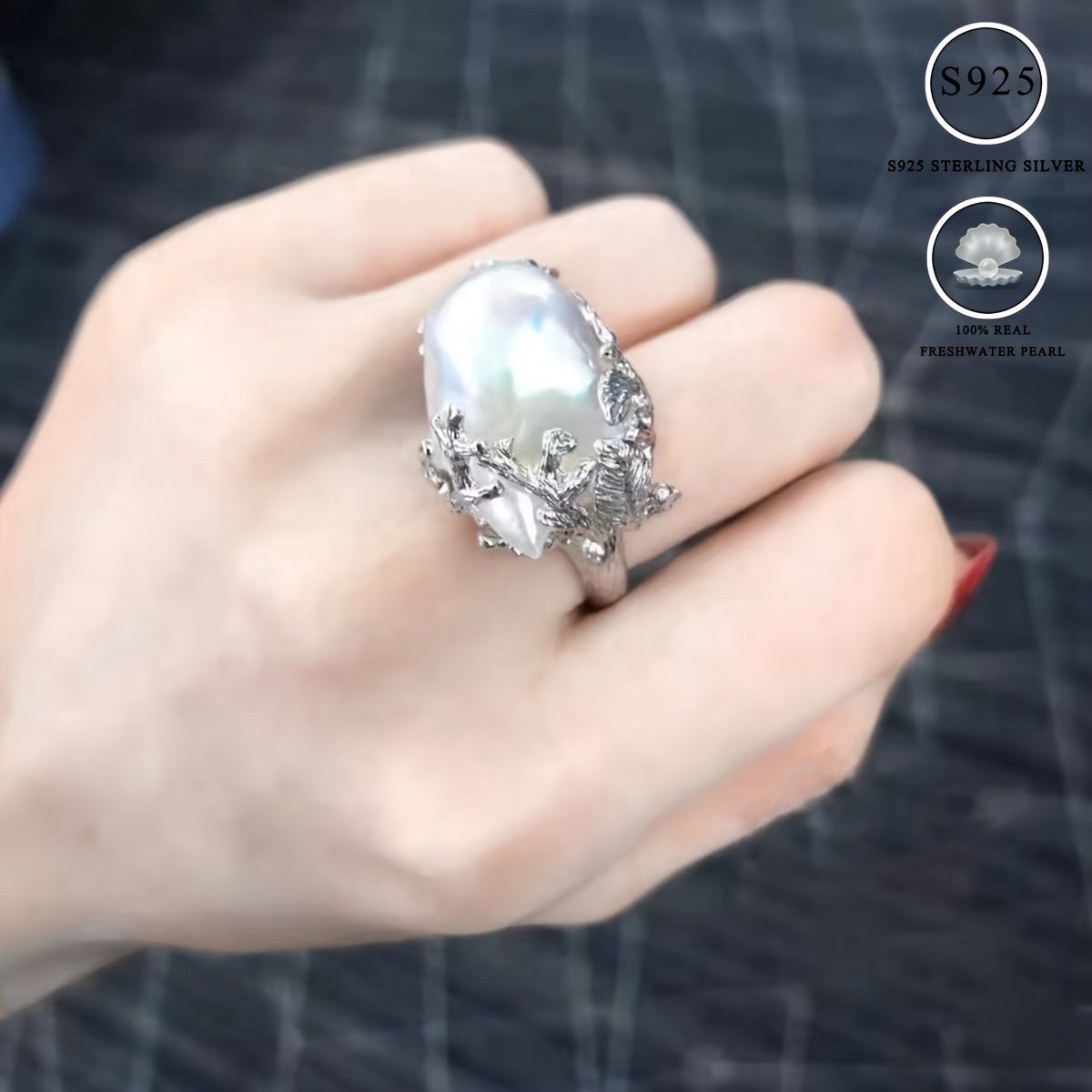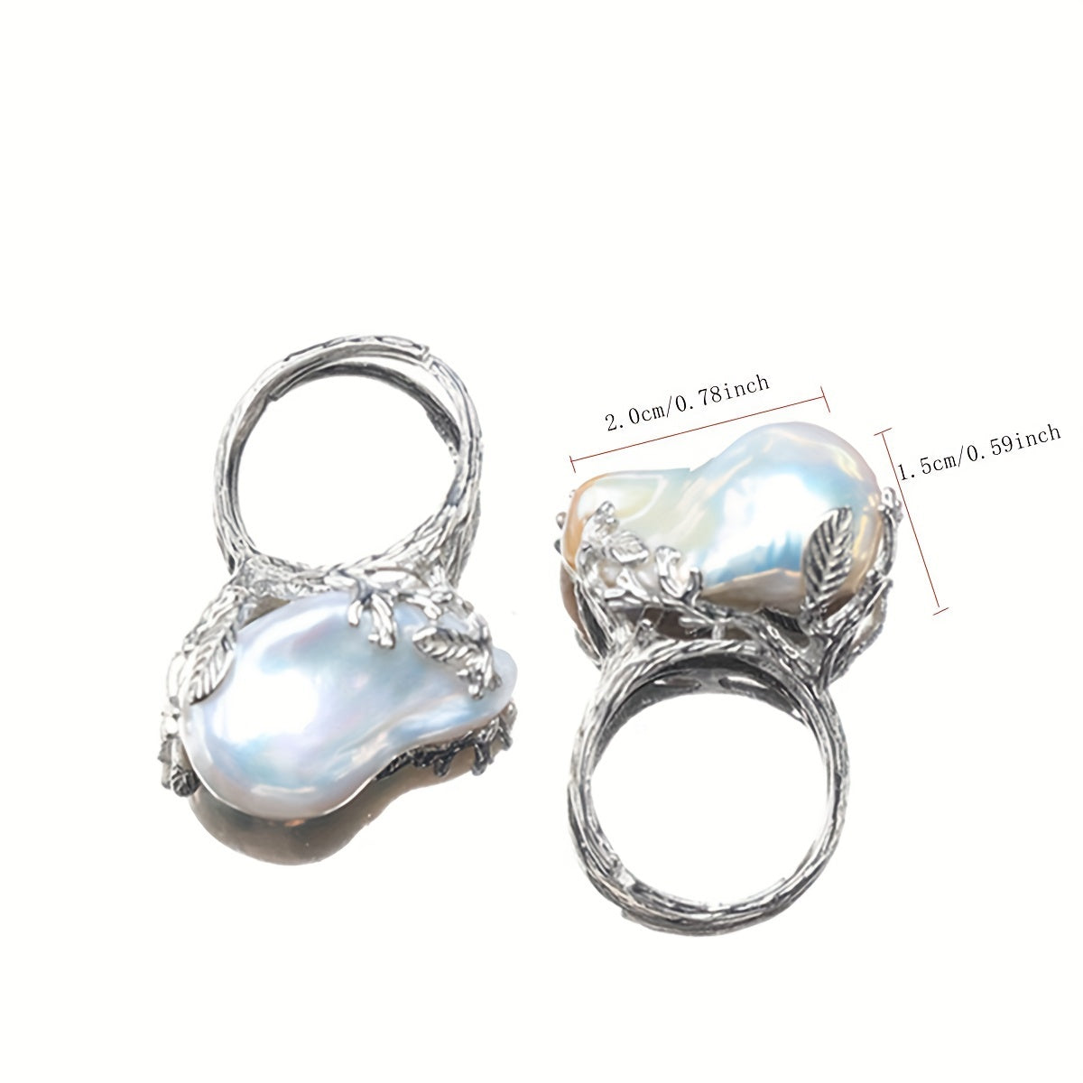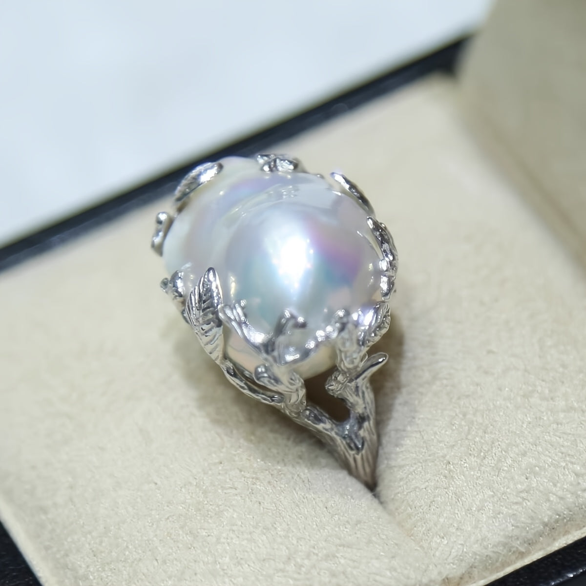 Elegant open ring featuring 20-25mm Aurora freshwater pearl inlaid on a leaf textured band. Perfect for weddings, parties, or as a gift for brides.