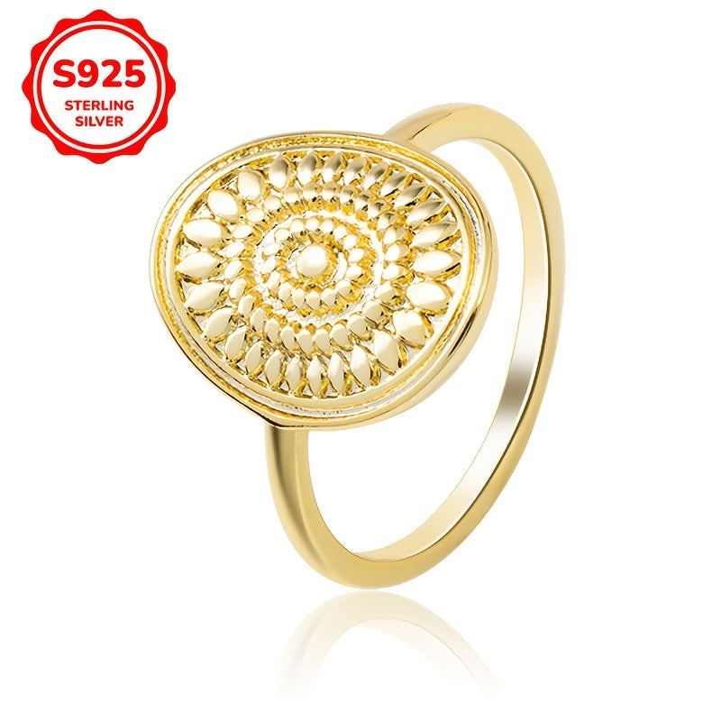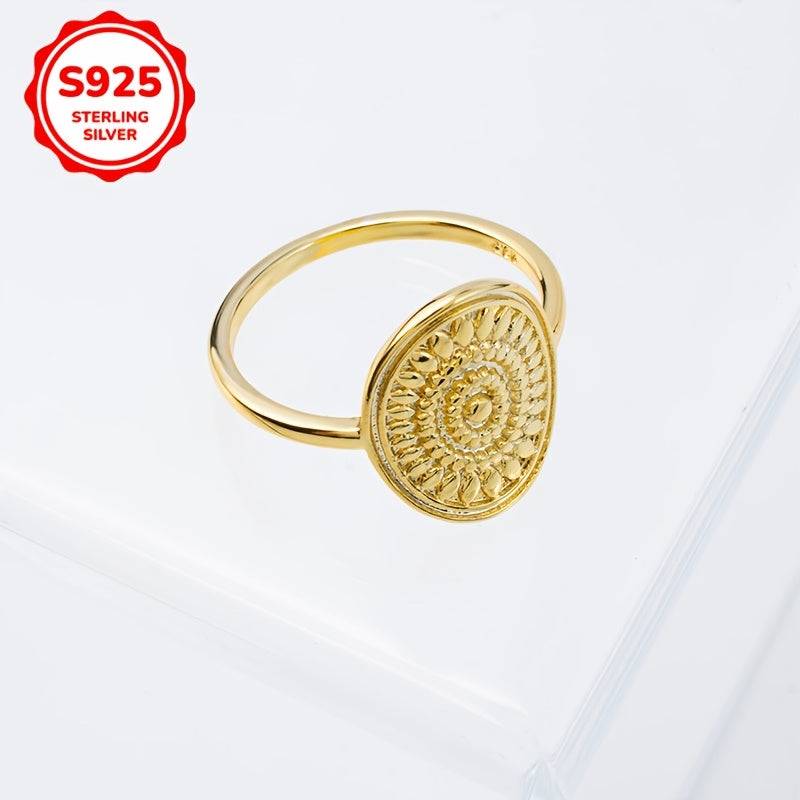 Add a touch of elegance with this vintage style S925 sterling silver ring featuring a sunflower embossed oval design. Lightweight and suitable for daily and vacation wear in all seasons.