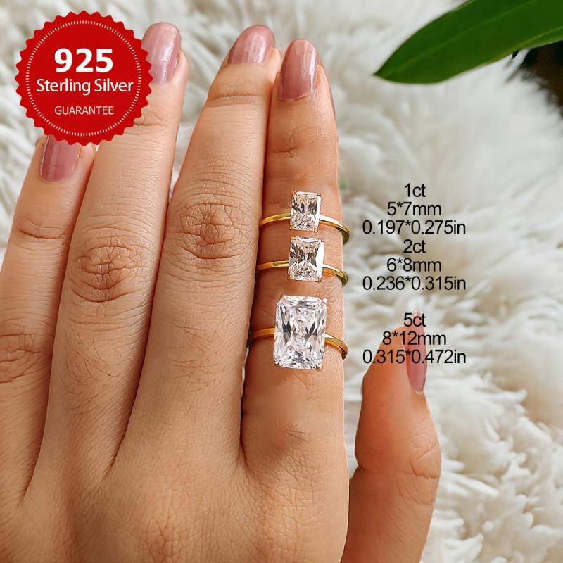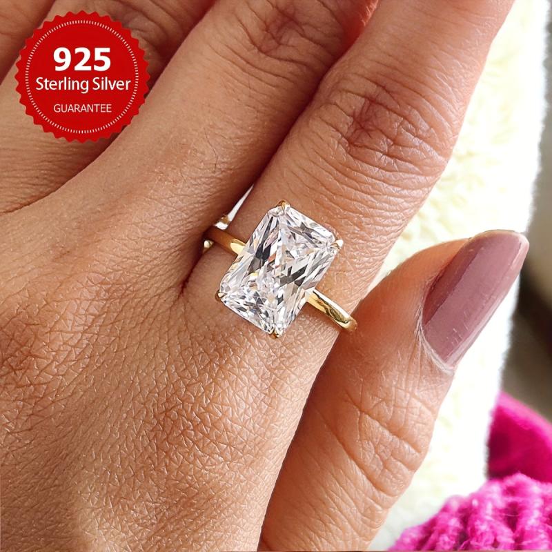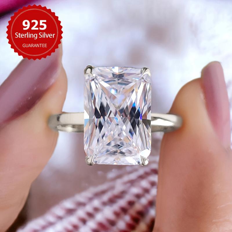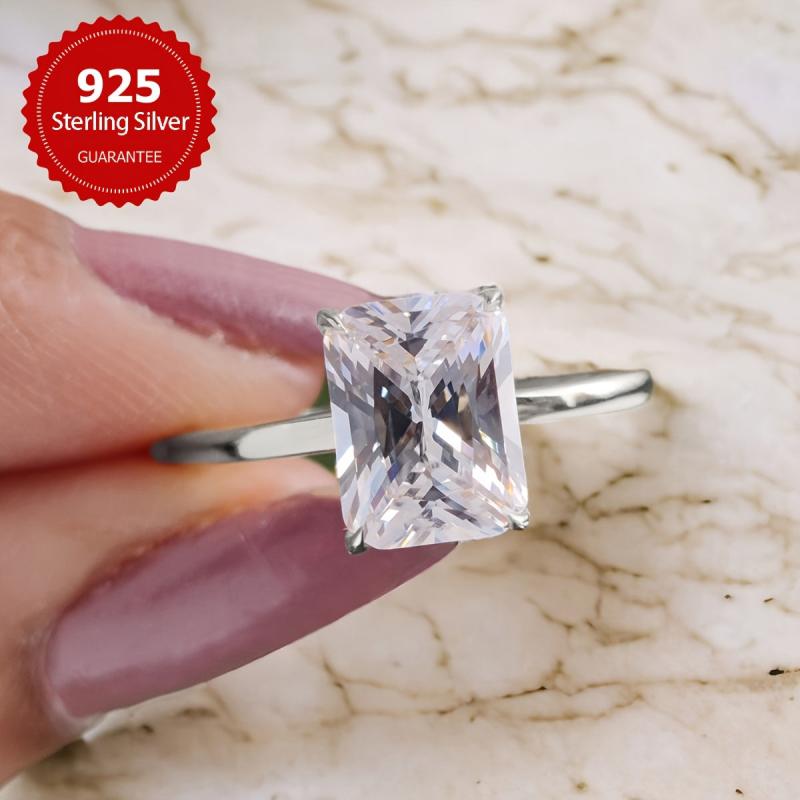 Women's Rectangular Single Stone Engagement Ring Platinum Plated 925 Silver