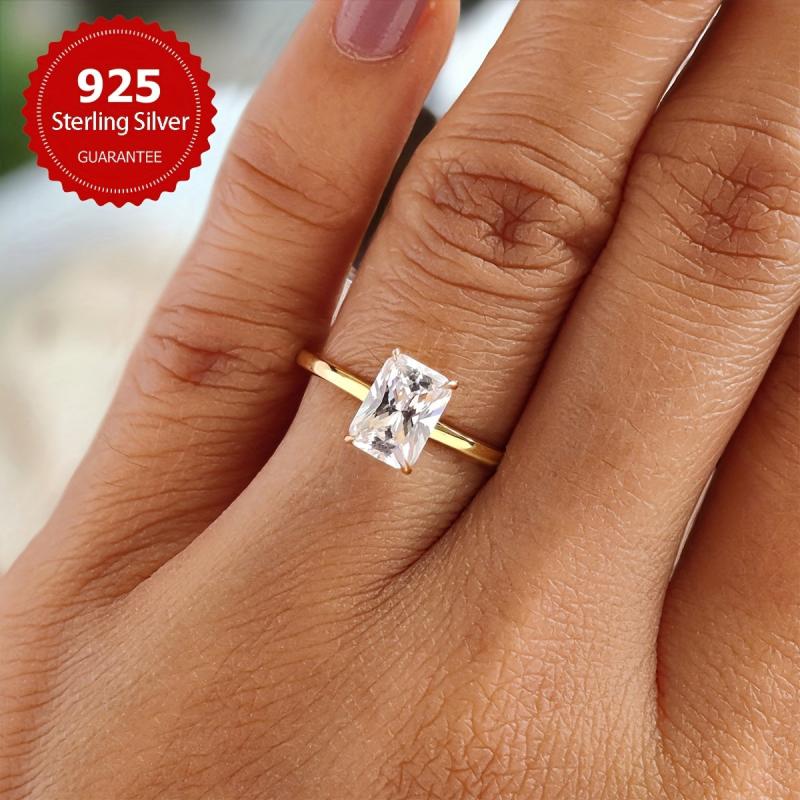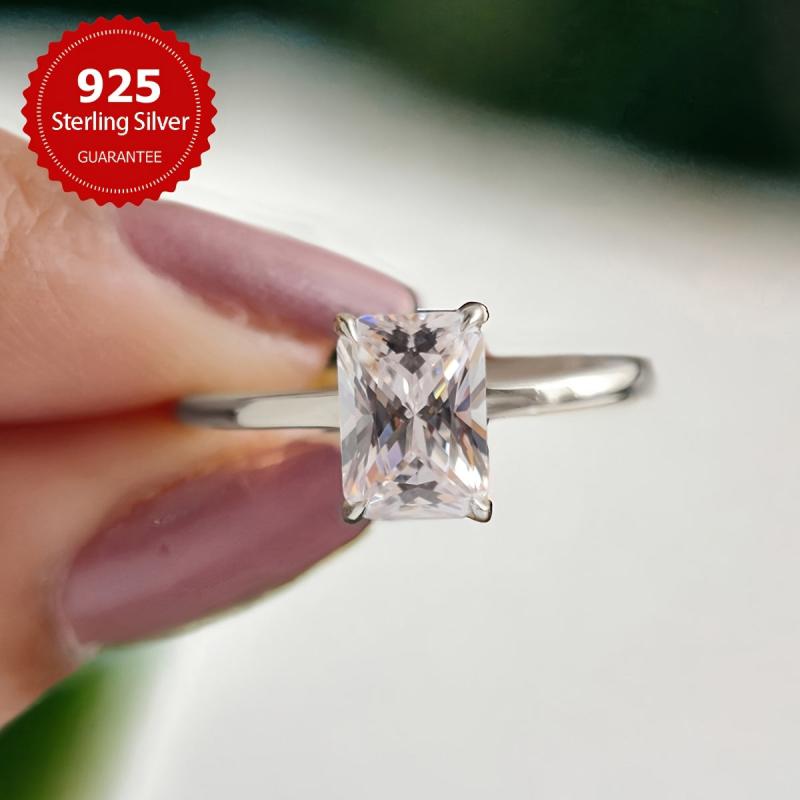 Elegant women's engagement ring featuring a single rectangular synthetic zircon stone set in platinum plated 925 silver. Perfect for all seasons and as a gift with its noble symbolism.
