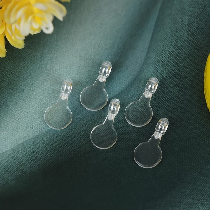 These transparent flat round convex hooks are perfect for creating jewelry, shoes, and watches. They have a strong adhesive backing for easy application.