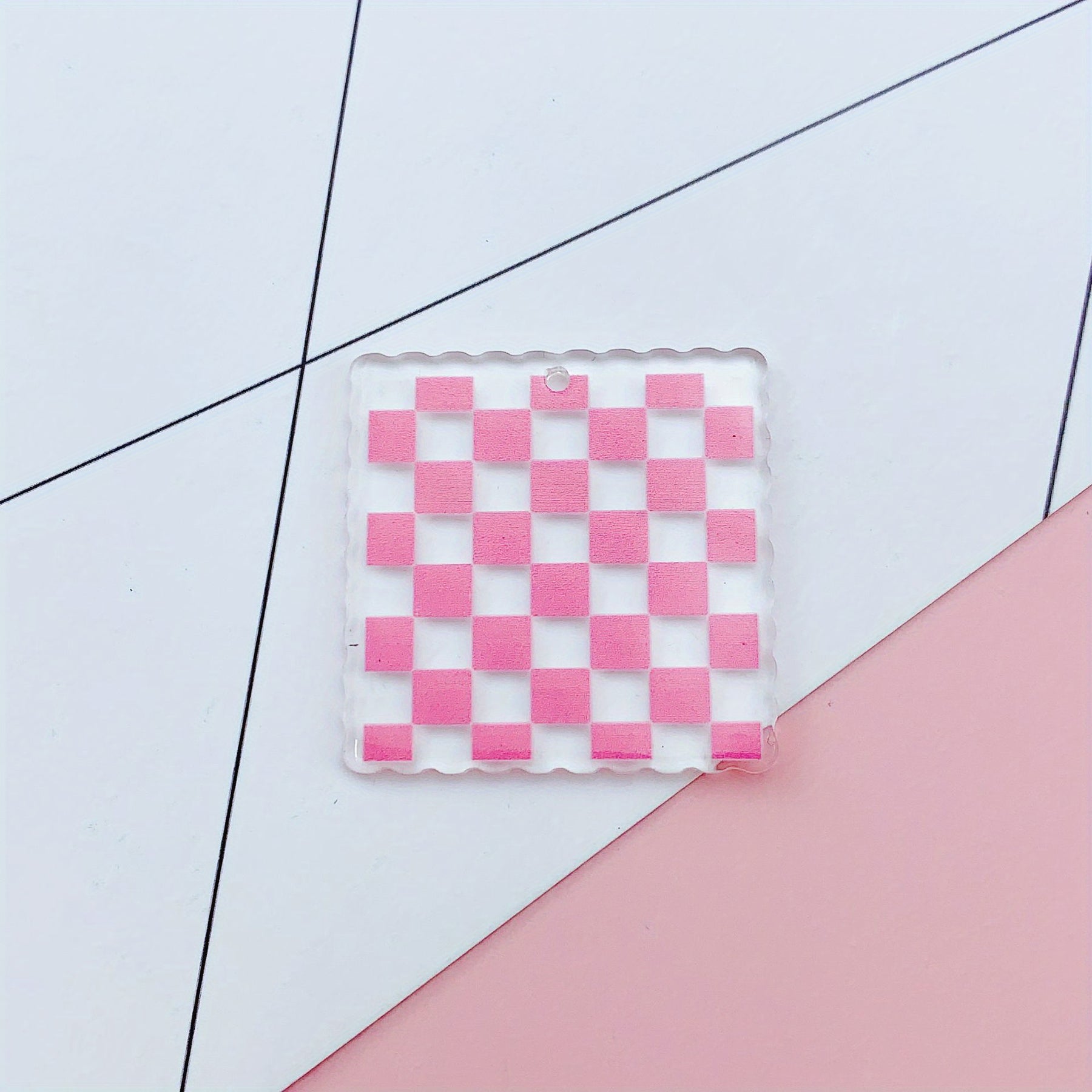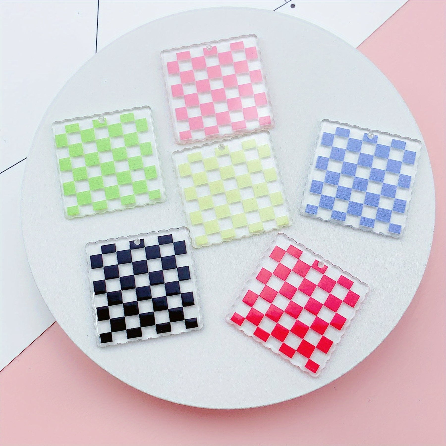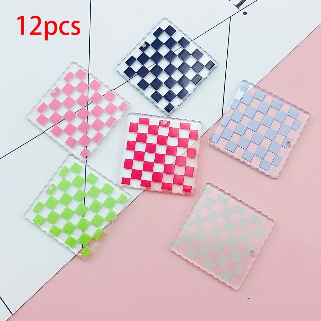 Create unique crafts with these 12 clear checkerboard square charms featuring pink, green, and red patterns. Perfect for DIY projects.