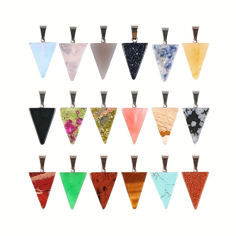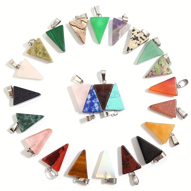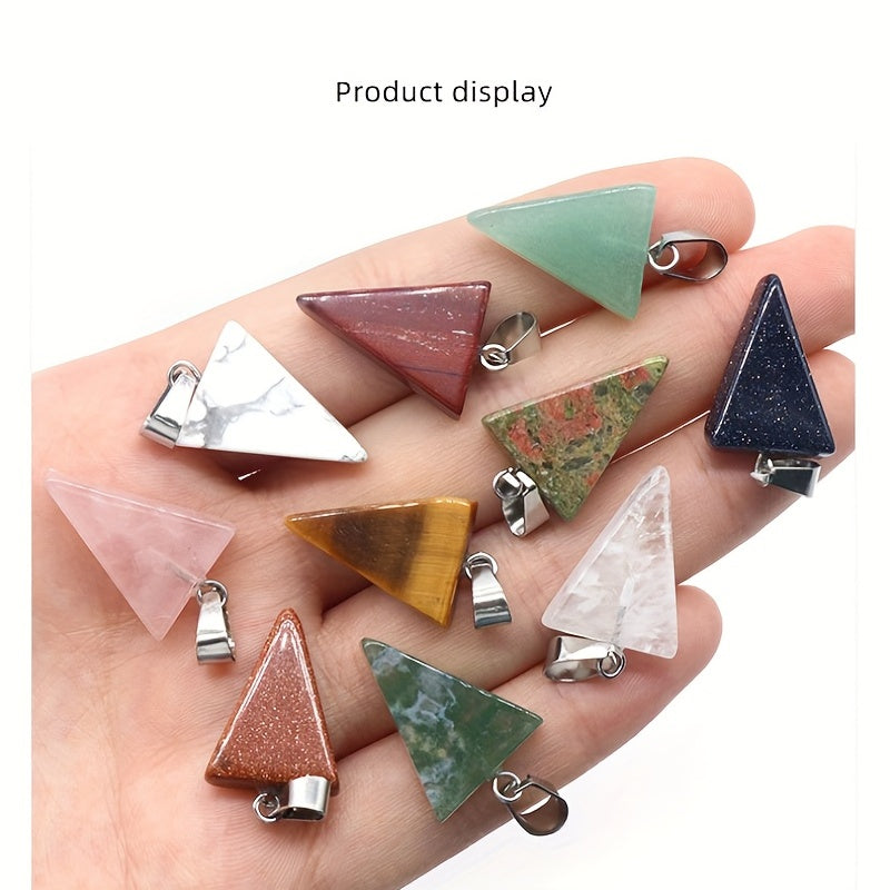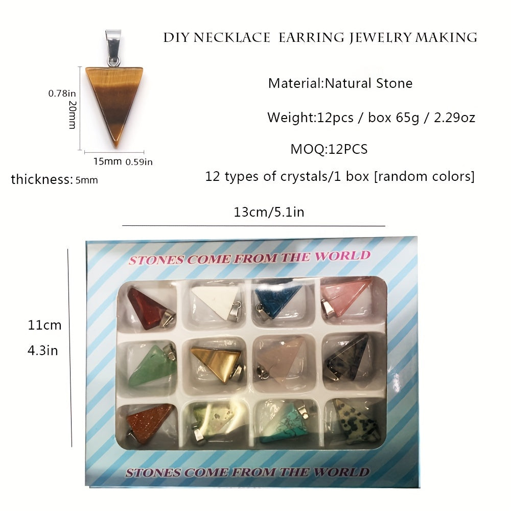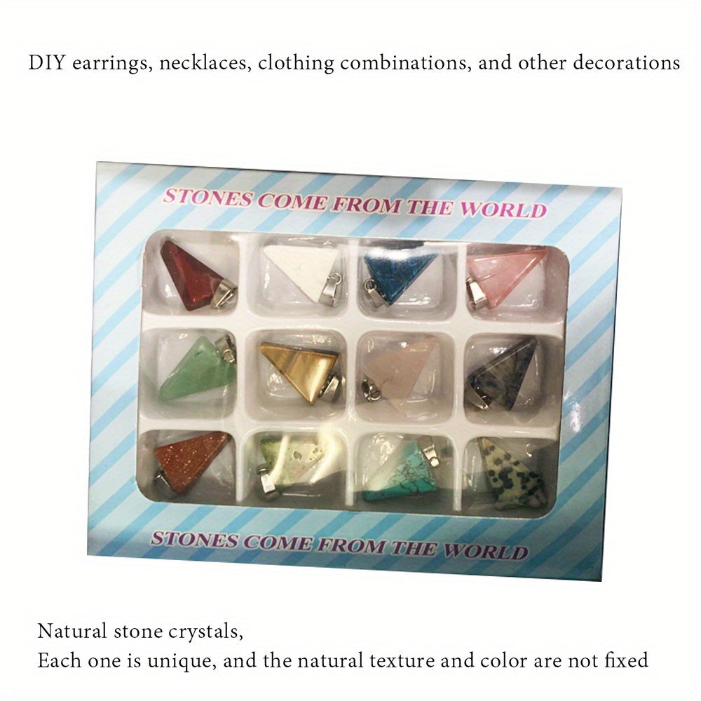 Enhance your jewelry-making projects with these 12 colorful natural stone triangle shape pendants. Made of crystal quartz stone, these pendants are perfect for creating unique earrings and necklaces.