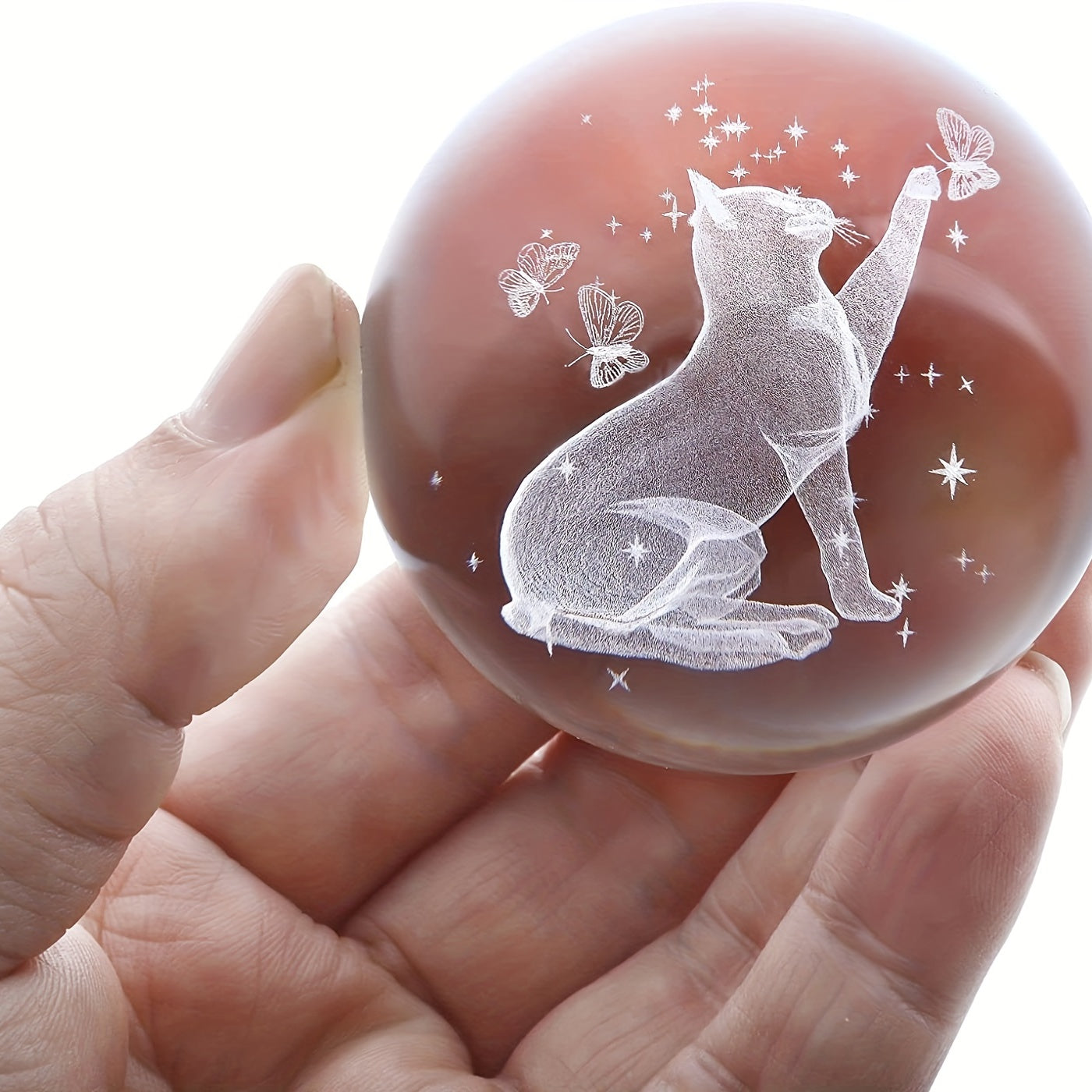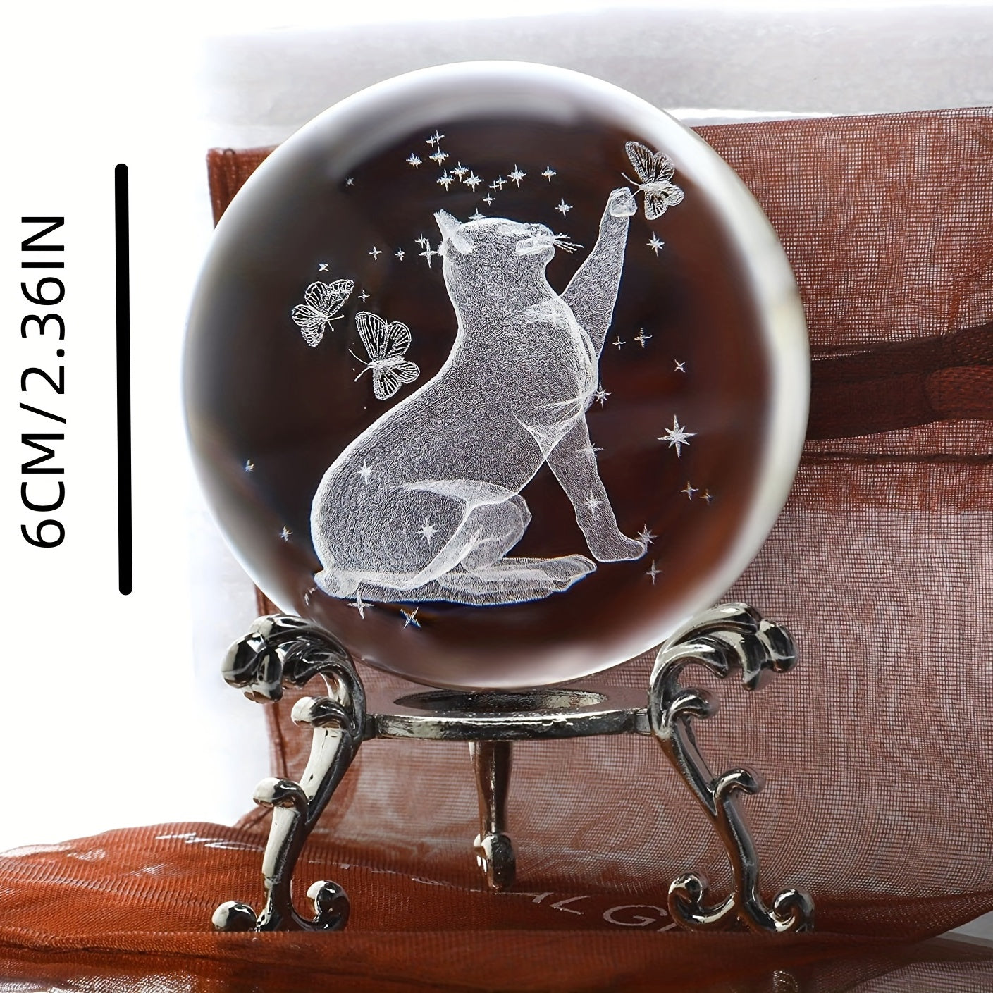 This beautiful 3D laser crystal ball features a cat and butterfly design. Perfect for home decor or as a unique gift. Size: 60mm (2.4 inches).