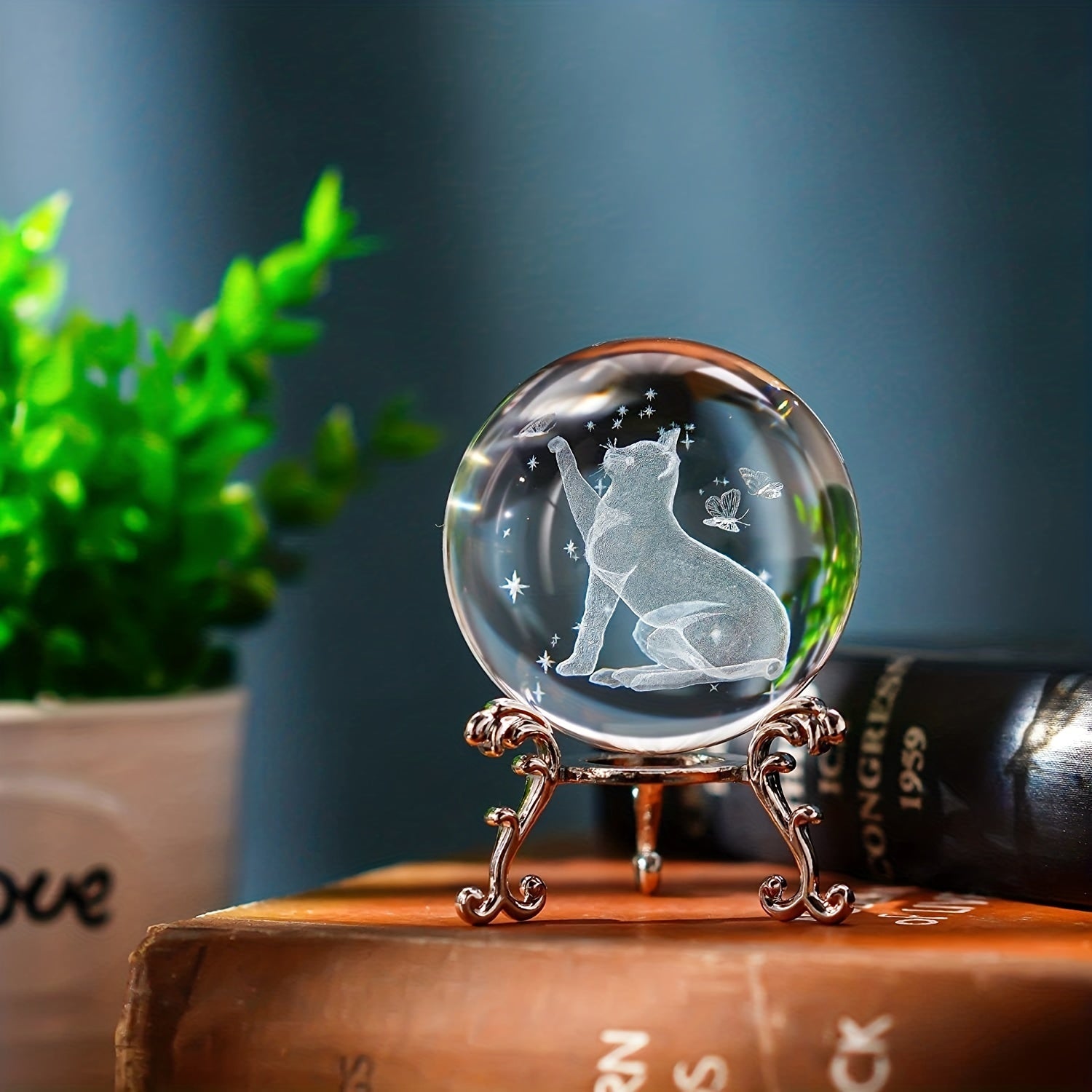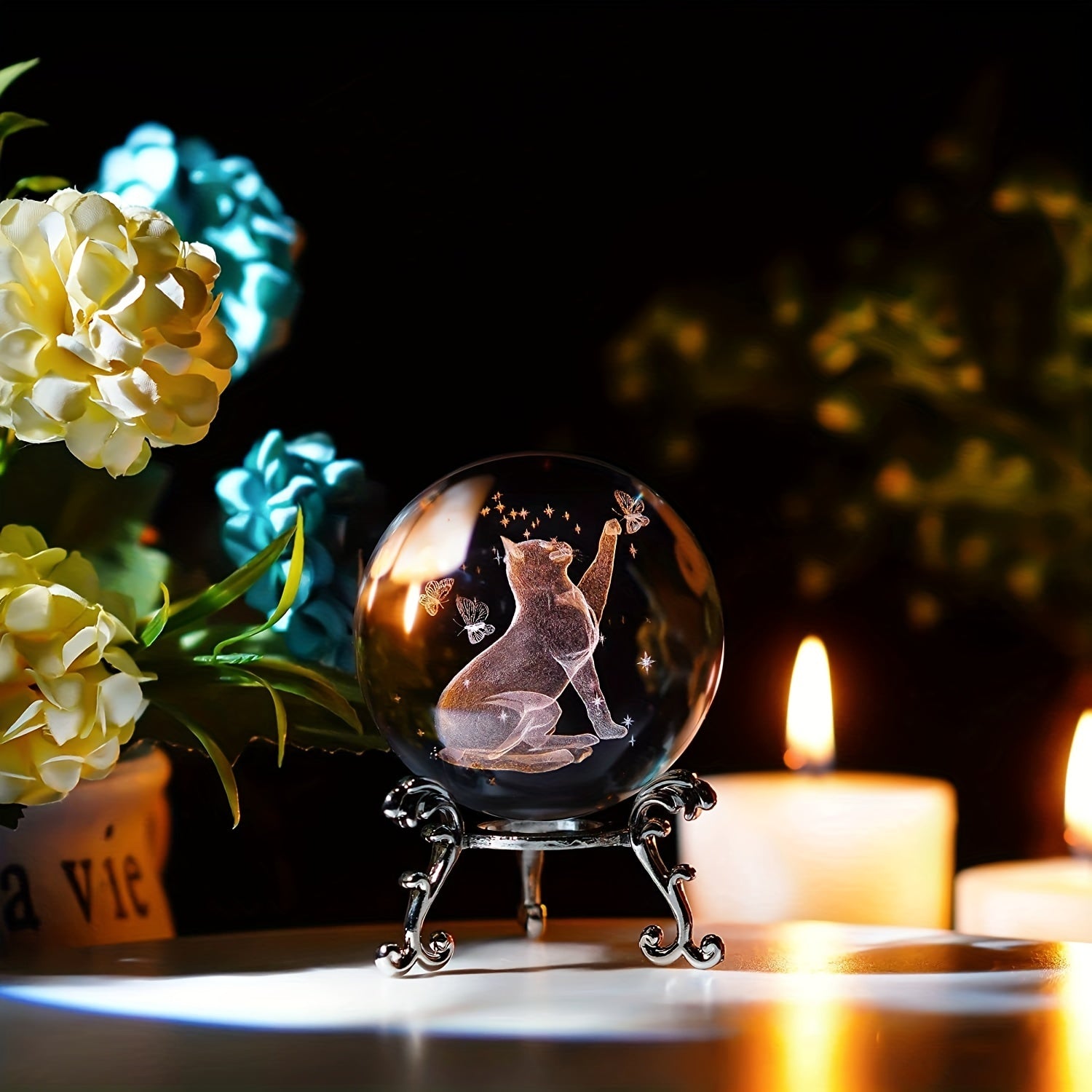 3D Laser Cat & Butterfly Statue Crystal Ball Decorative Home Decor Gift 60mm