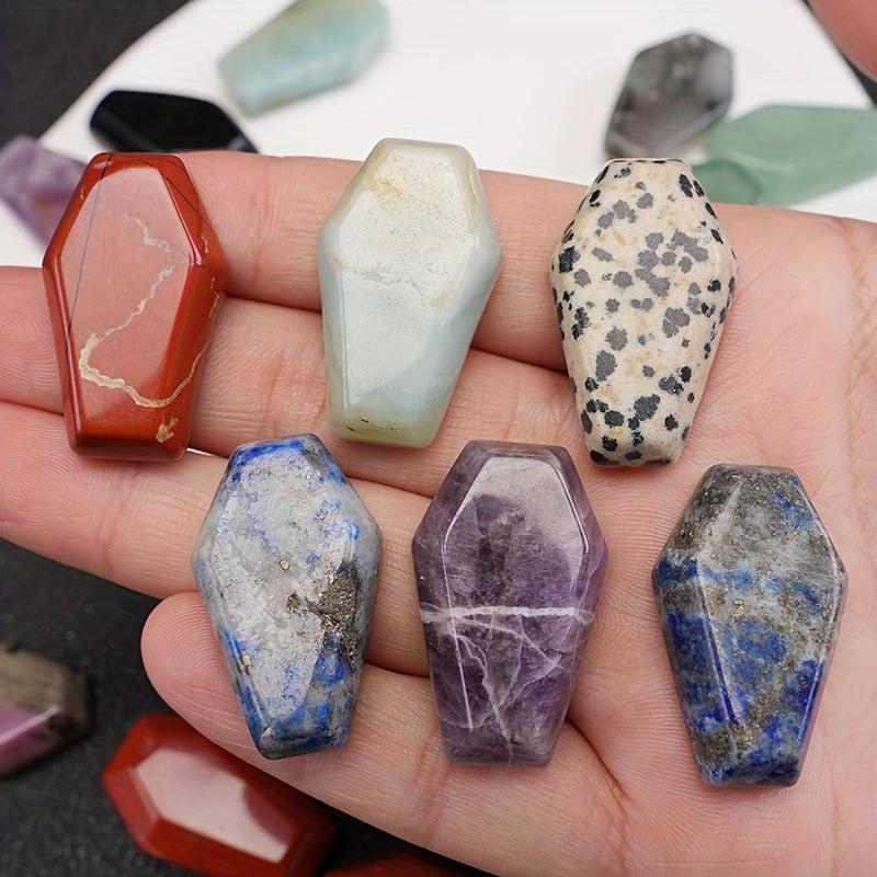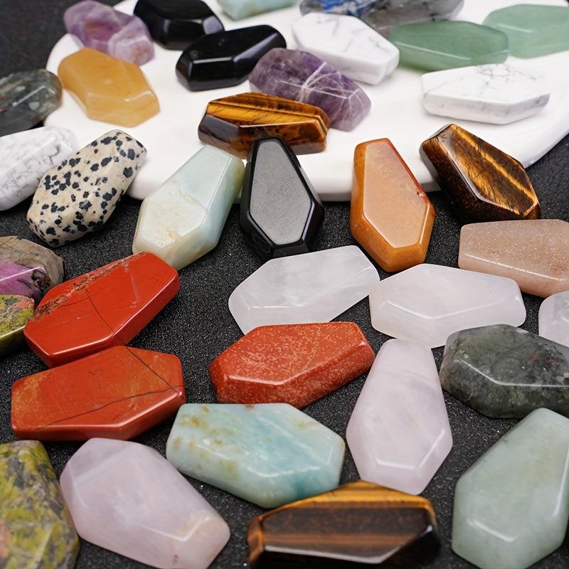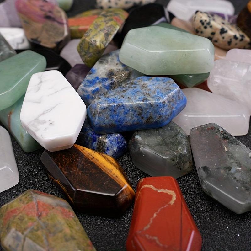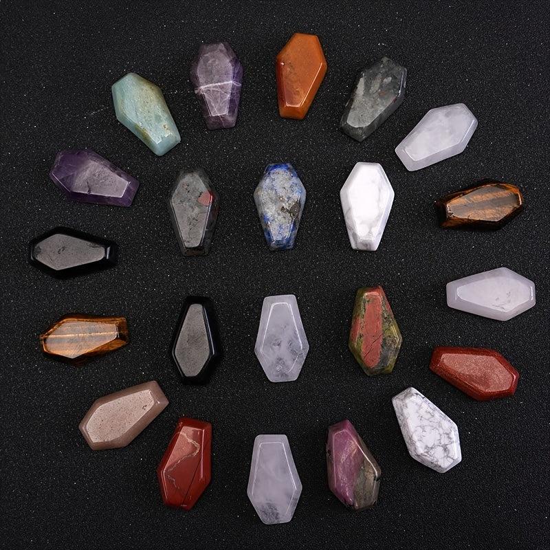 Add a touch of bohemian style to your home decor with these 3pcs coffin-shaped bookends made of smooth decorative stones in earthy tones. Ideal for Halloween, Thanksgiving, and Christmas.