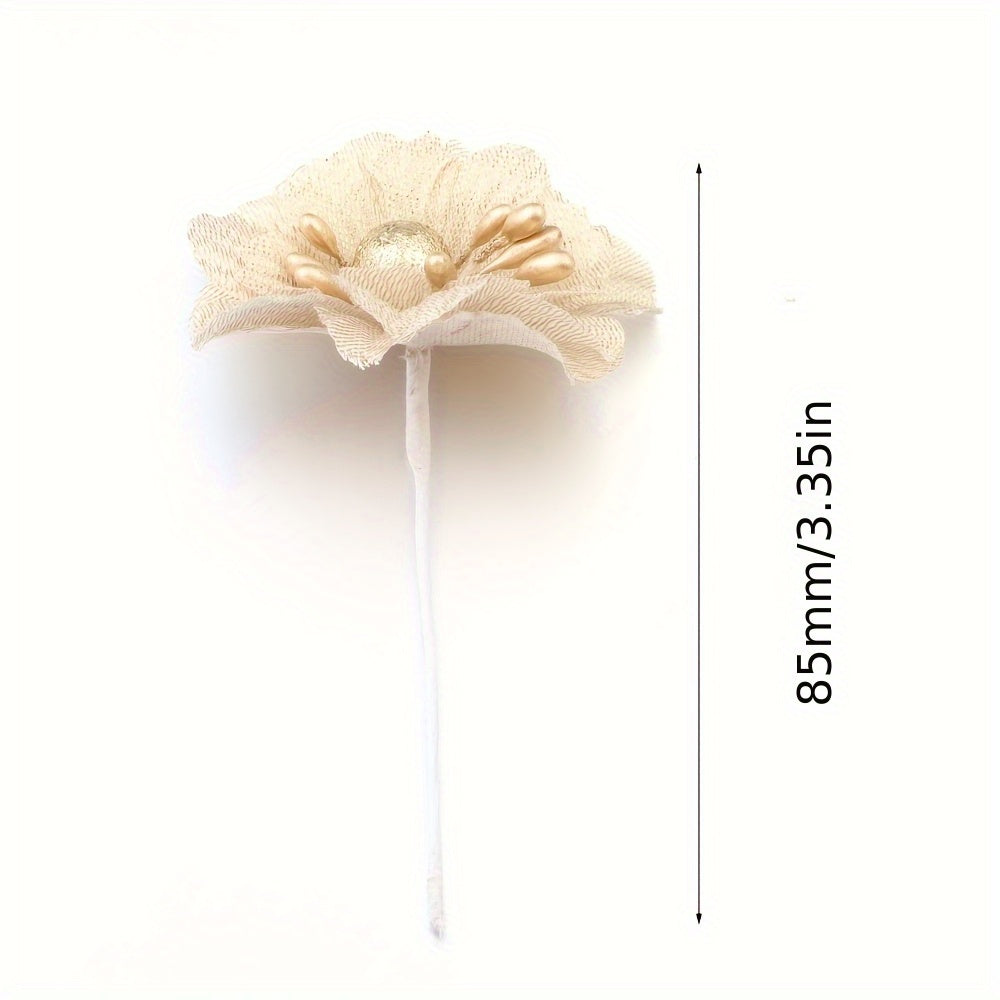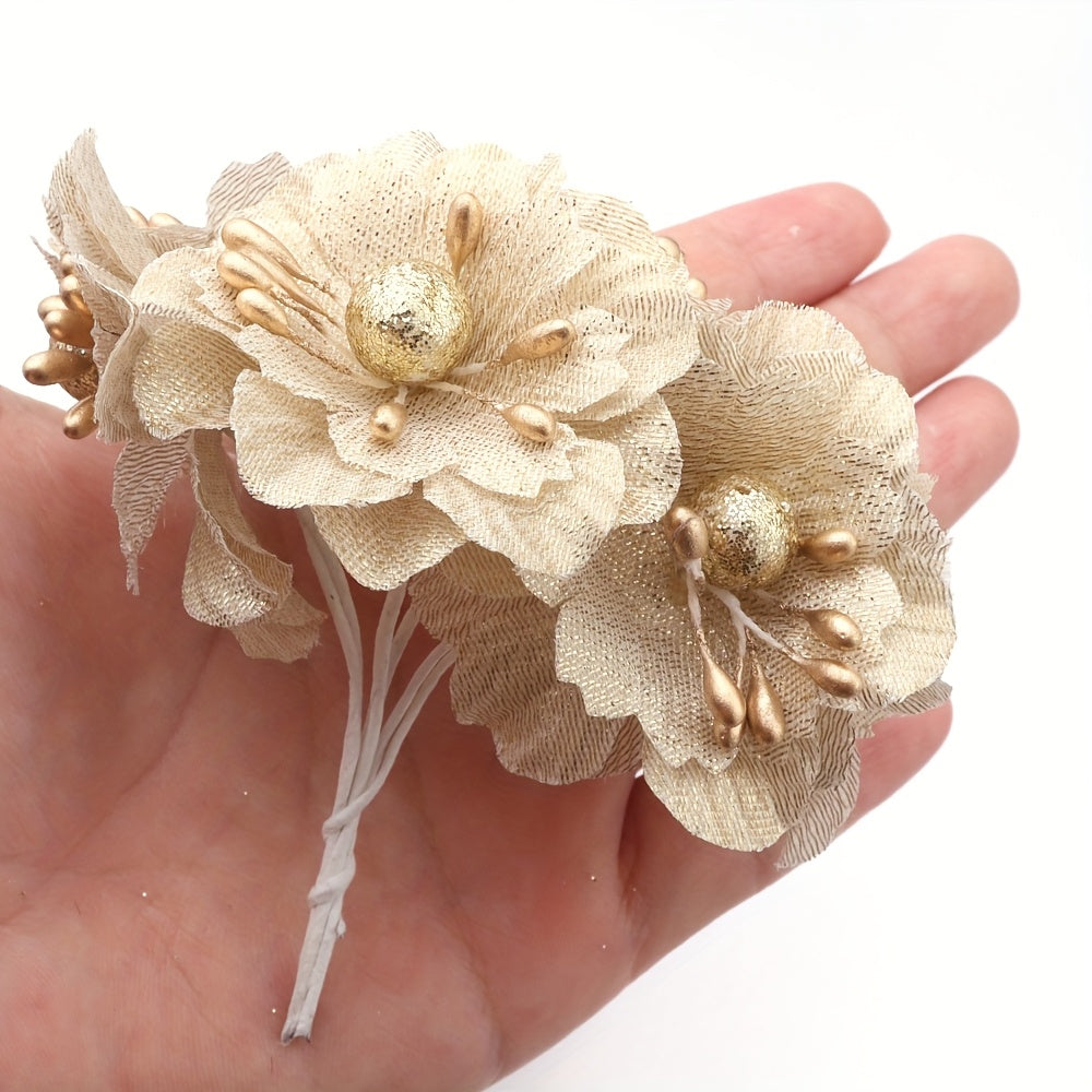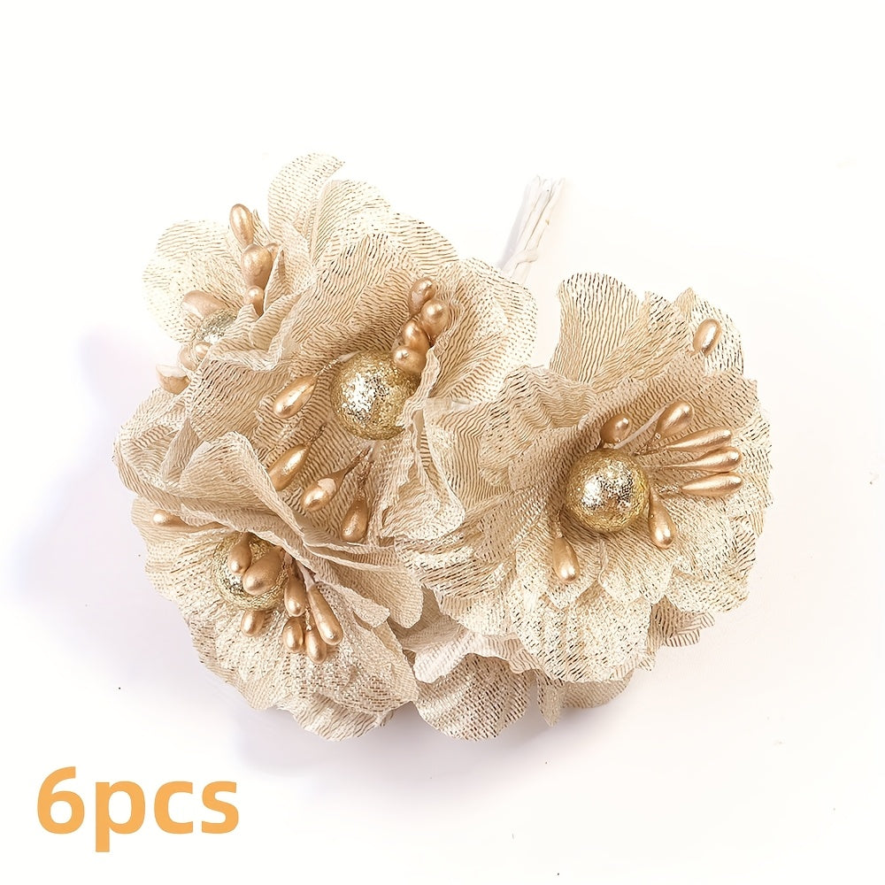 These 6pcs realistic fabric camellia flowers feature beige petals with golden centers, perfect for DIY crafts, jewelry display, wedding party decorations, and enhancing the ambiance at home or office.