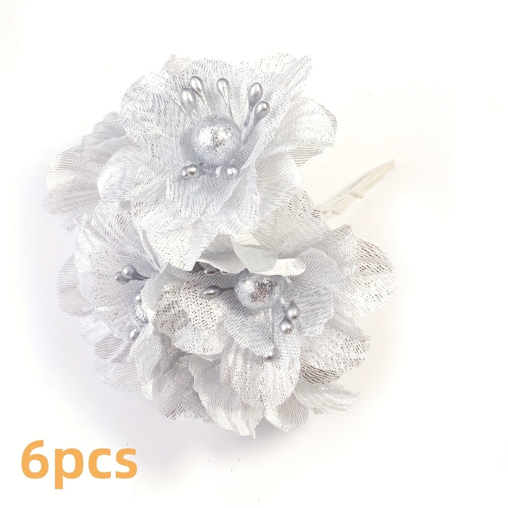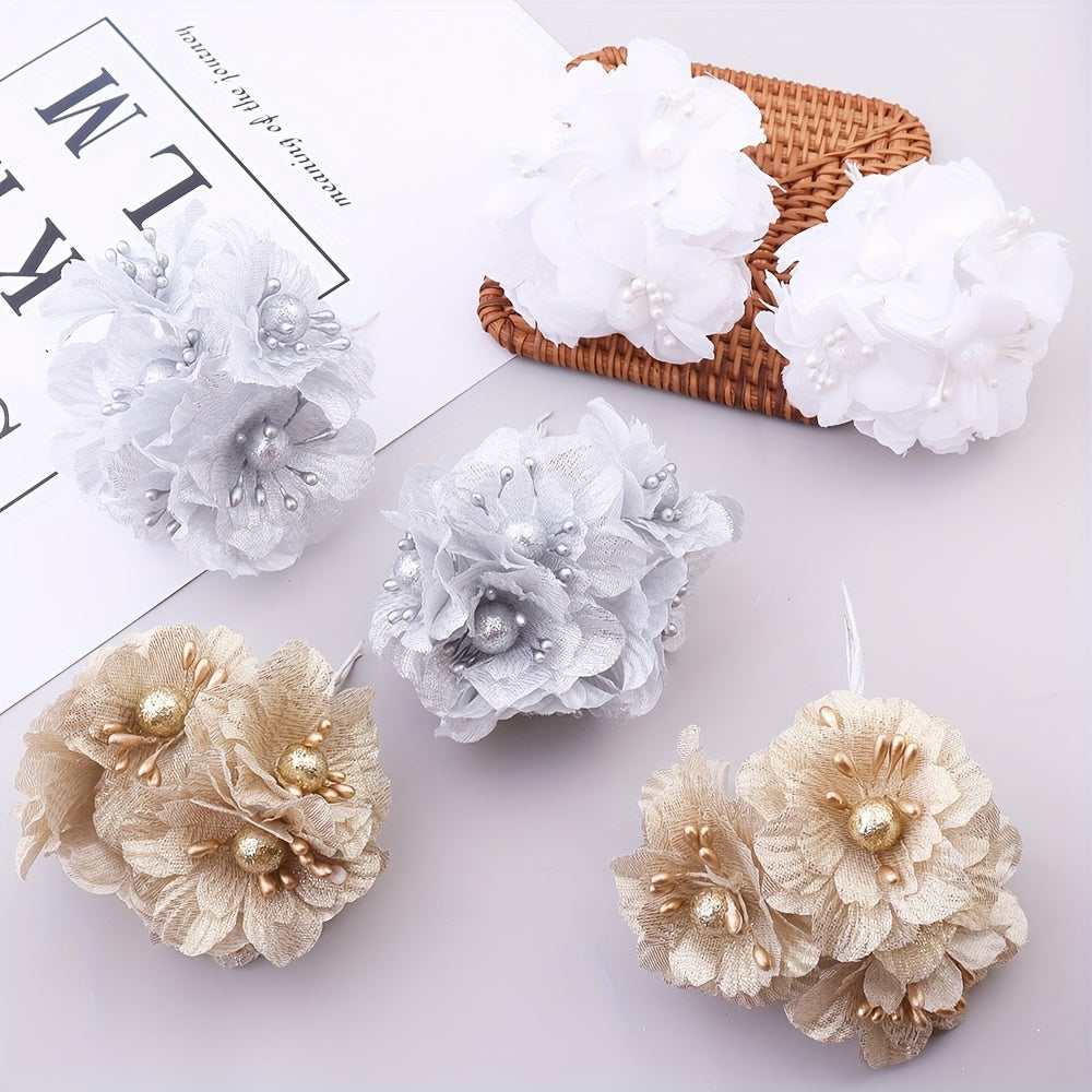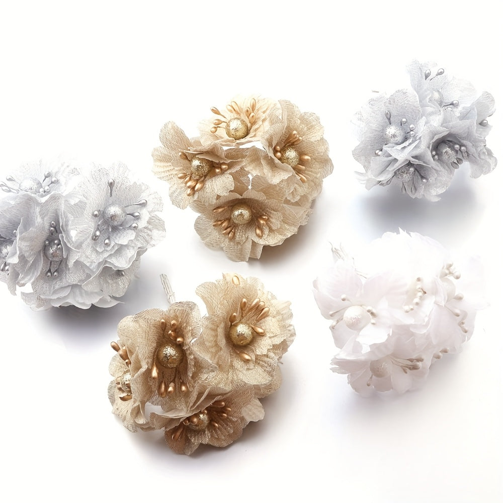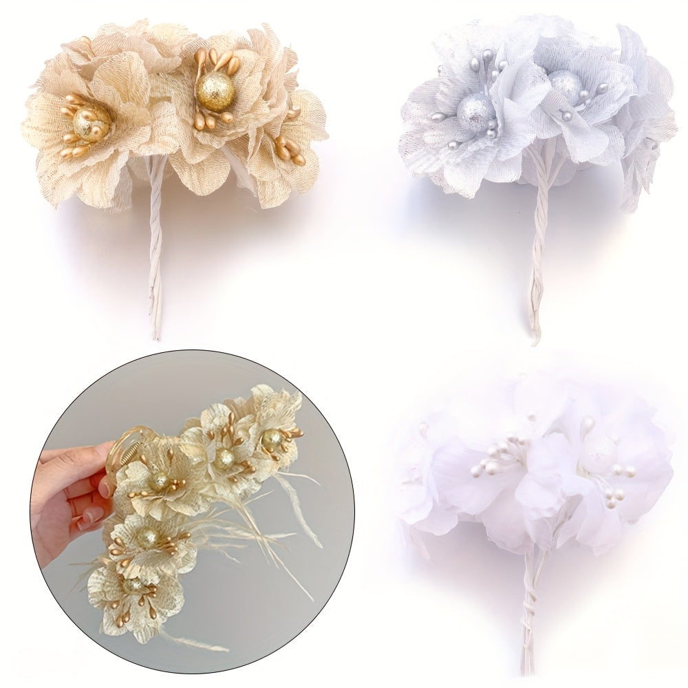 These 6pcs realistic fabric camellia flowers feature beige petals with golden centers, perfect for DIY crafts, jewelry display, wedding party decorations, and enhancing the ambiance at home or office.