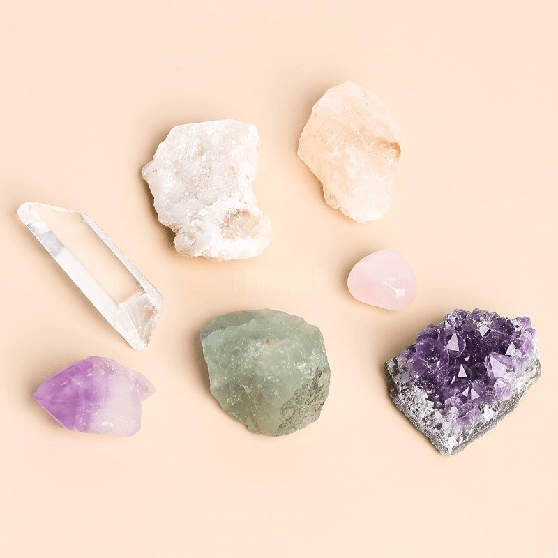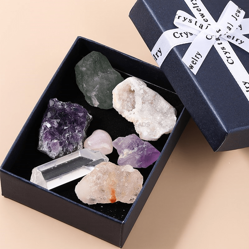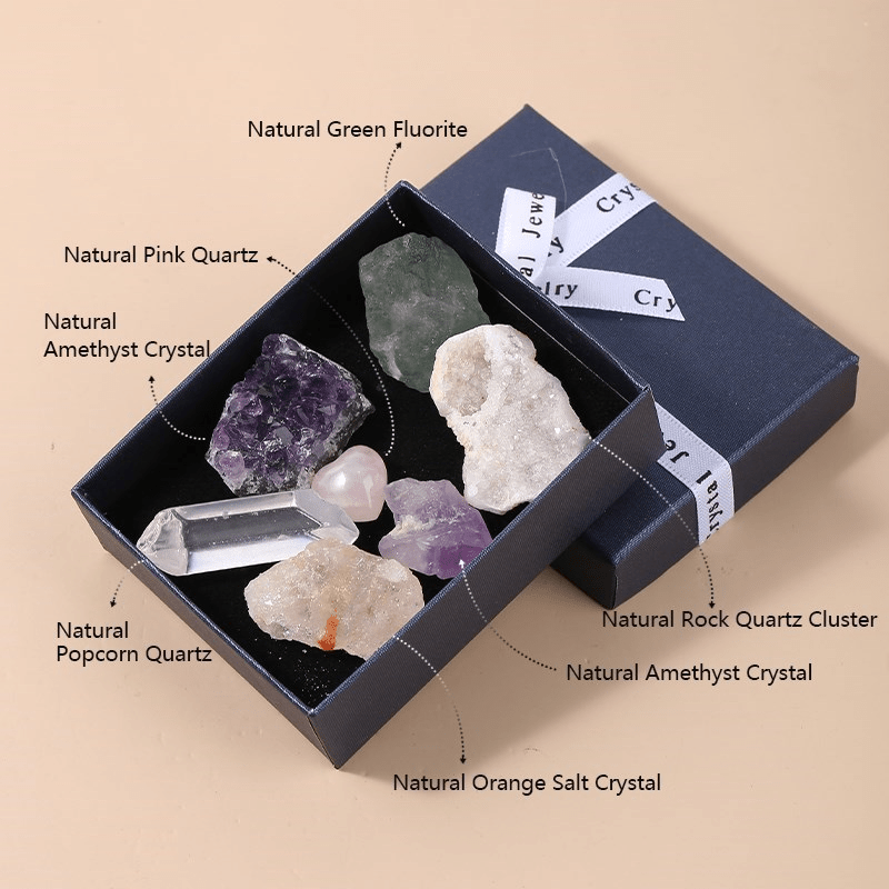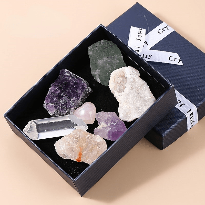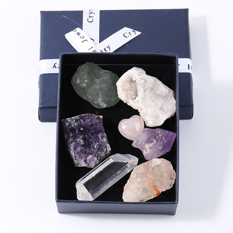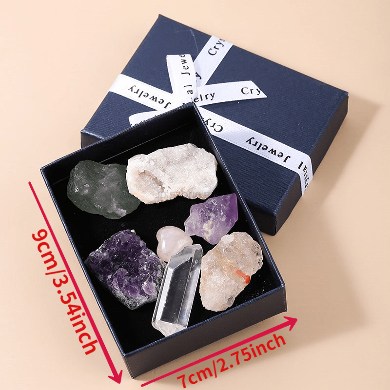 Enhance your home decor with this 7-piece set of natural crystal cluster point minerals including amethyst and rose minerals. Keep them in the included collect box for a stylish display.