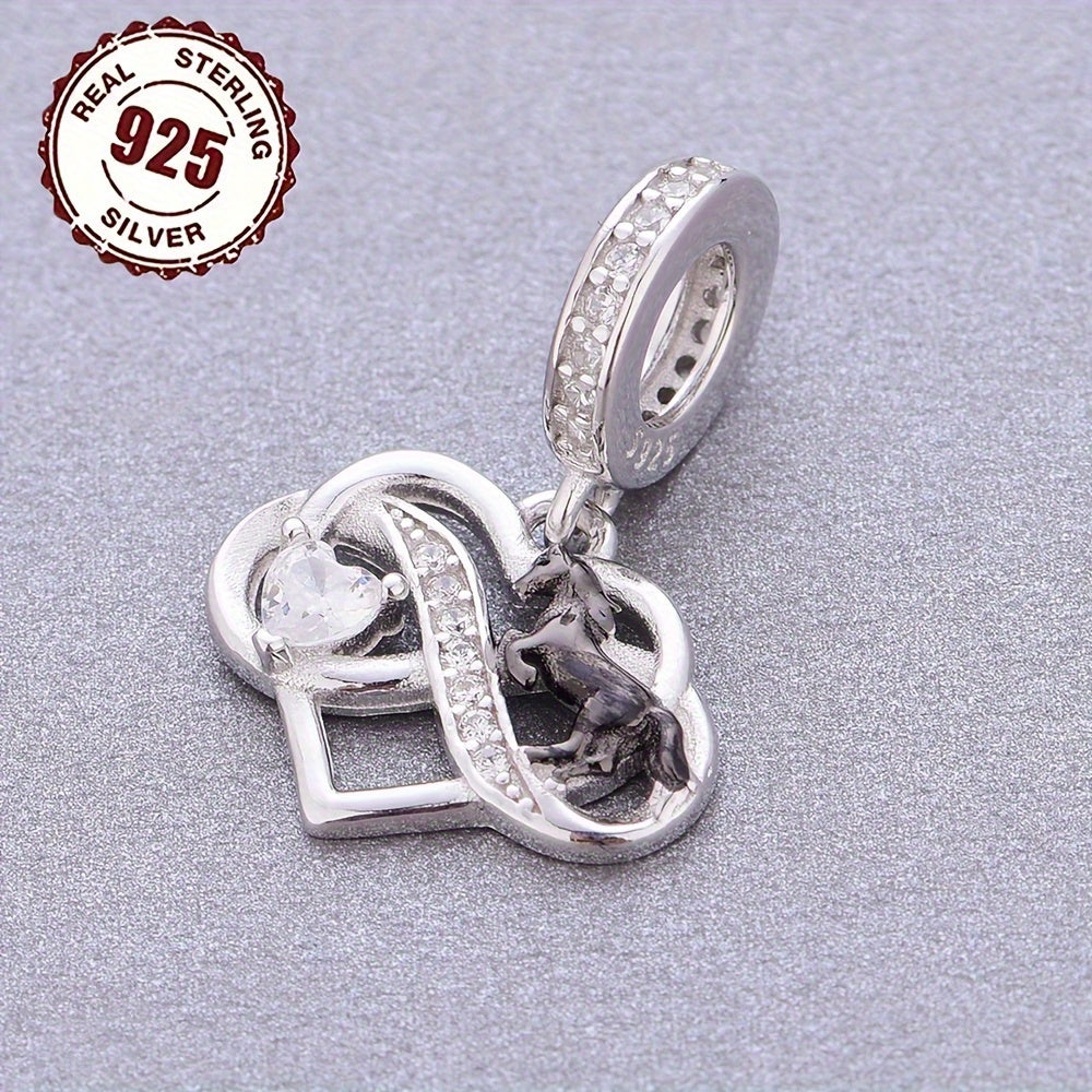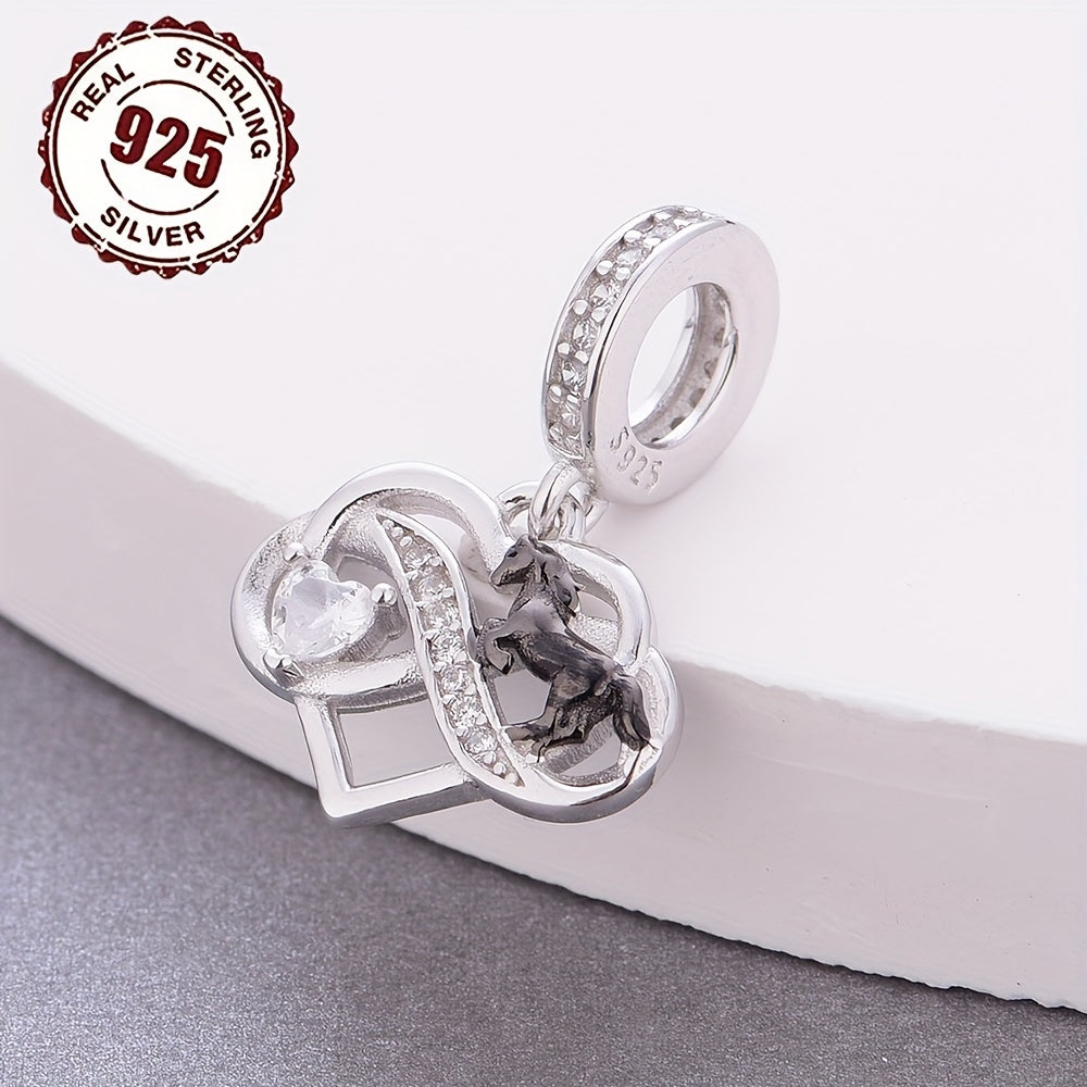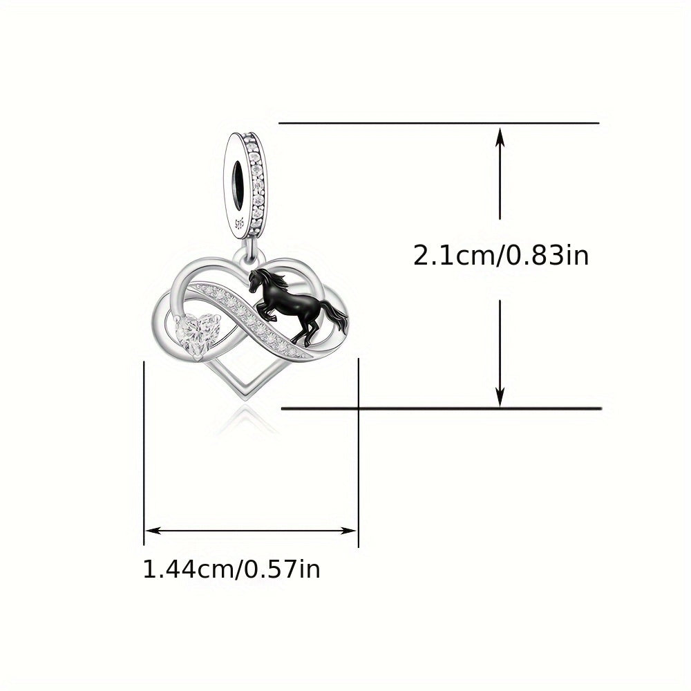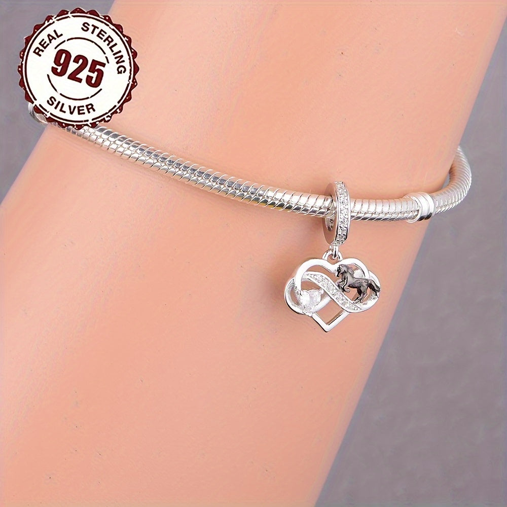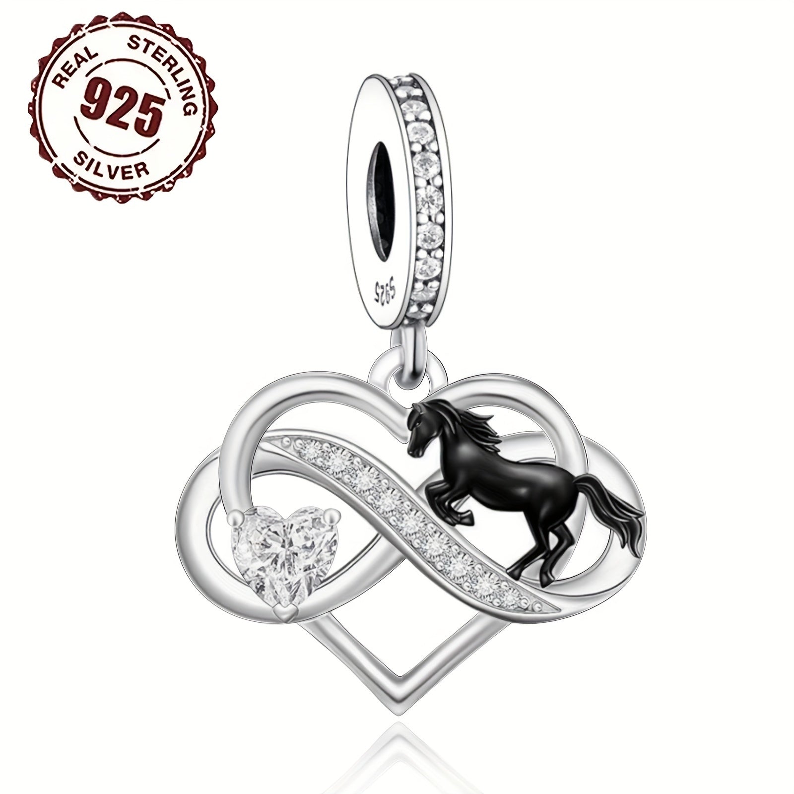 This 925 sterling silver charm features a running horse design with an infinite talisman symbol on a heart-shaped bead. Perfect for bracelet or necklace making.