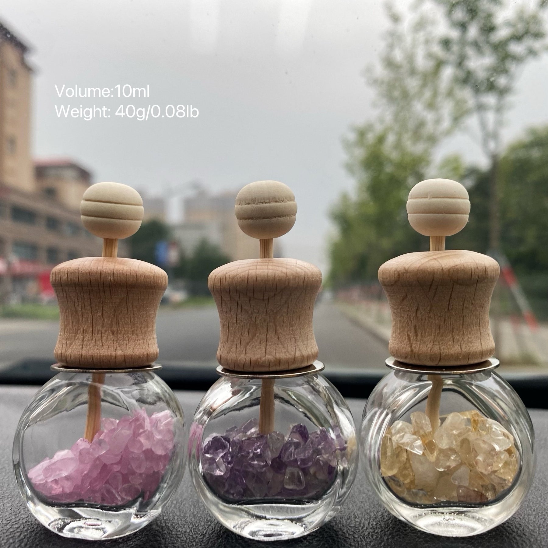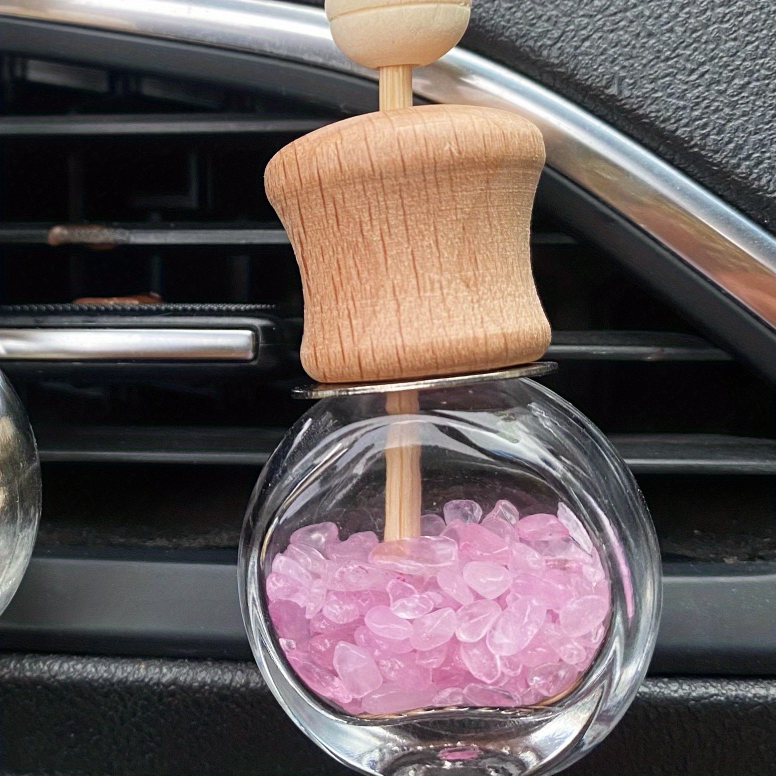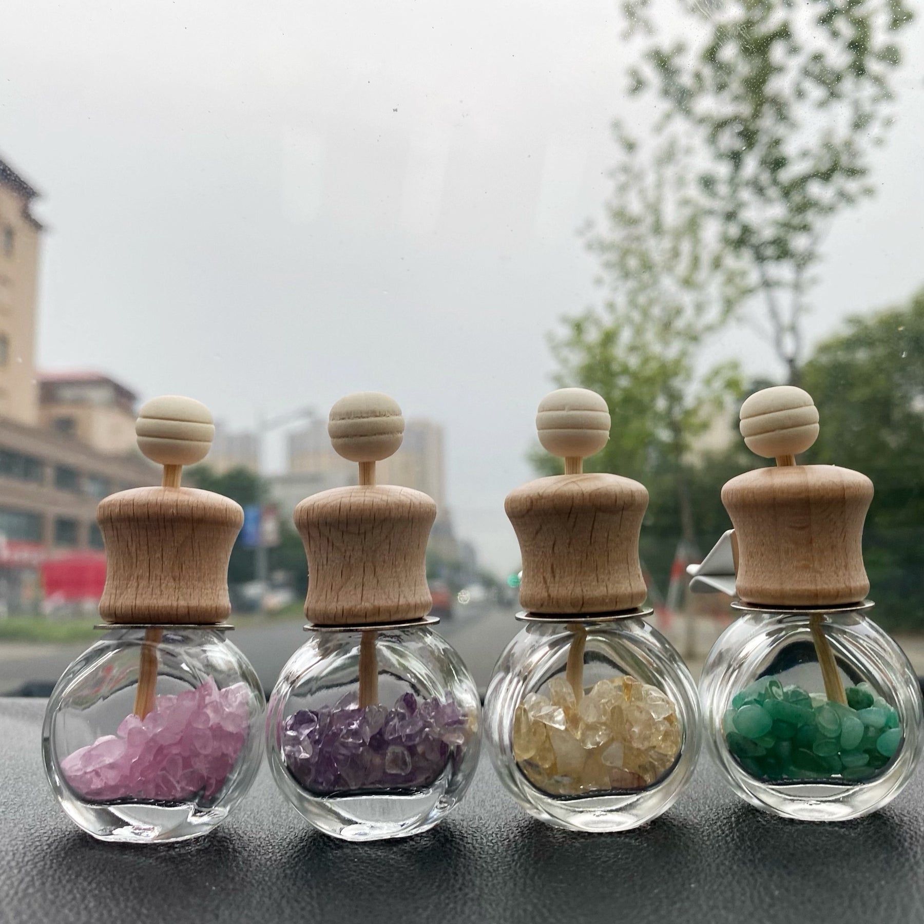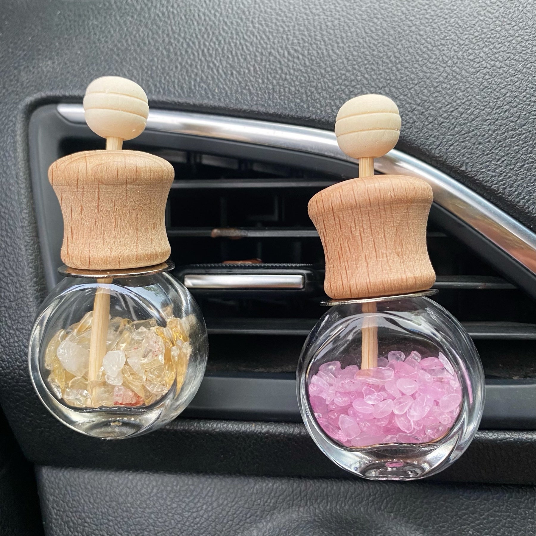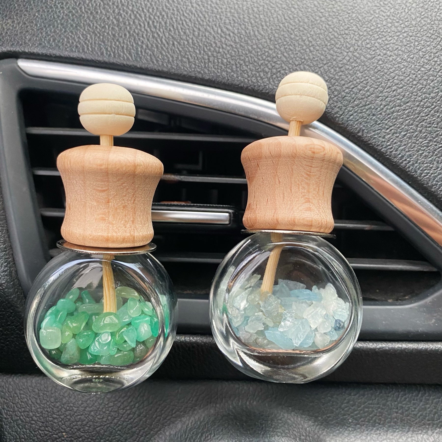 Enhance your car or home decor with these beautiful crystal chip-filled bottles. Perfect for adding a touch of elegance and positive energy to any space.