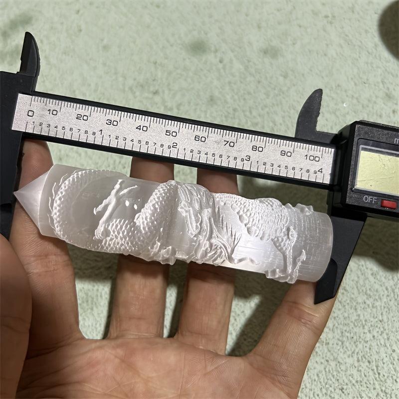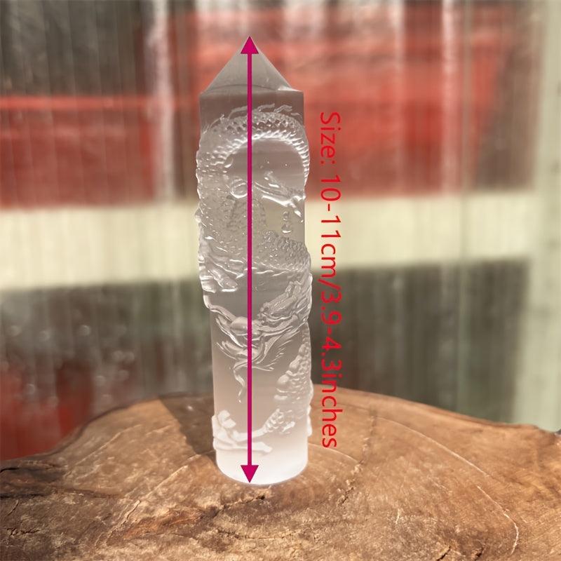 • Hand-carved selenite point with intricate dragon & phoenix pattern