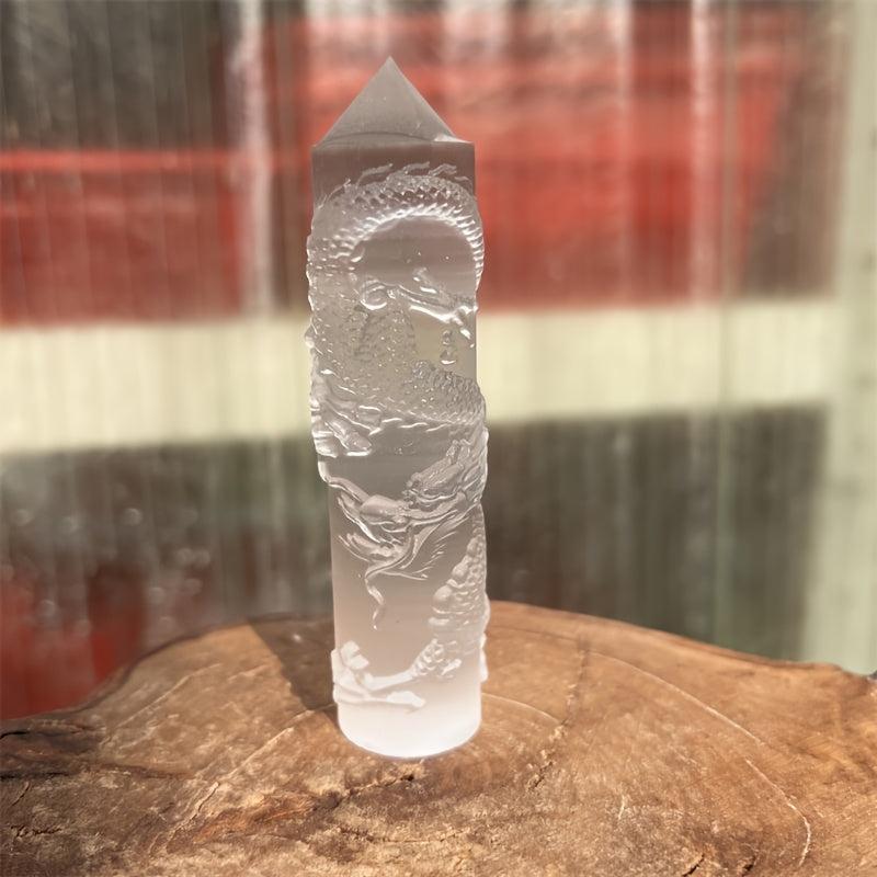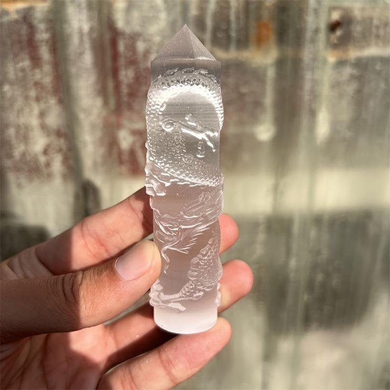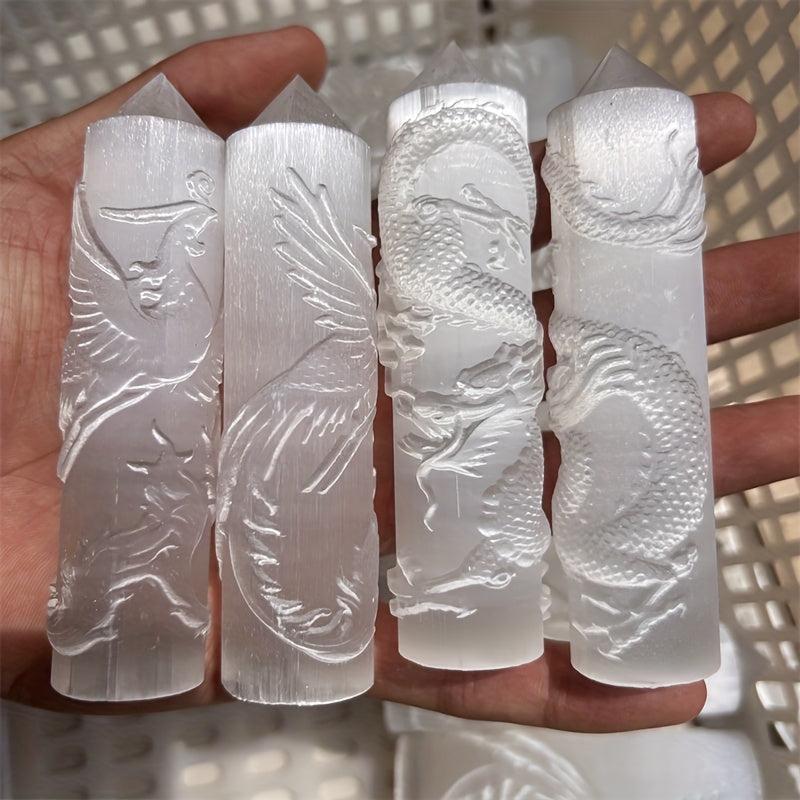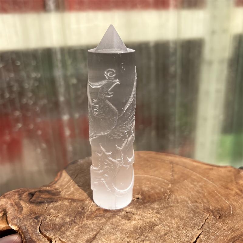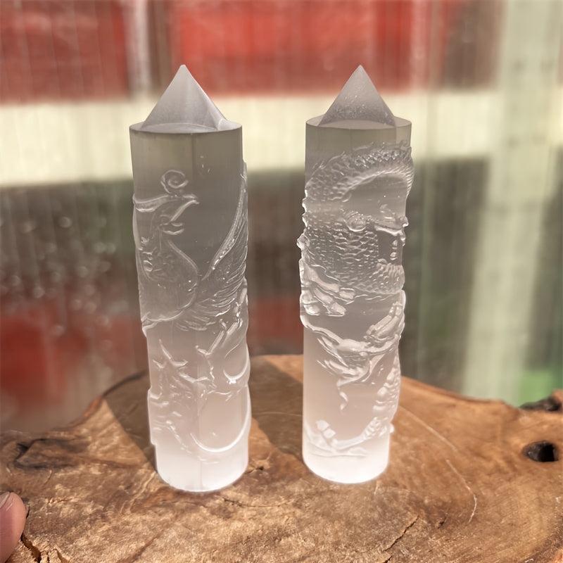Hand Carved Selenite Point with Dragon & Phoenix Pattern Tower