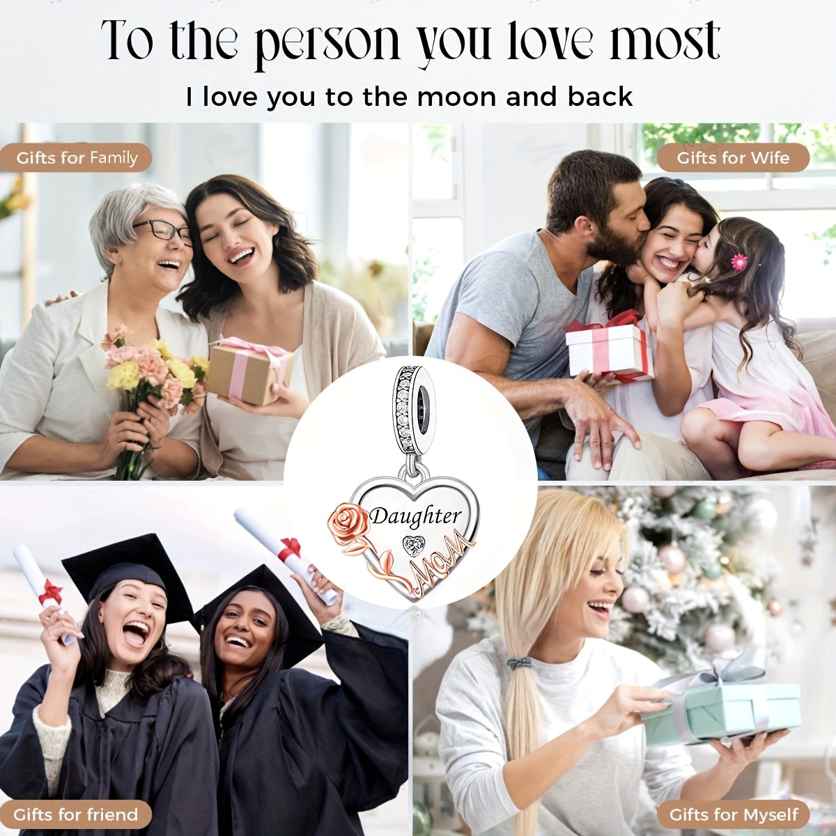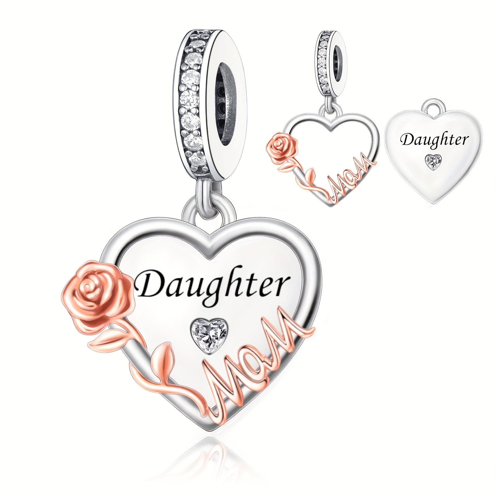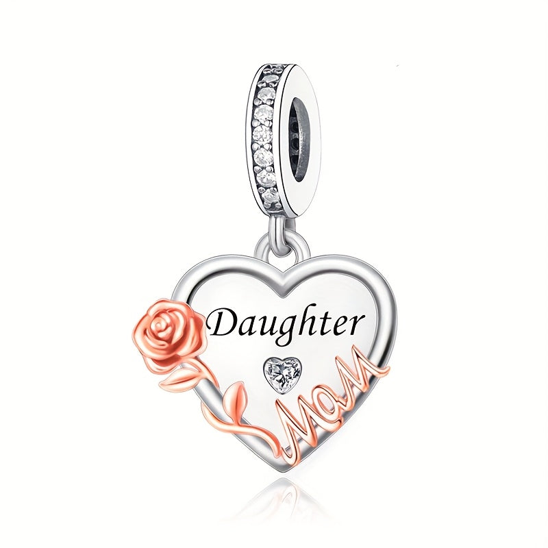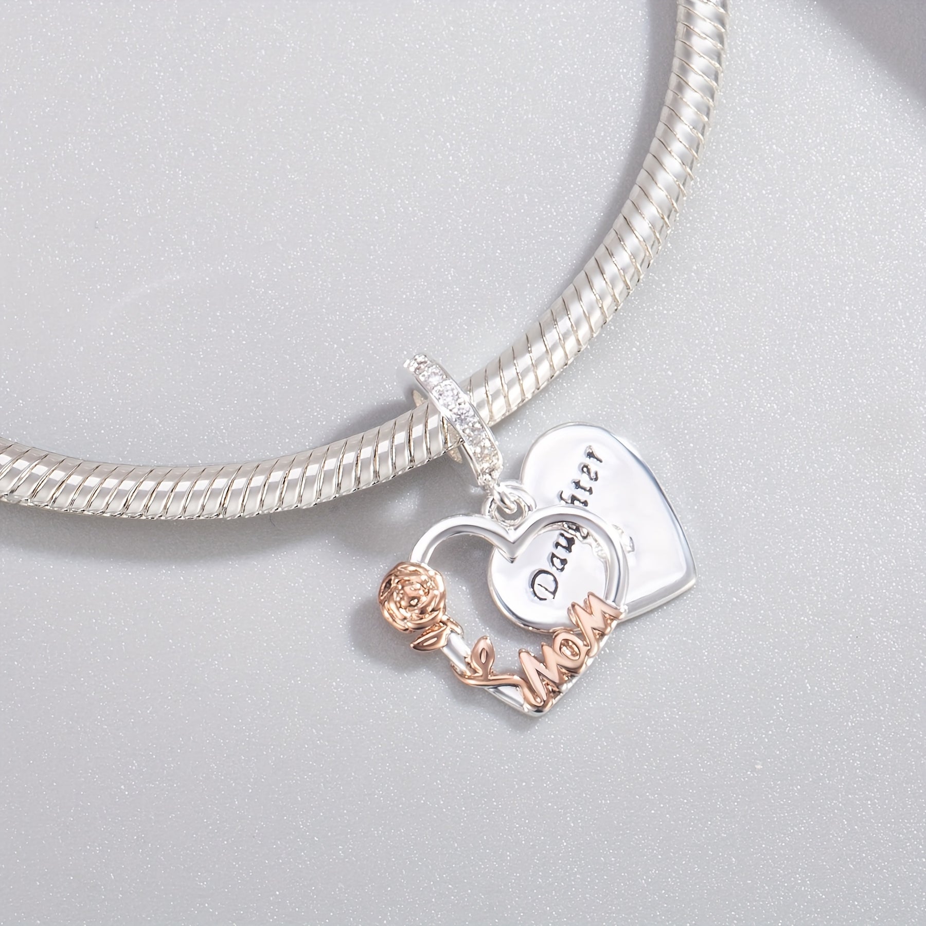 Beautiful double-layer heart pendant featuring a rose design, perfect for moms and daughters. Made of high-quality copper with sparkling cubic zirconia stones. Interlocking hearts symbolize the special bond between mother and daughter.
