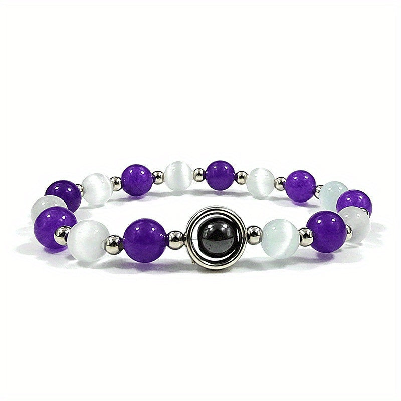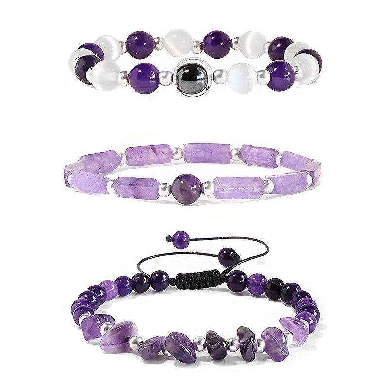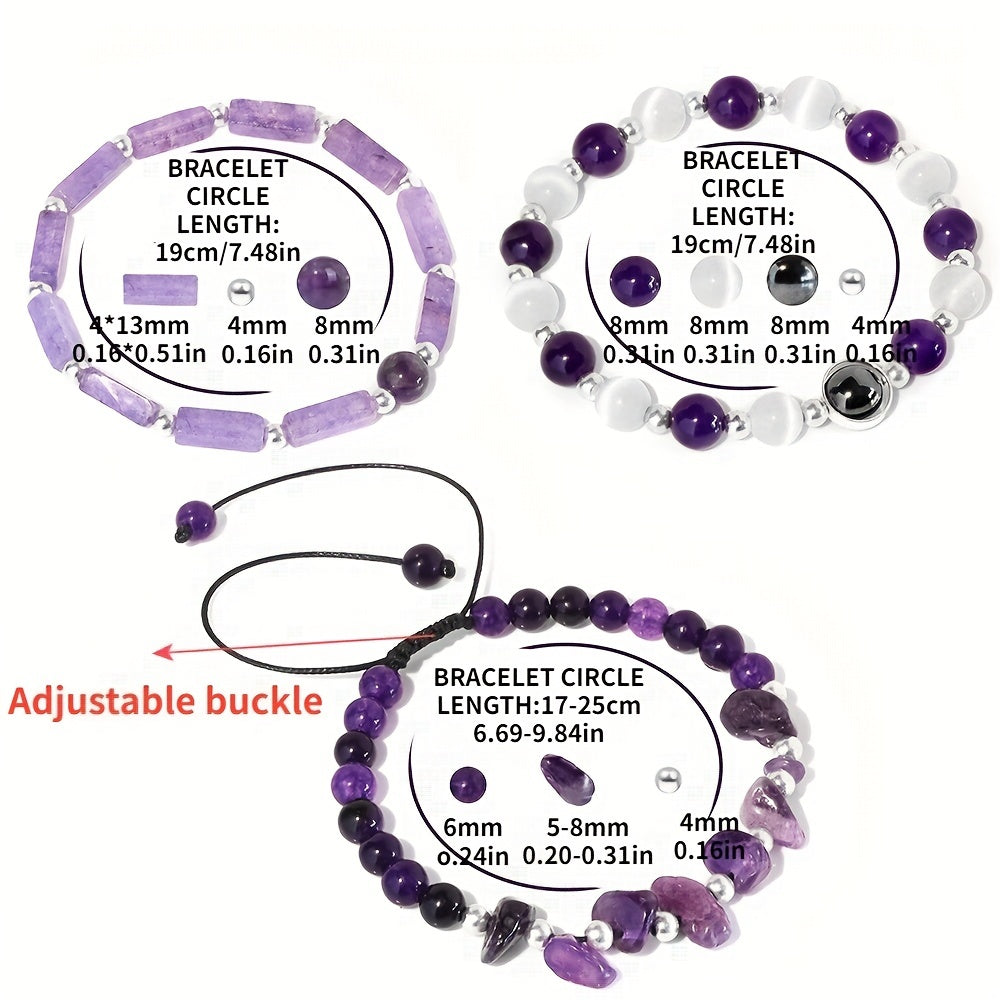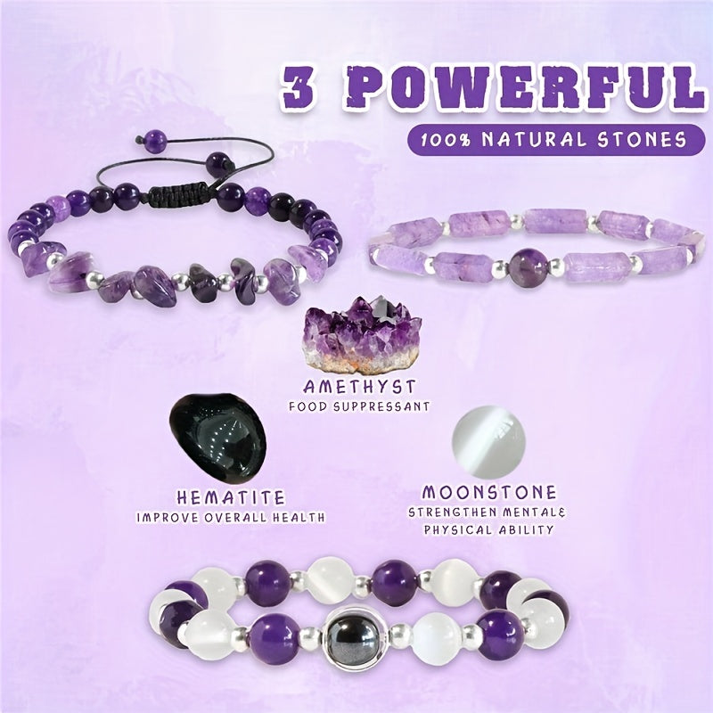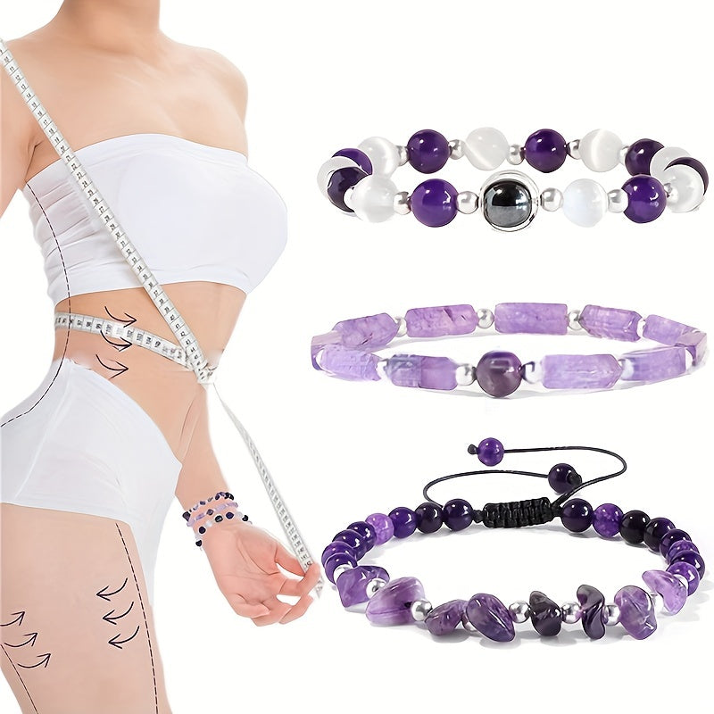 Experience the healing benefits of amethyst with these beautiful bracelets that help purify the body, relieve stress, and combat fatigue. Choose from three options for your needs.