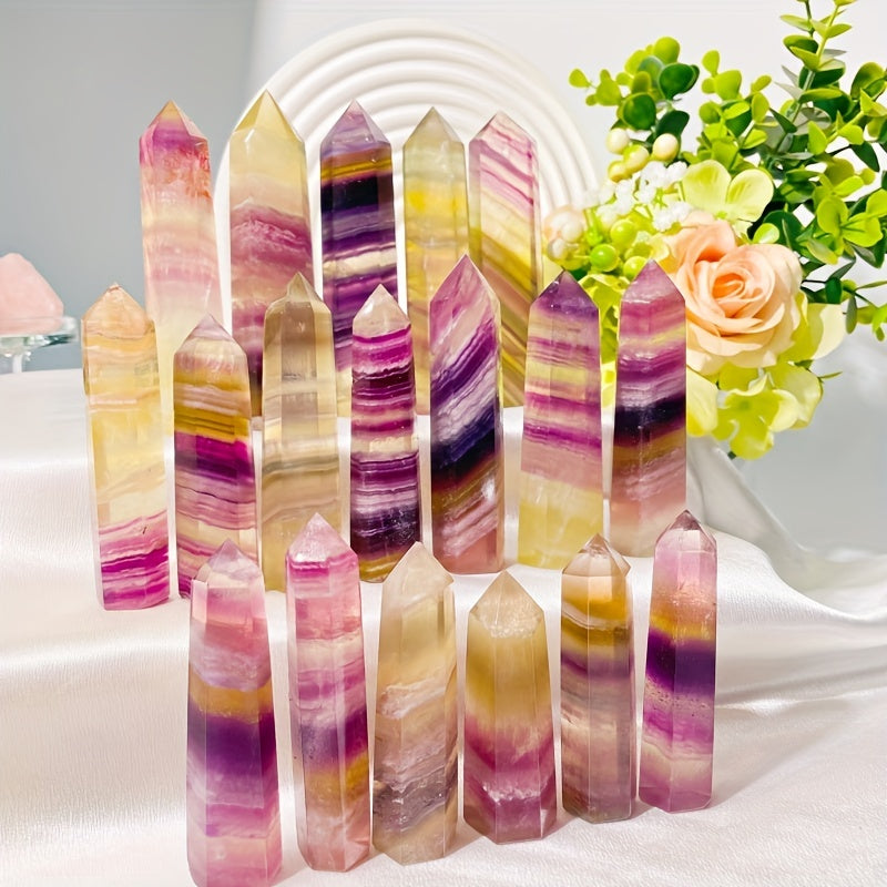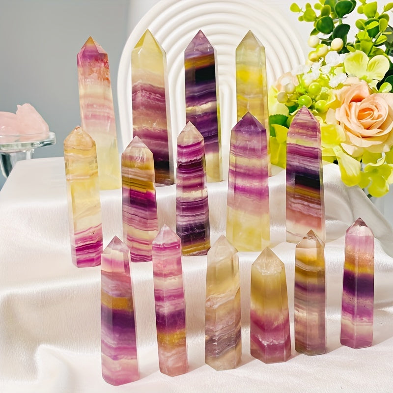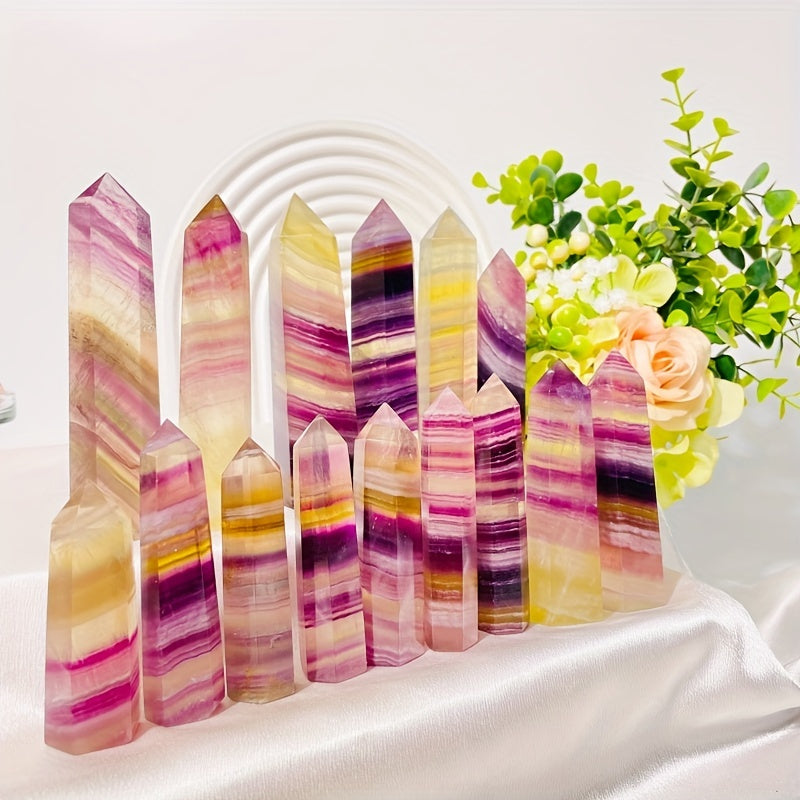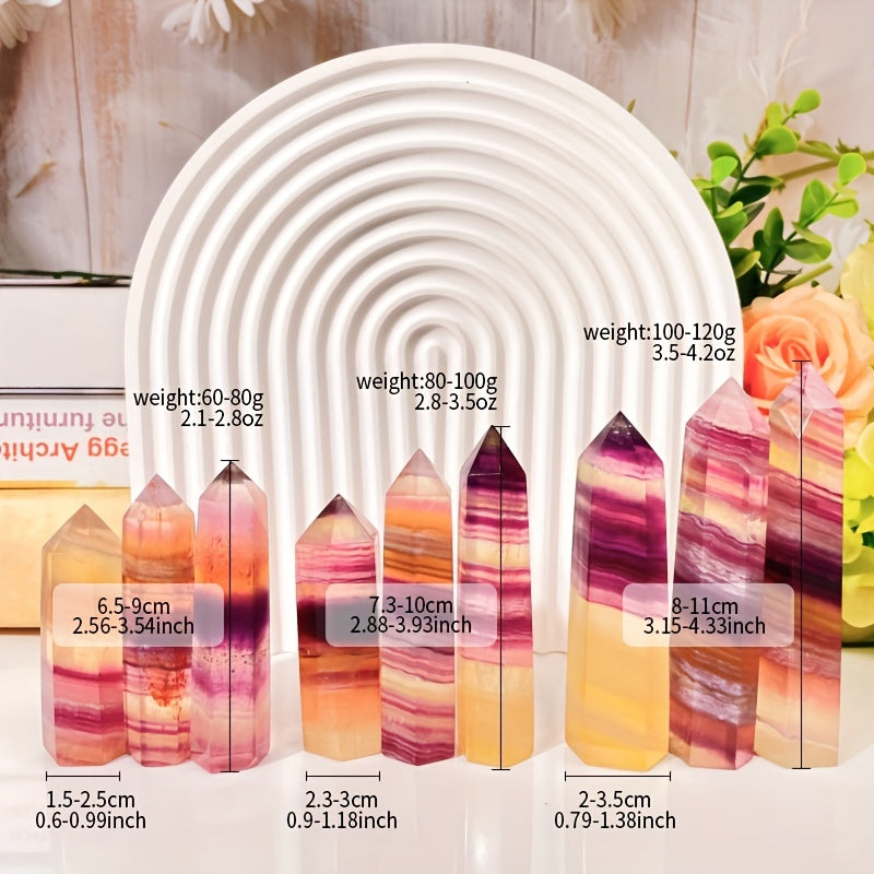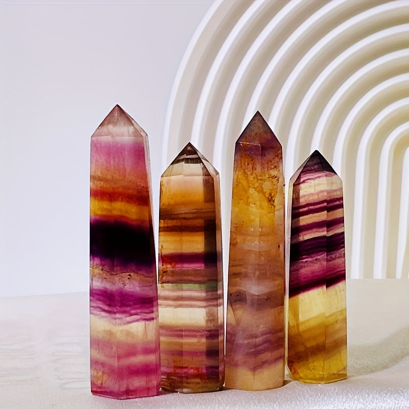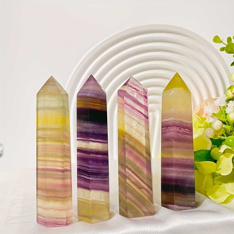 Explore the beauty of natural crystals with this single pointed fluorite pillar. Each piece features seven colors and a polished finish. Perfect for display or meditation.