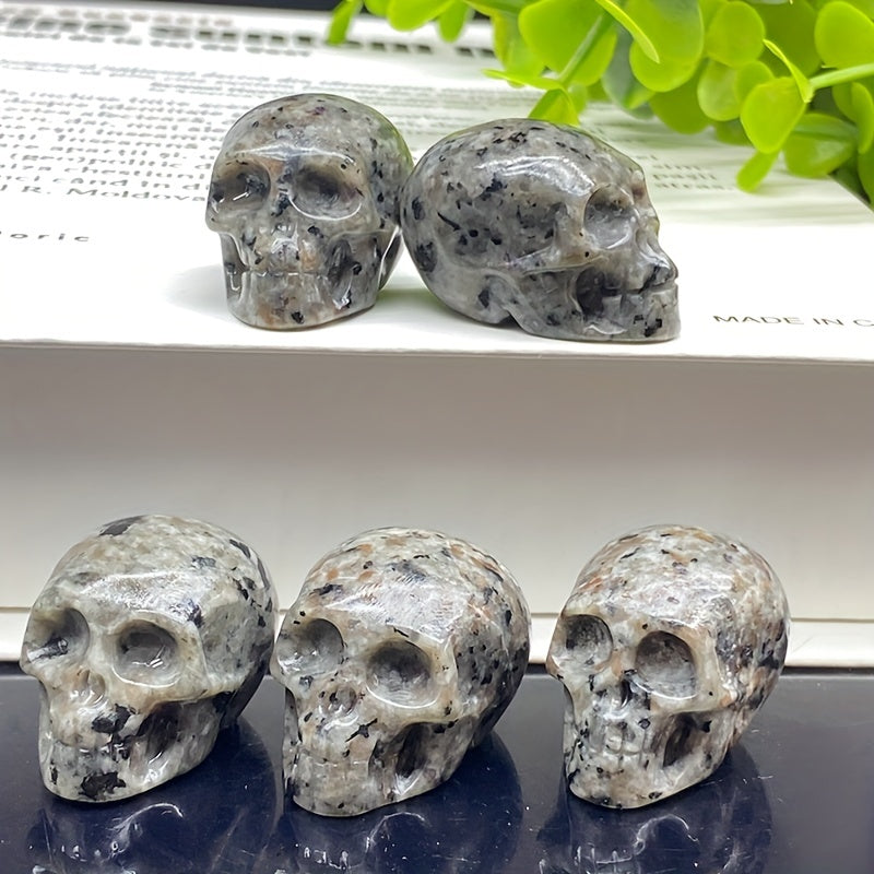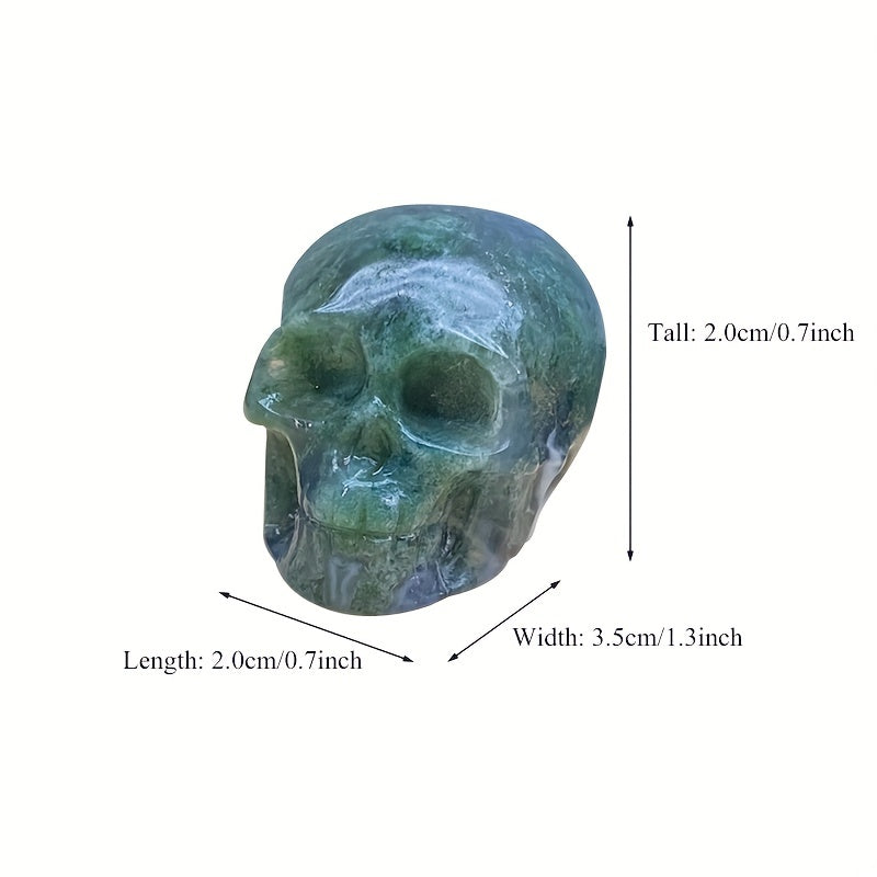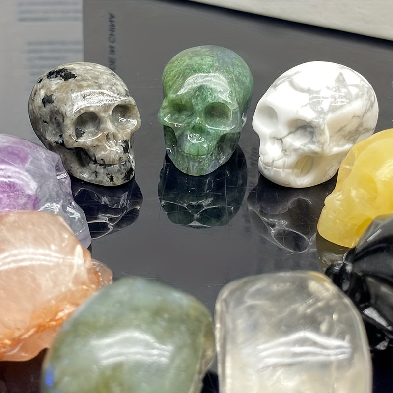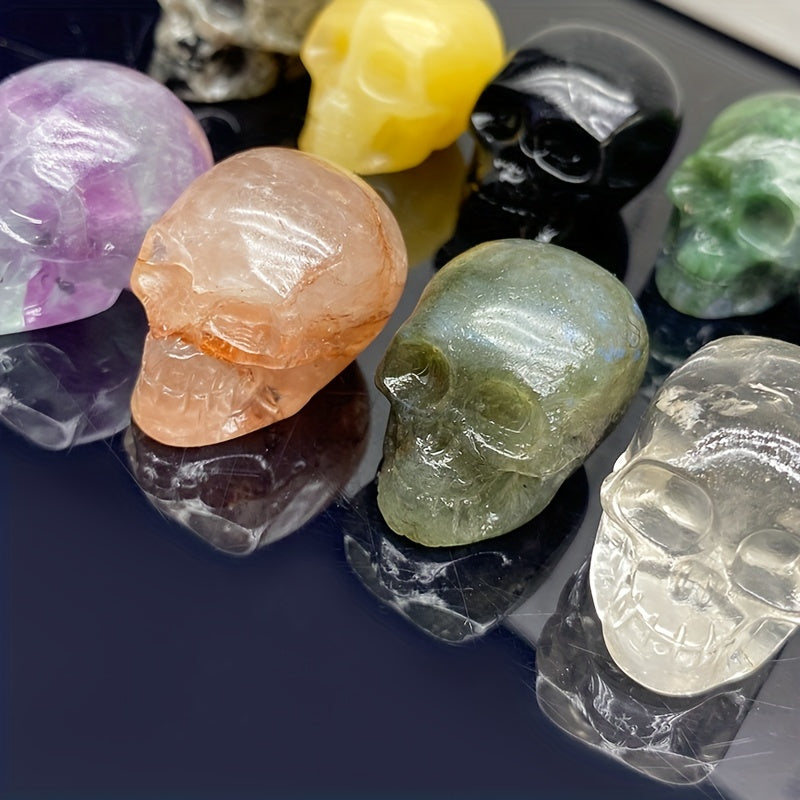 This unique crystal carving features a skull design made from clear quartz and fluorite crystals, perfect for healing and decoration.