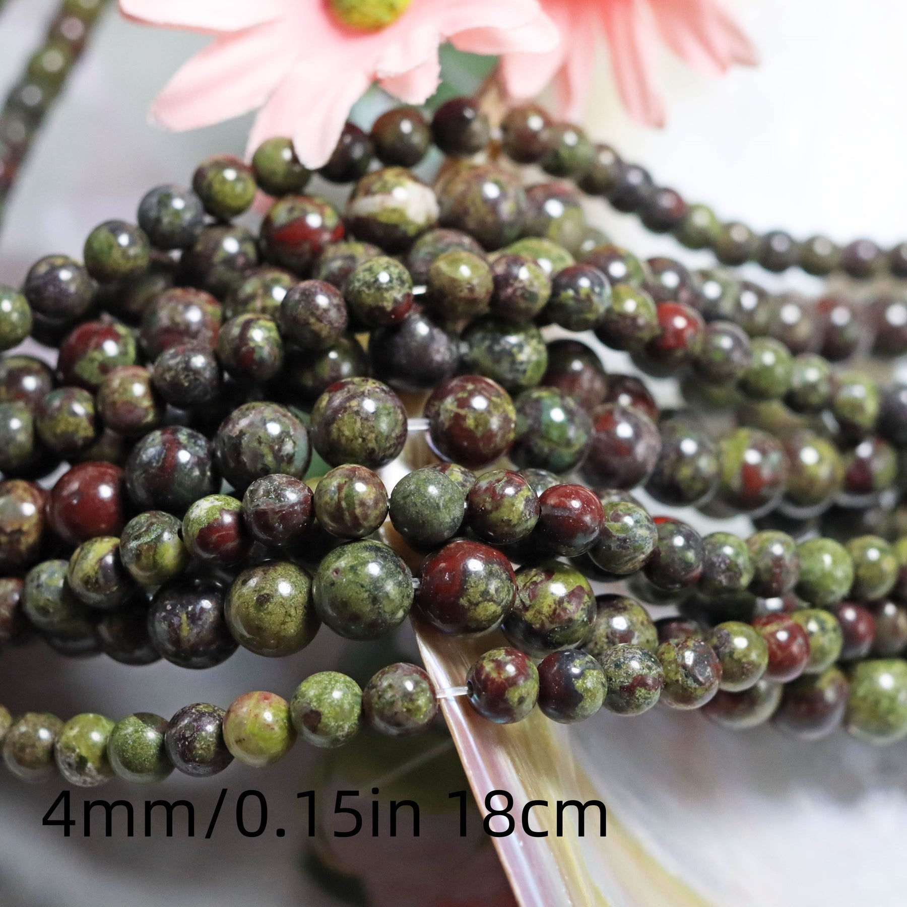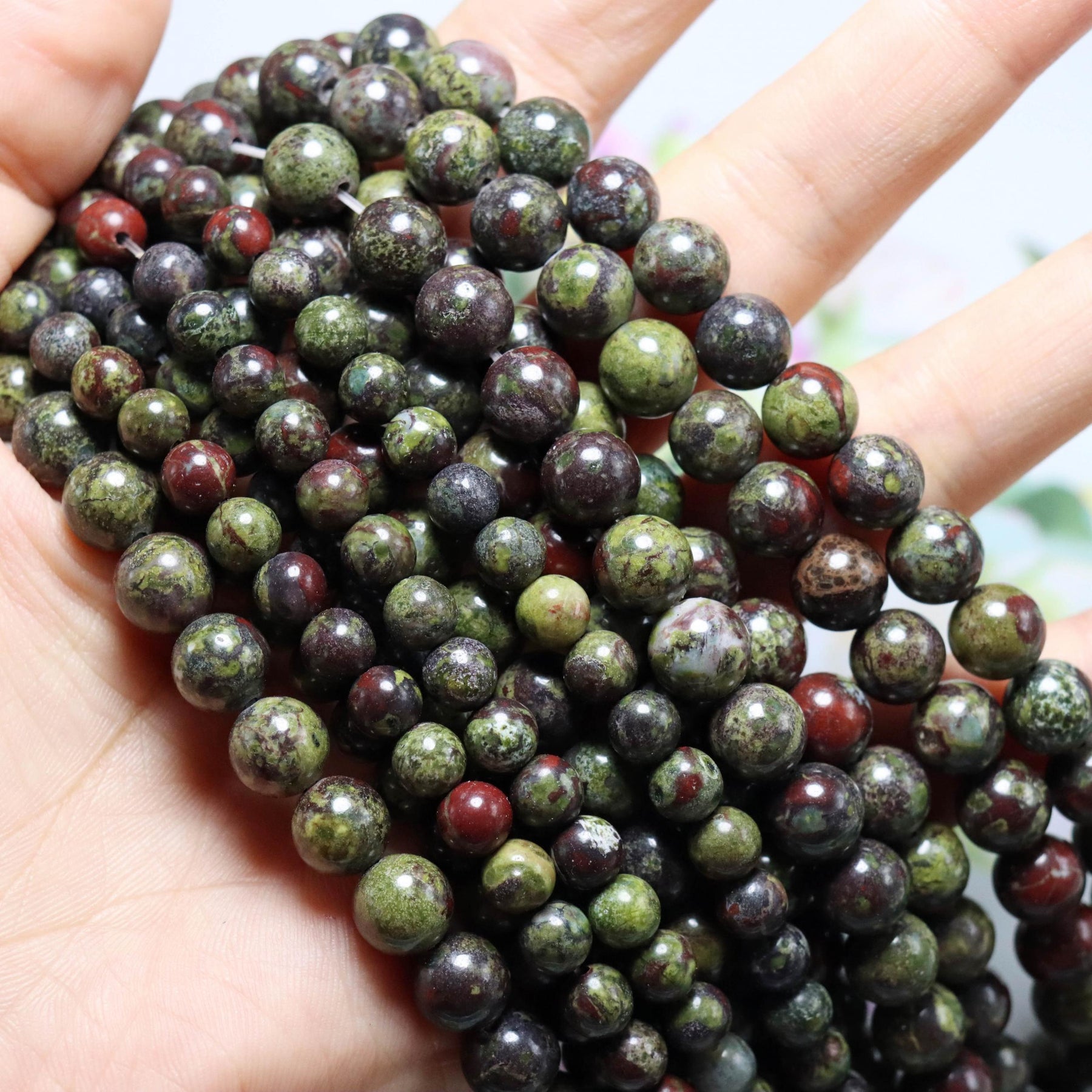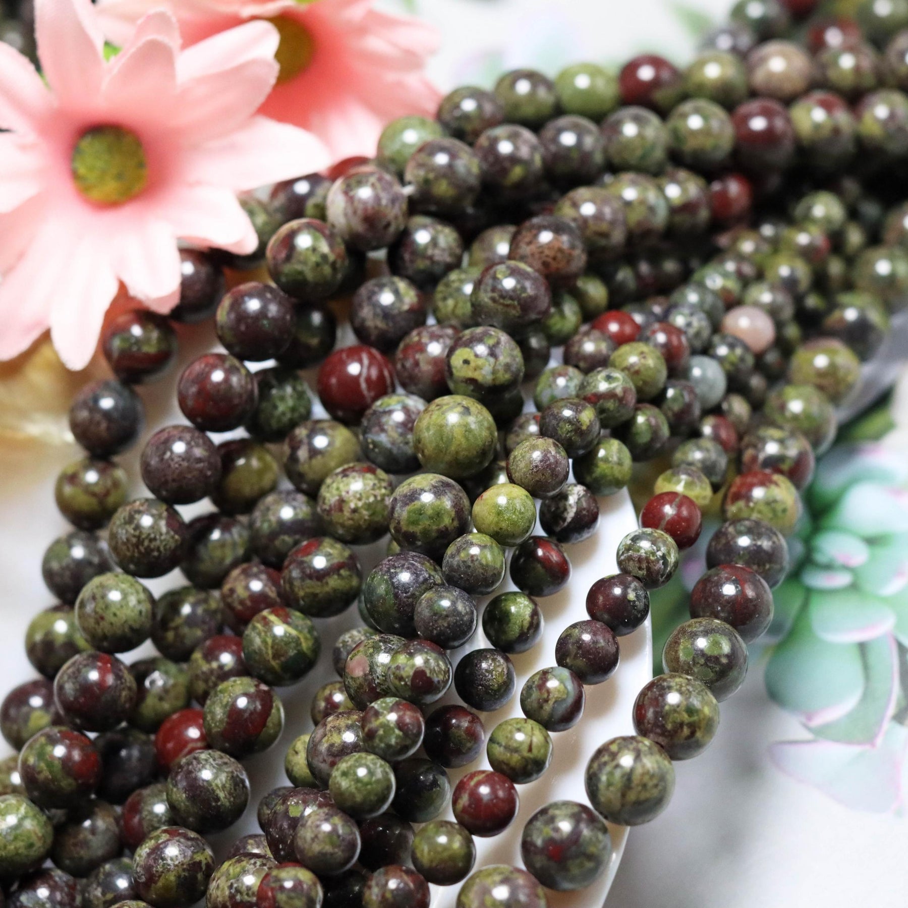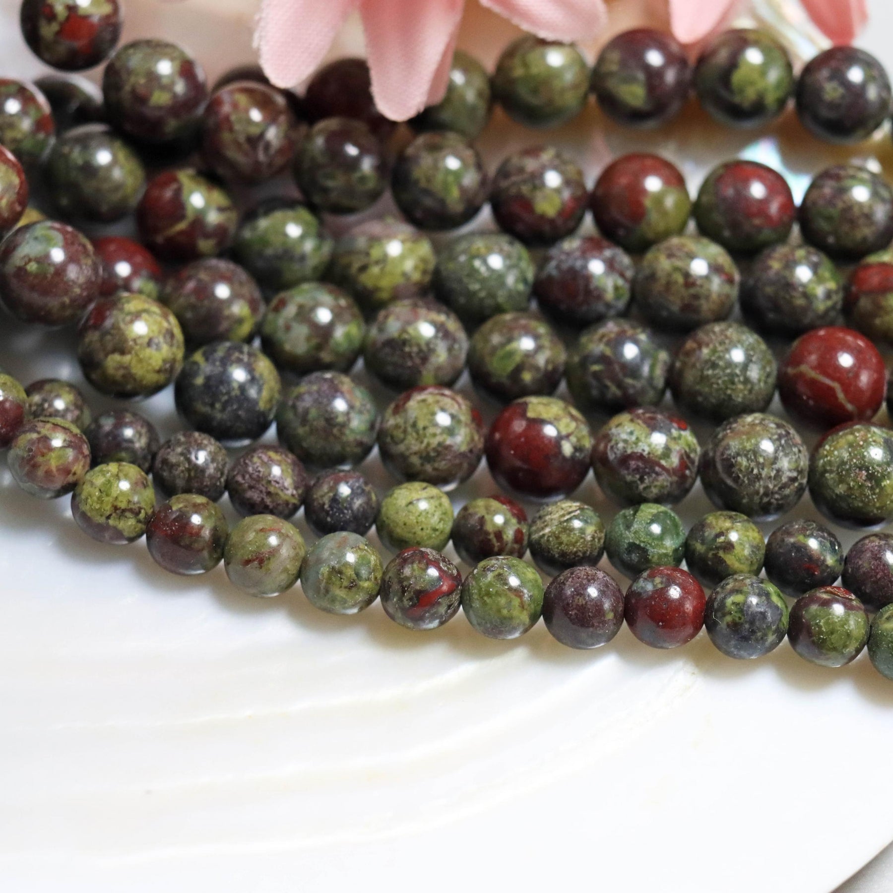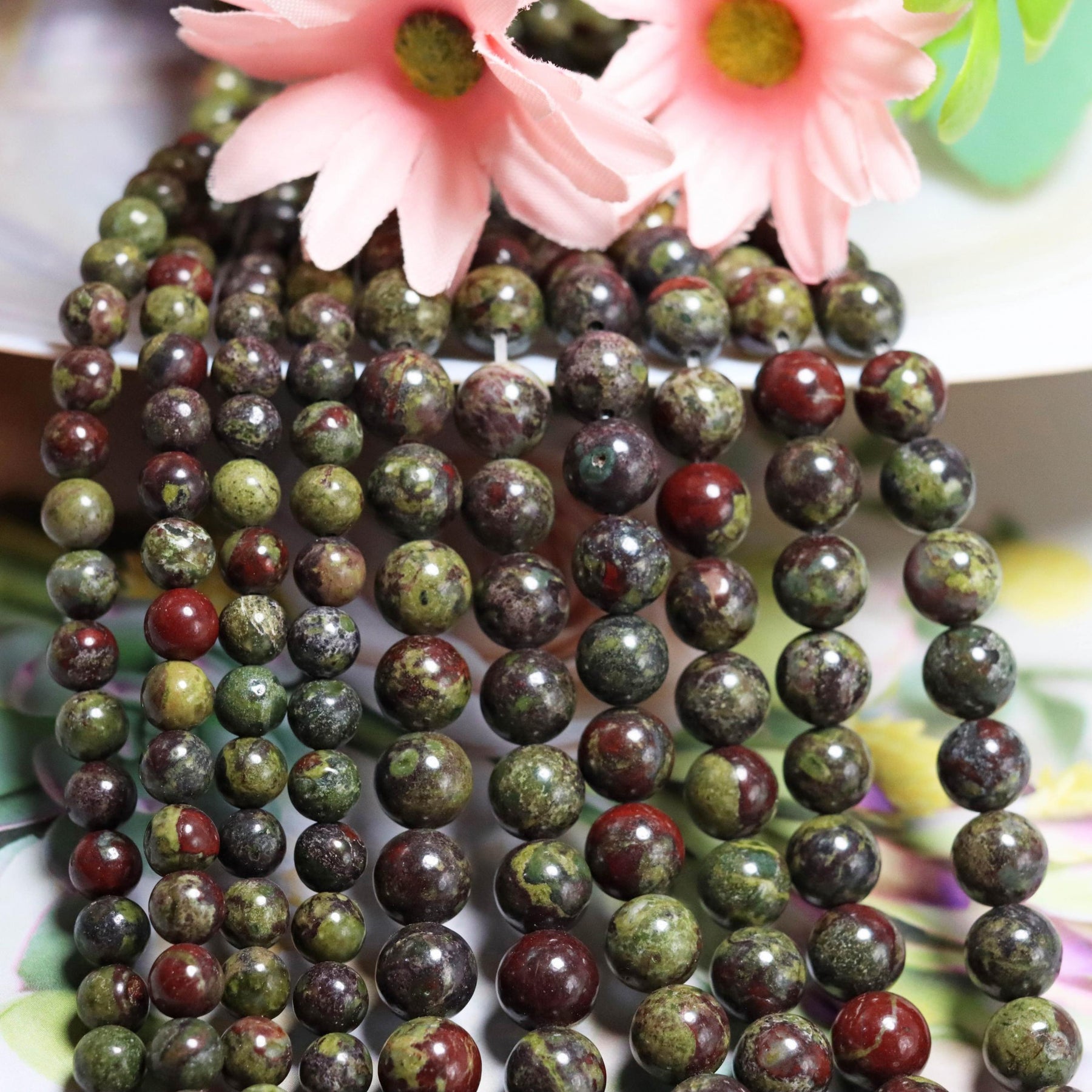 Get creative with these natural red and green dragon bloodstone beads that are perfect for making bracelets and necklaces. Each strand contains dinosaur stone spacer beads for unique designs.
