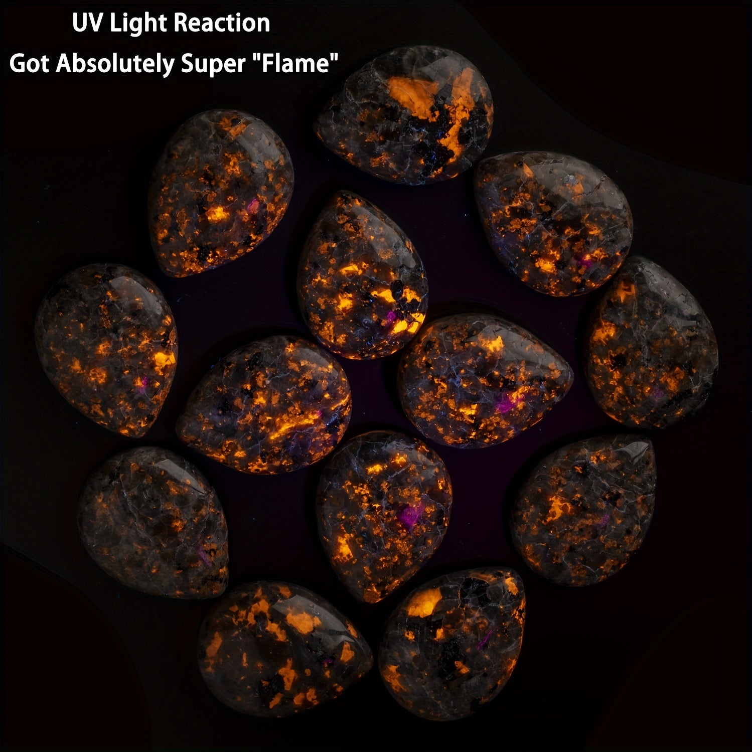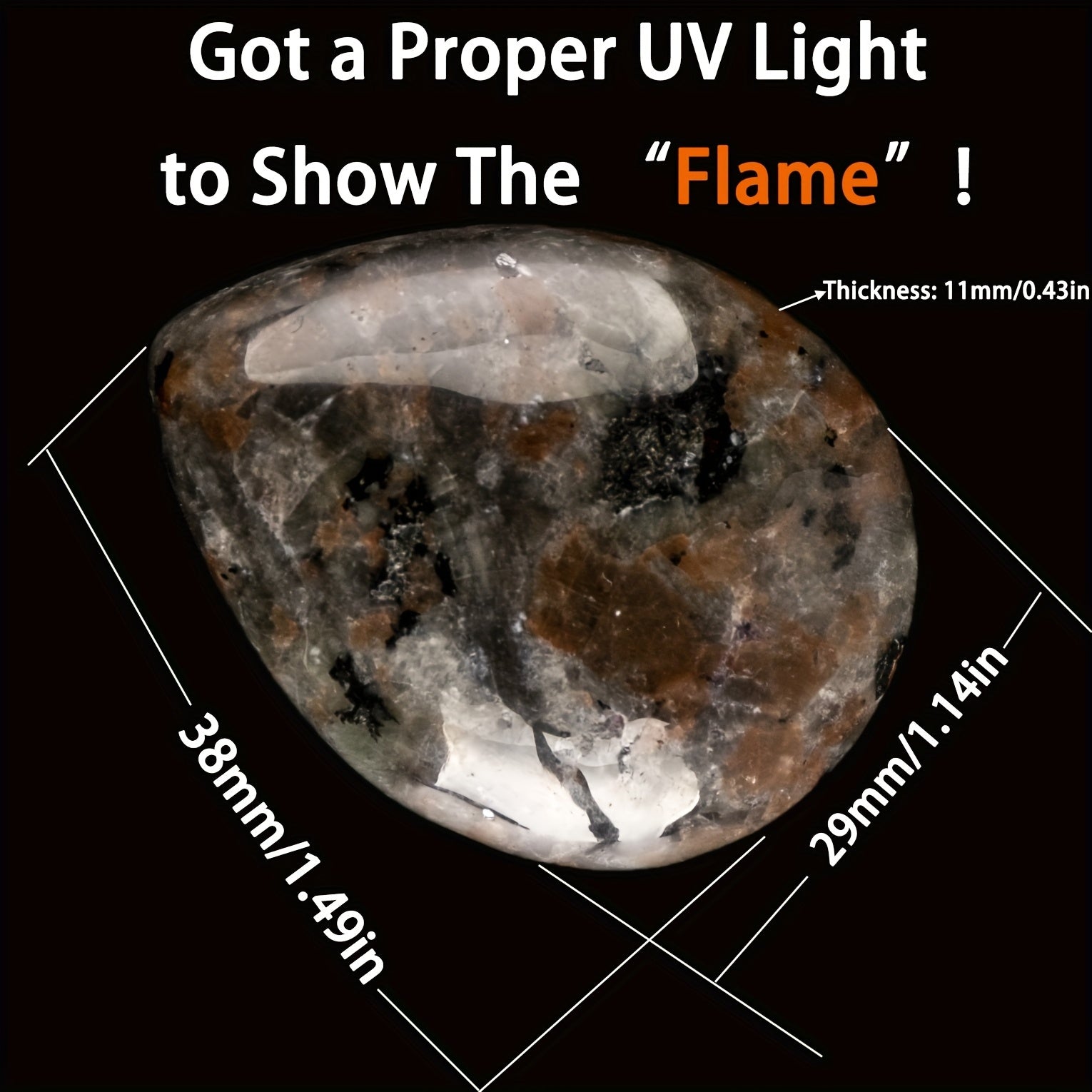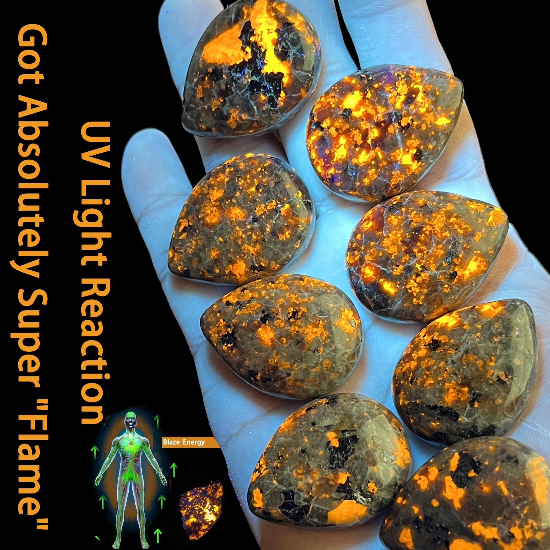 This unique stone is UV light reactive, revealing a stunning glow under blacklight. It features Syenite with fluorescent Sodalite Emberlite Tumble Gem.