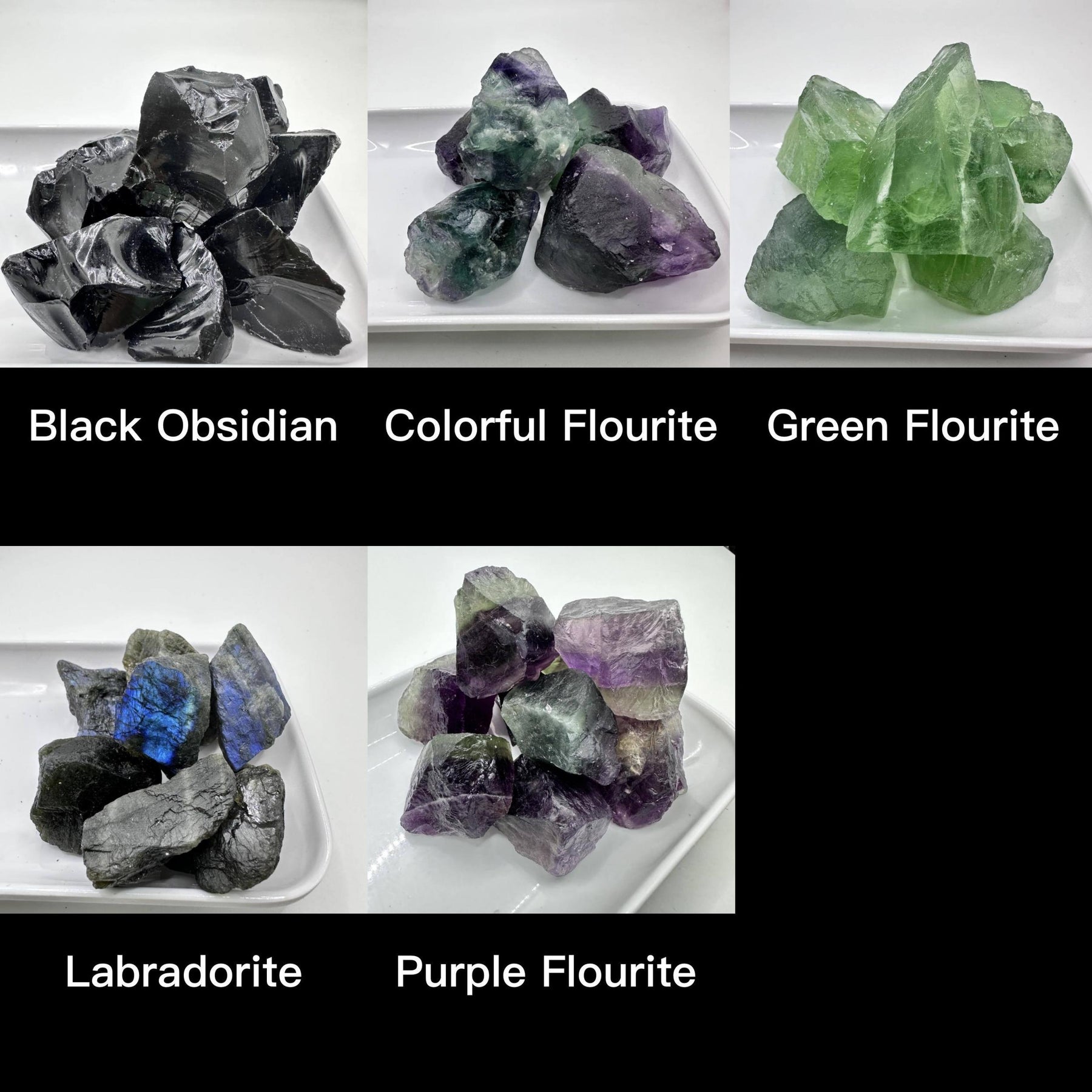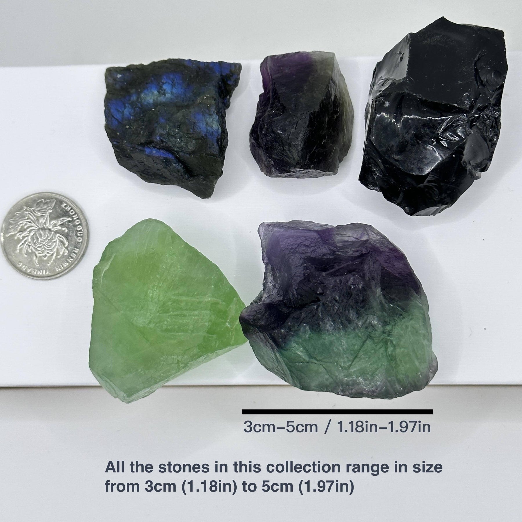 This raw stone collection includes Obsidian, Green Fluorite, Labradorite, Purple Fluorite. Natural, rough crystals.