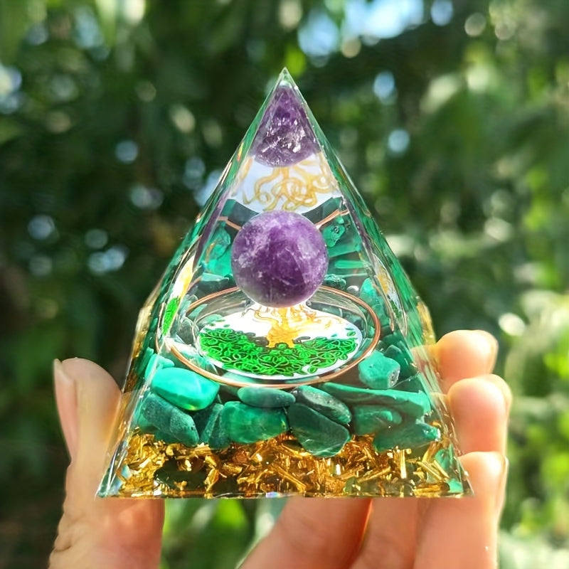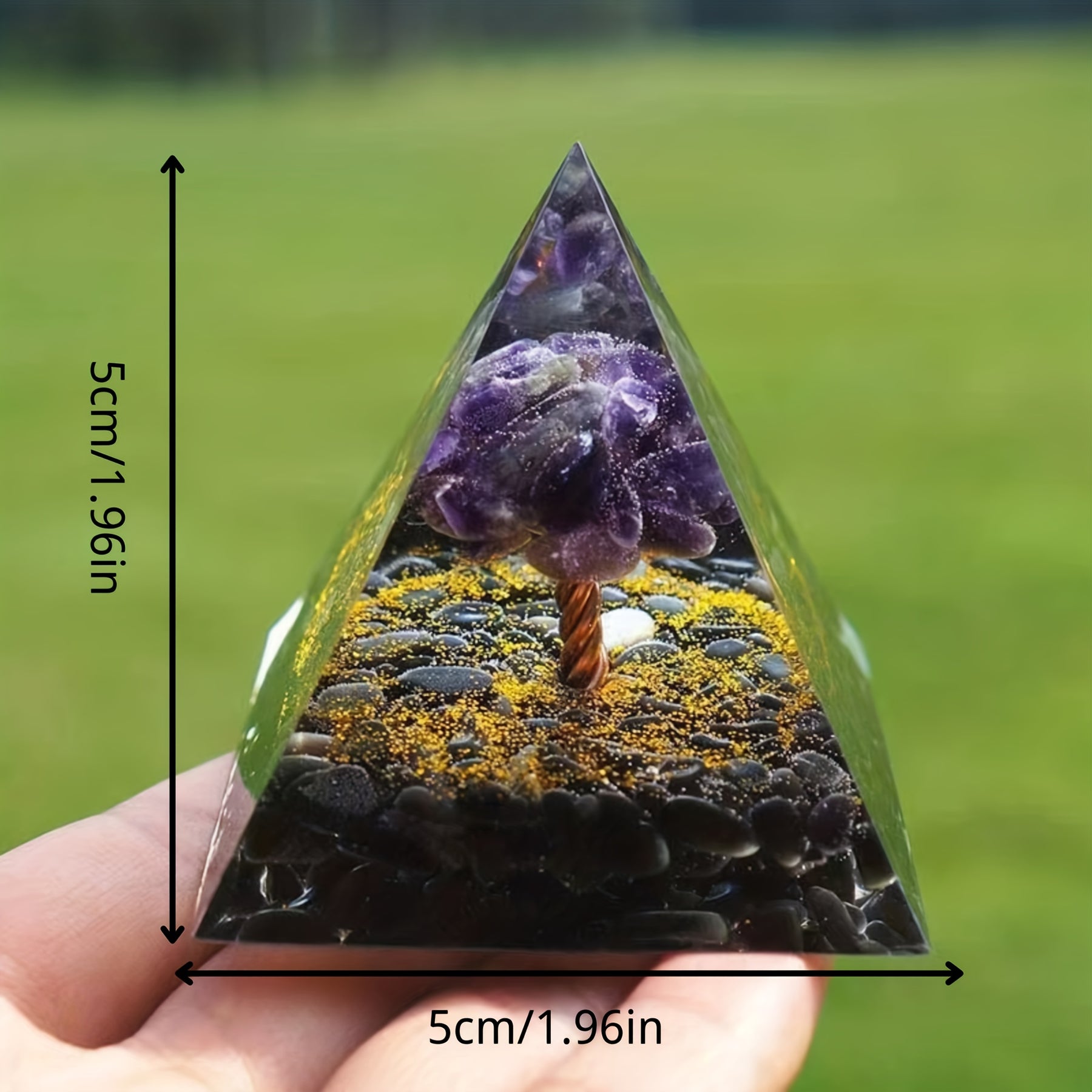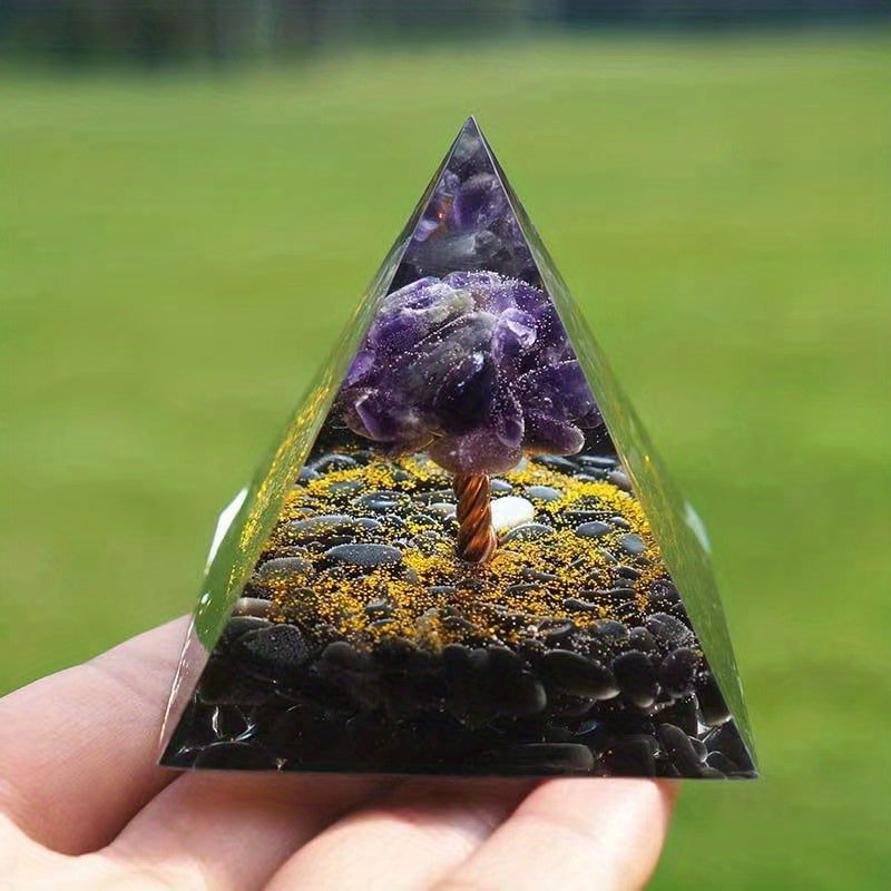 This orgone pyramid with amethyst crystal ball is designed to provide positive energy and protection from negative energies. It helps reduce stress, aids in healing, and enhances meditation practices.