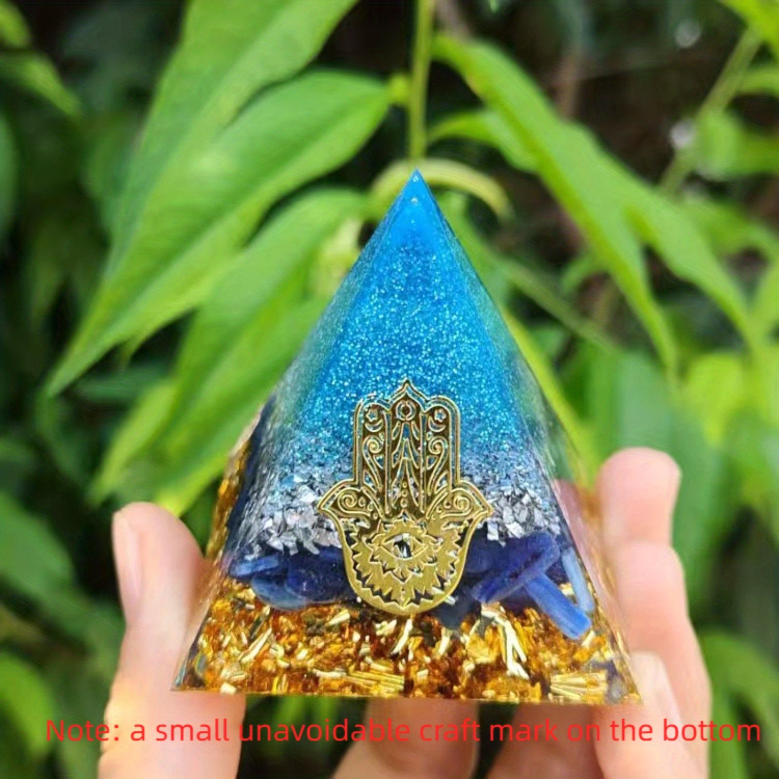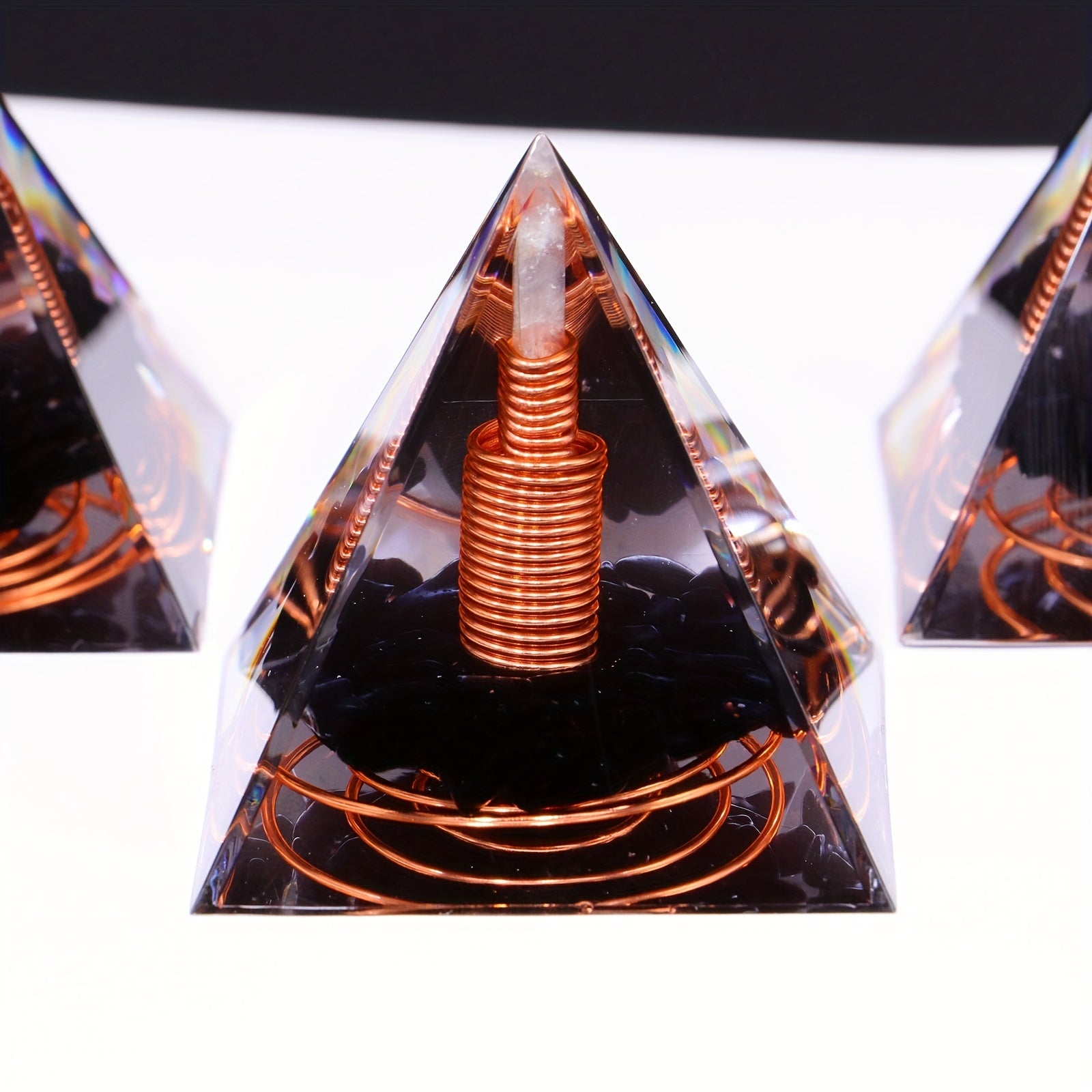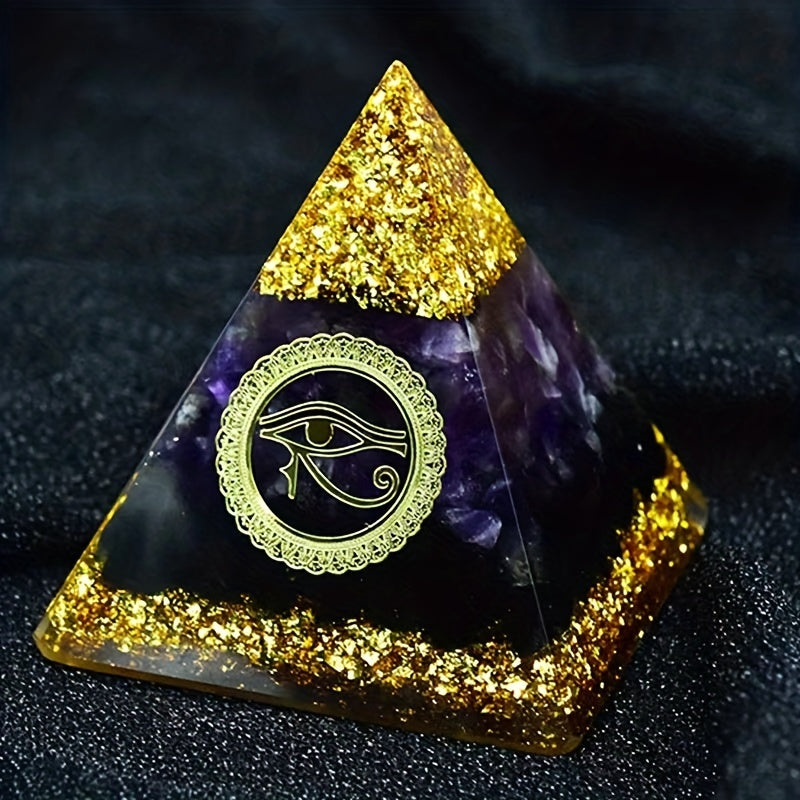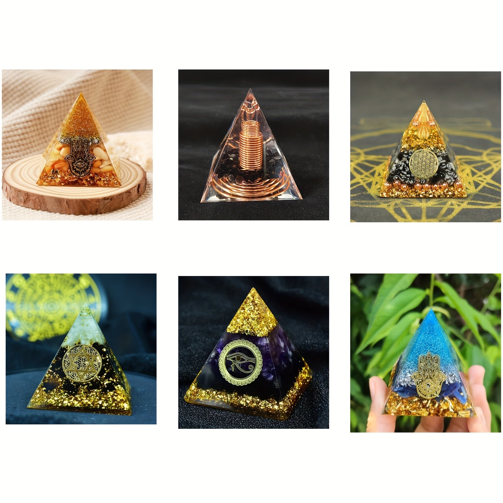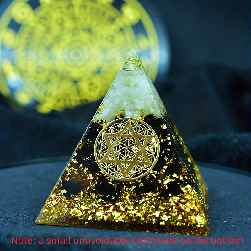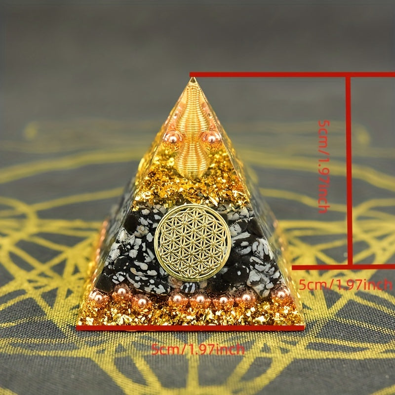 Experience stress reduction and positive vibes with this orgone pyramid featuring powerful crystals for enhanced energy flow.