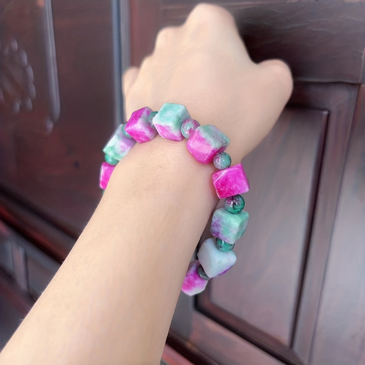 This beautiful bracelet features pink peach blossom jade stones in a stereo square design. It is perfect for women looking for a unique and stylish piece of jewelry.