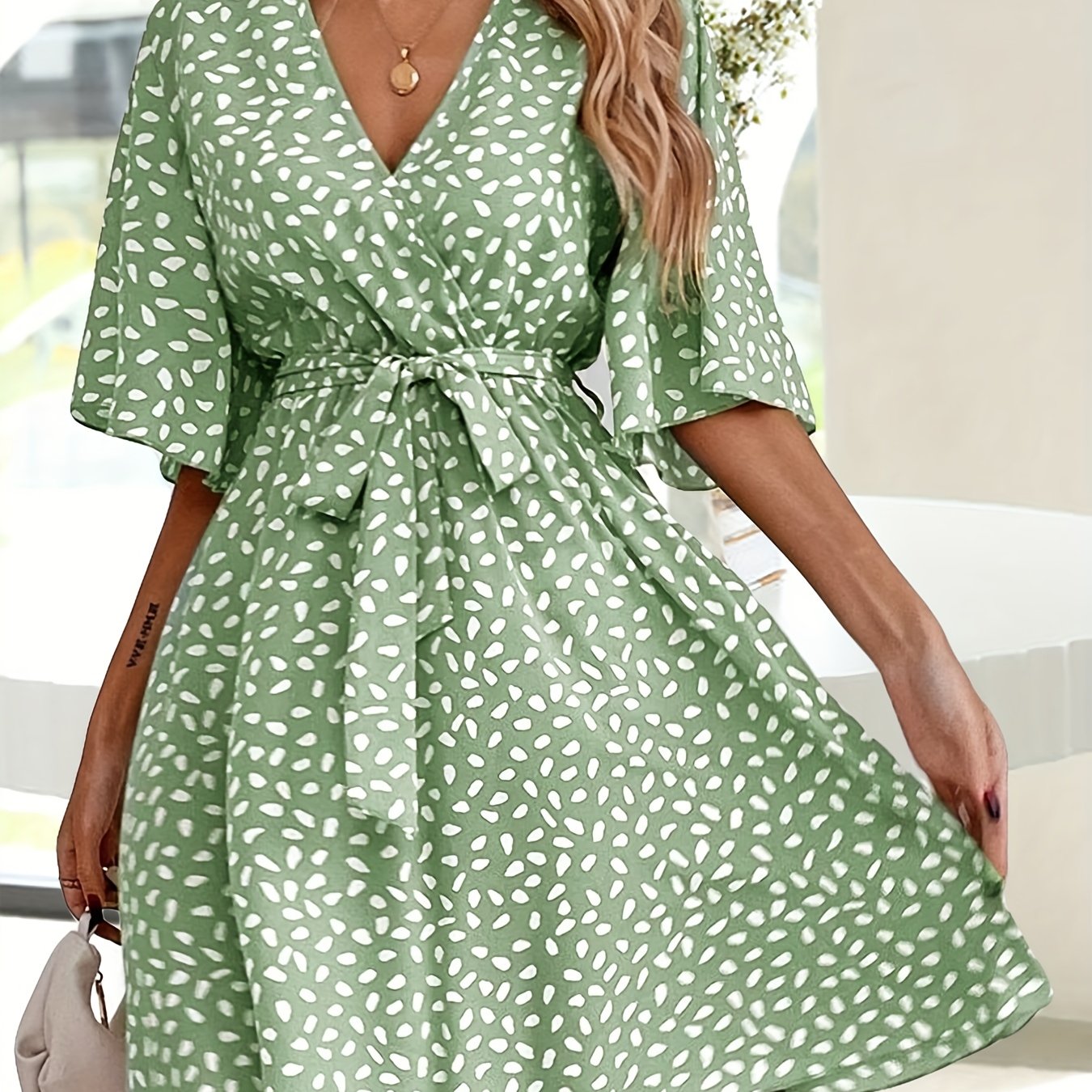 Stay stylish and comfortable this spring and summer with this allover print belted V neck dress. This short sleeve dress is perfect for any casual occasion.