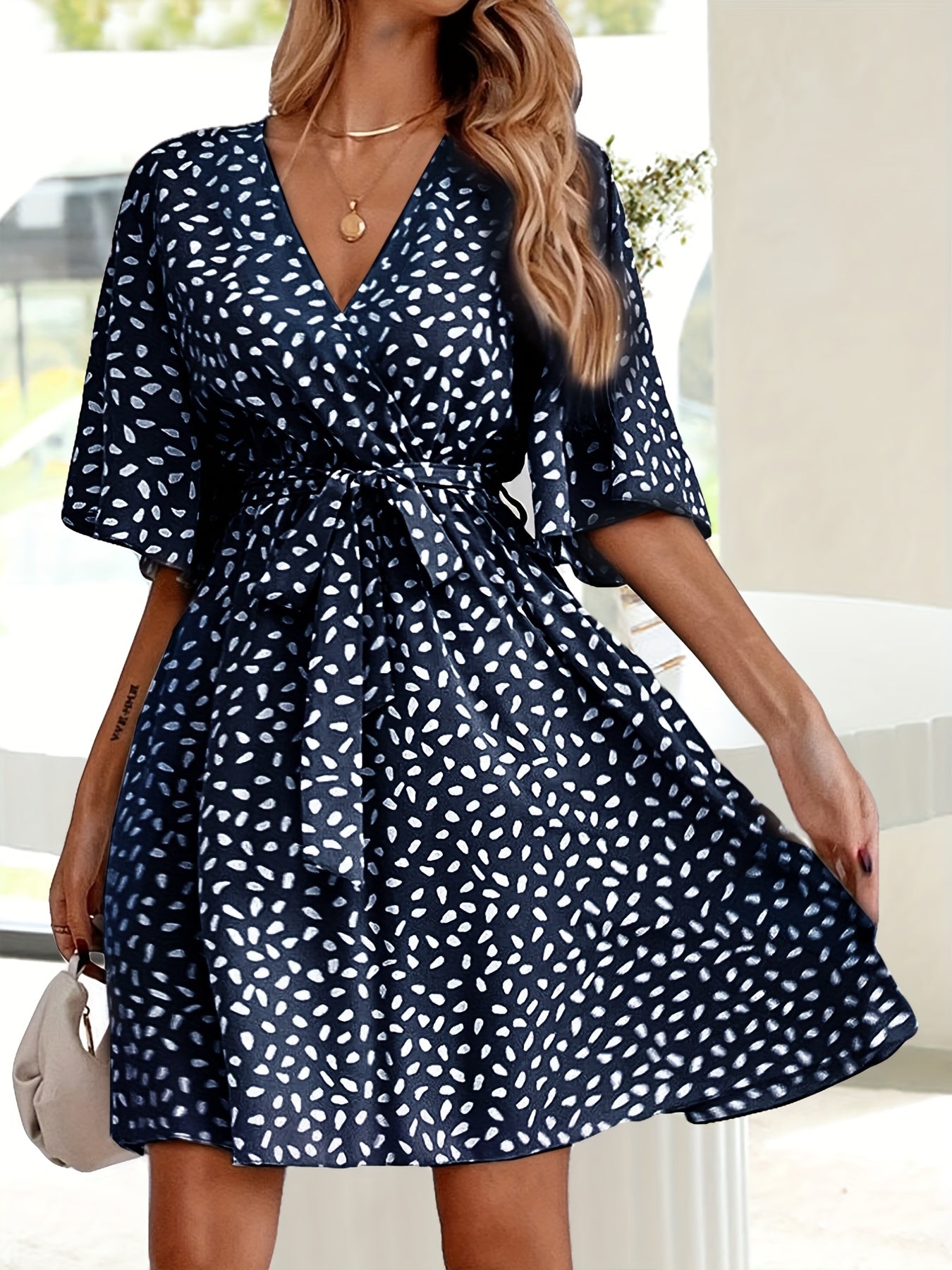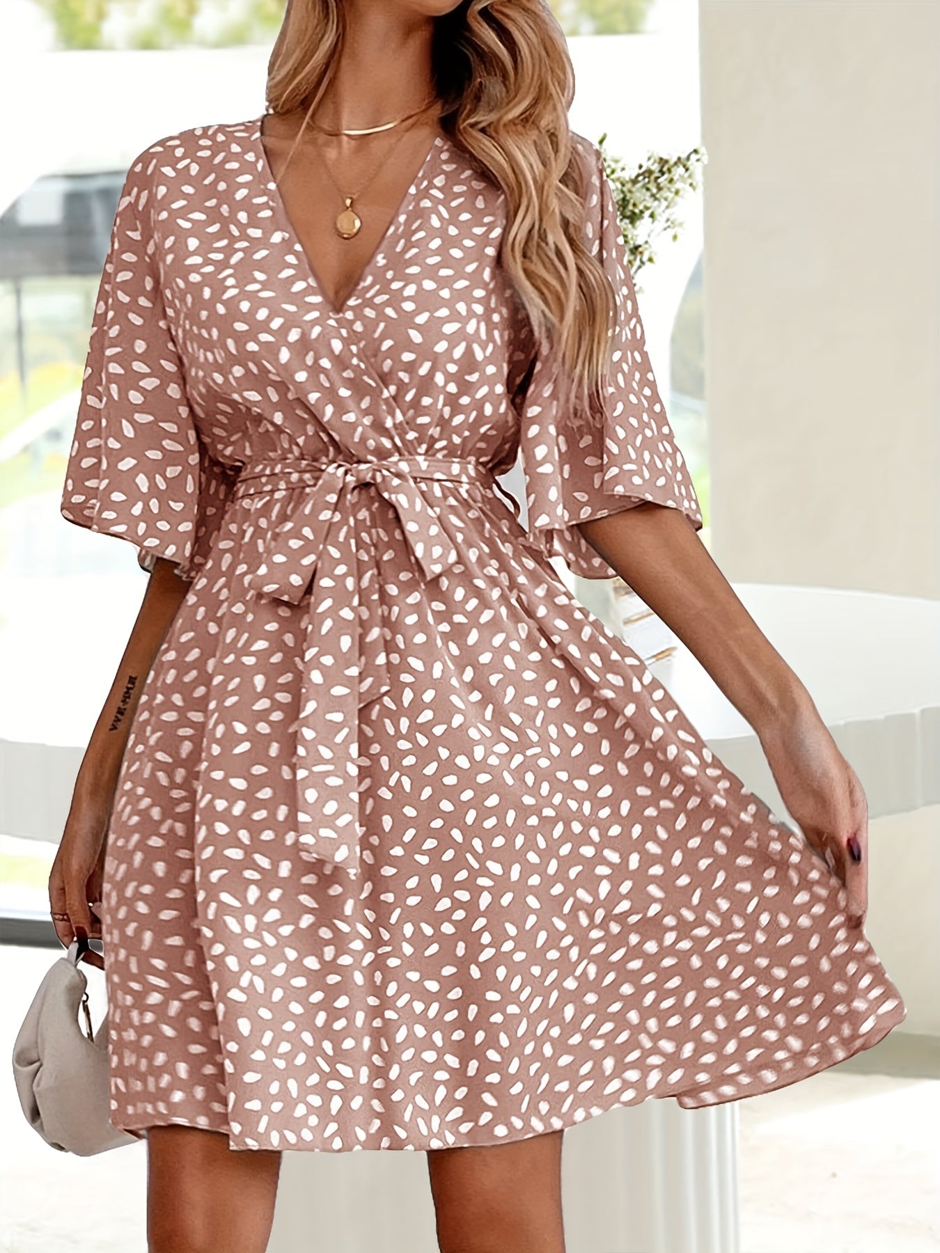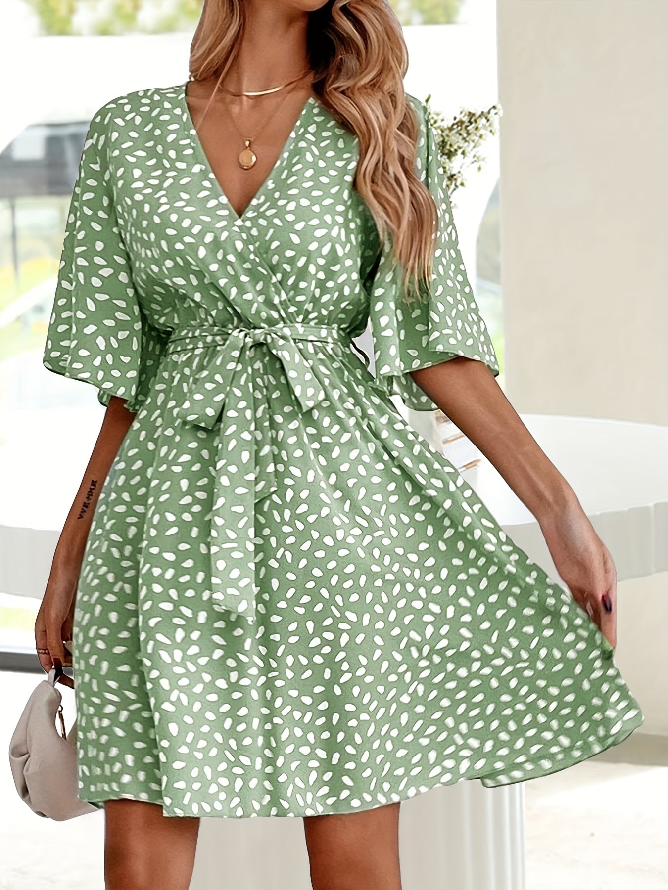 Print Belted V Neck Dress Short Sleeve Casual Dress