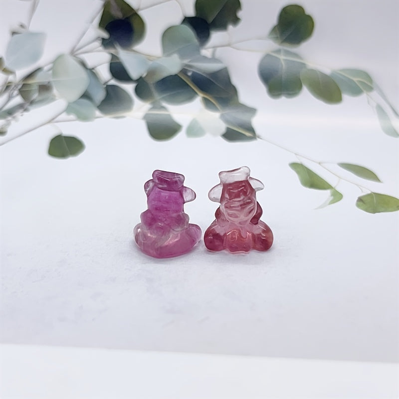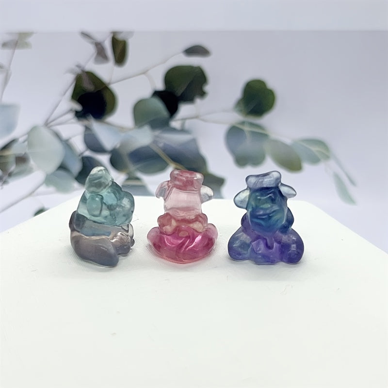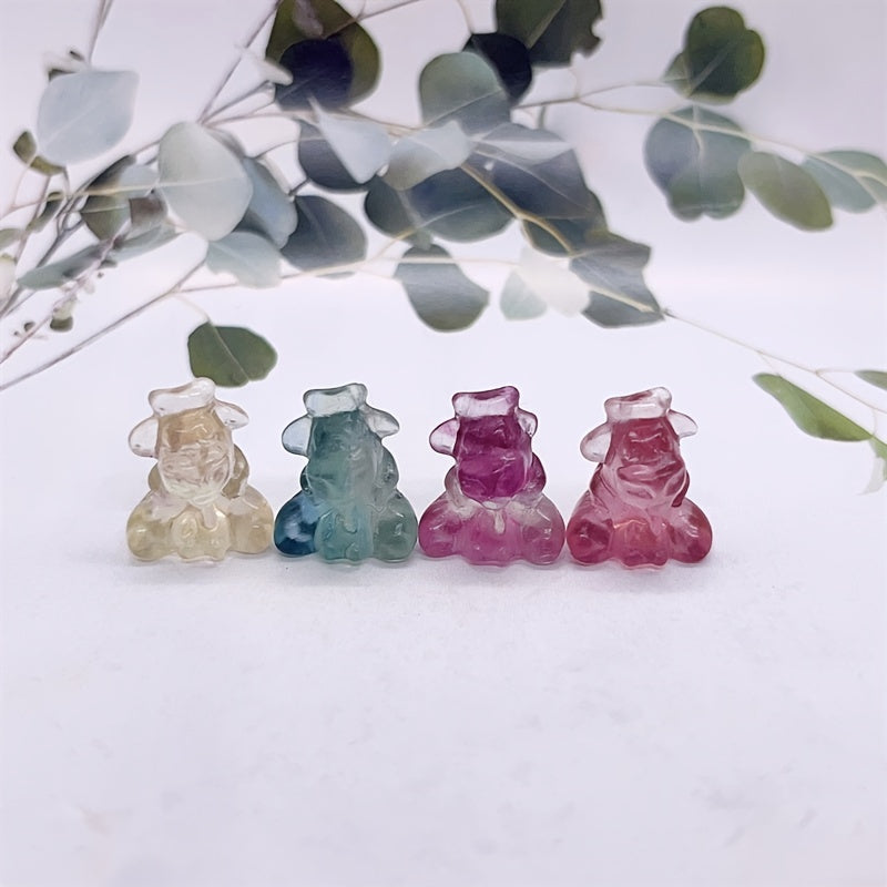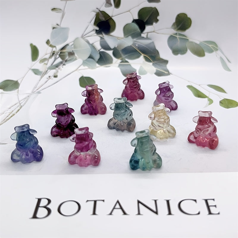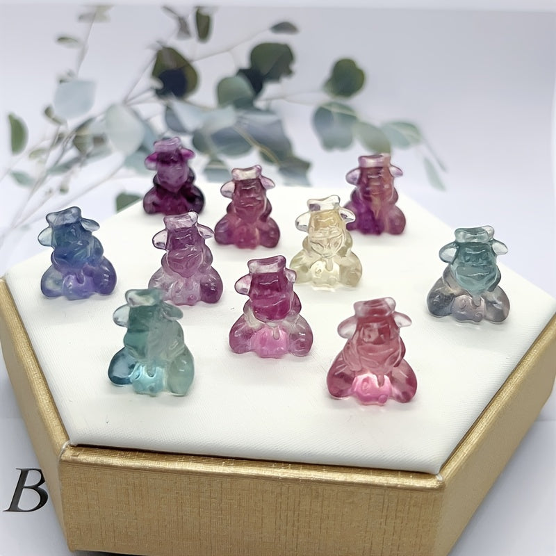 Bring positive energy into your space with this adorable rainbow fluorite cow carving ornament. Hand-carved from natural stone, this mini cow figurine is perfect for healing and meditation practices.