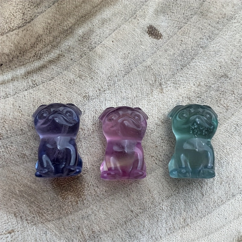 This adorable Pug Dog carving is handcrafted from colorful Rainbow Fluorite crystal. Perfect for healing and balancing energies.