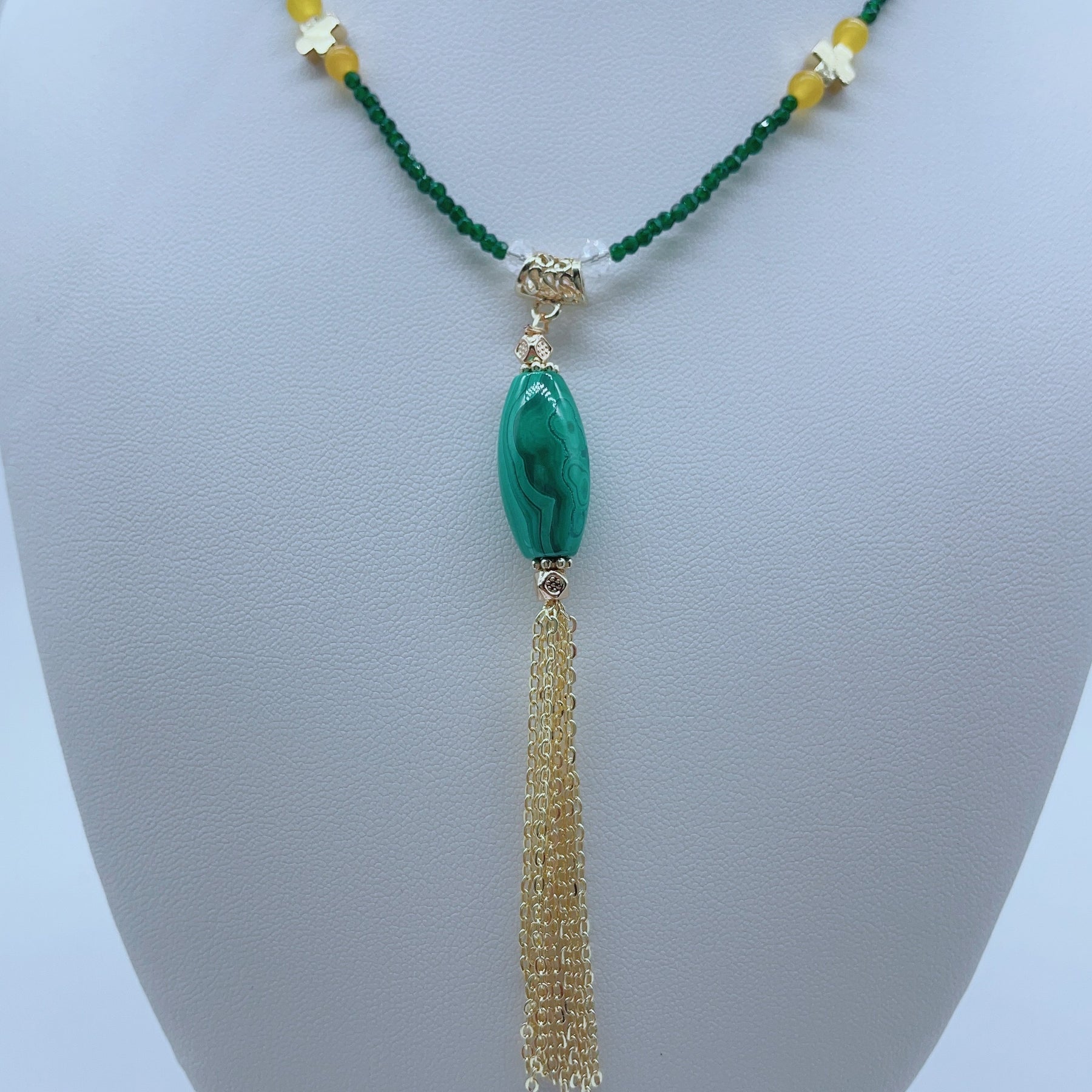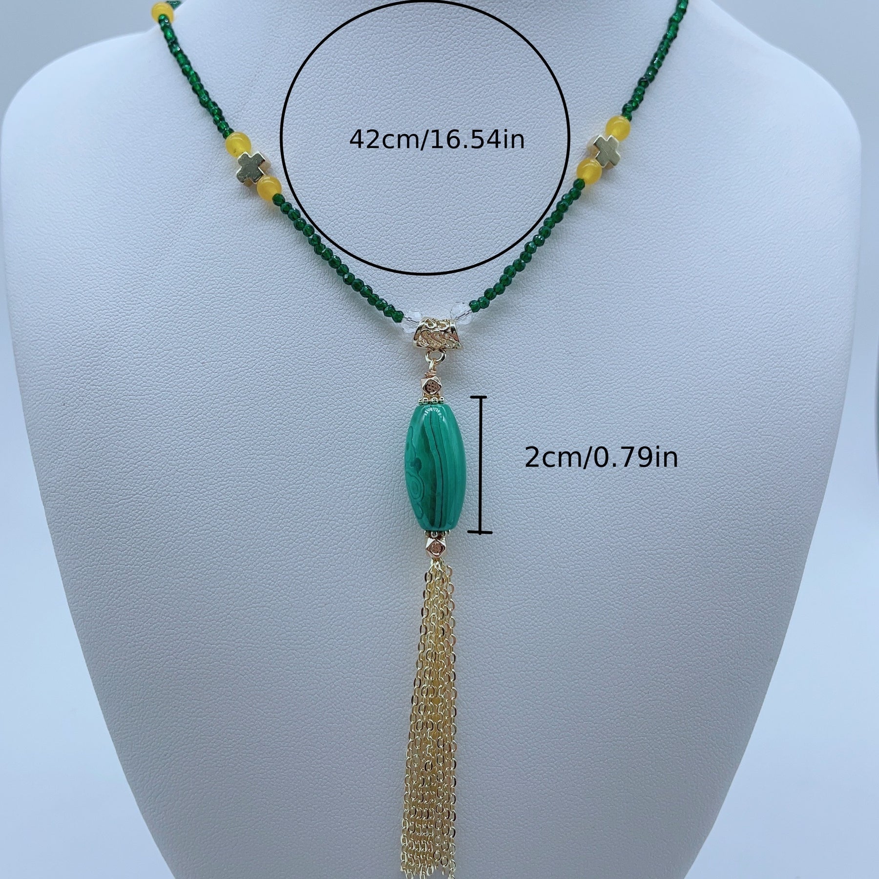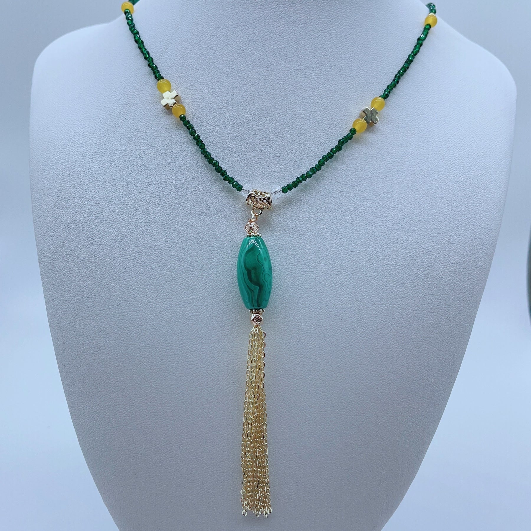 Elevate your look with this natural malachite necklace featuring a trendy tassel design. Perfect for any occasion, this necklace adds a touch of elegance to your outfit.
