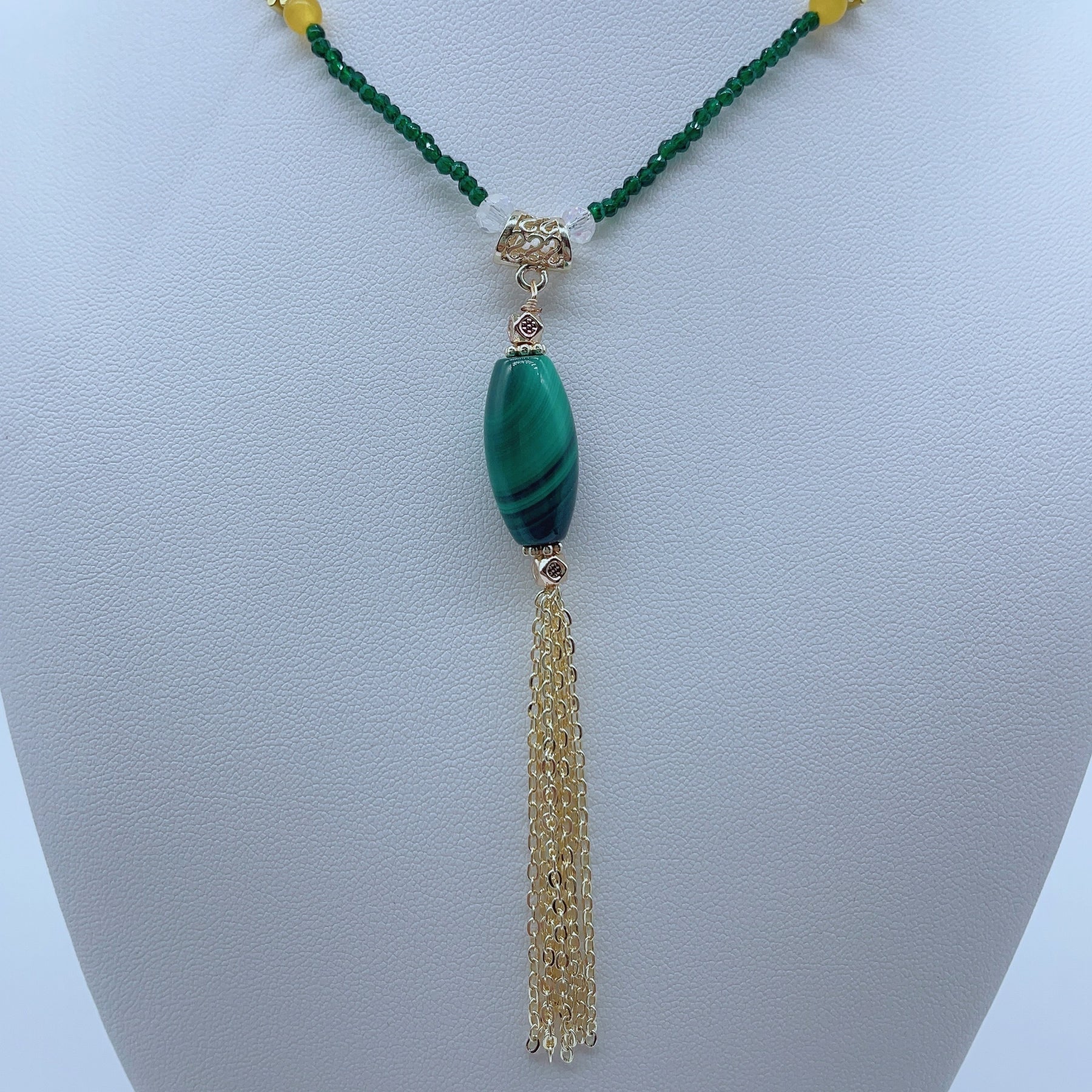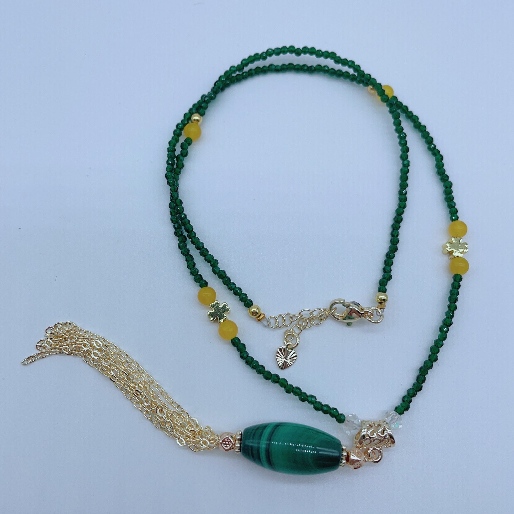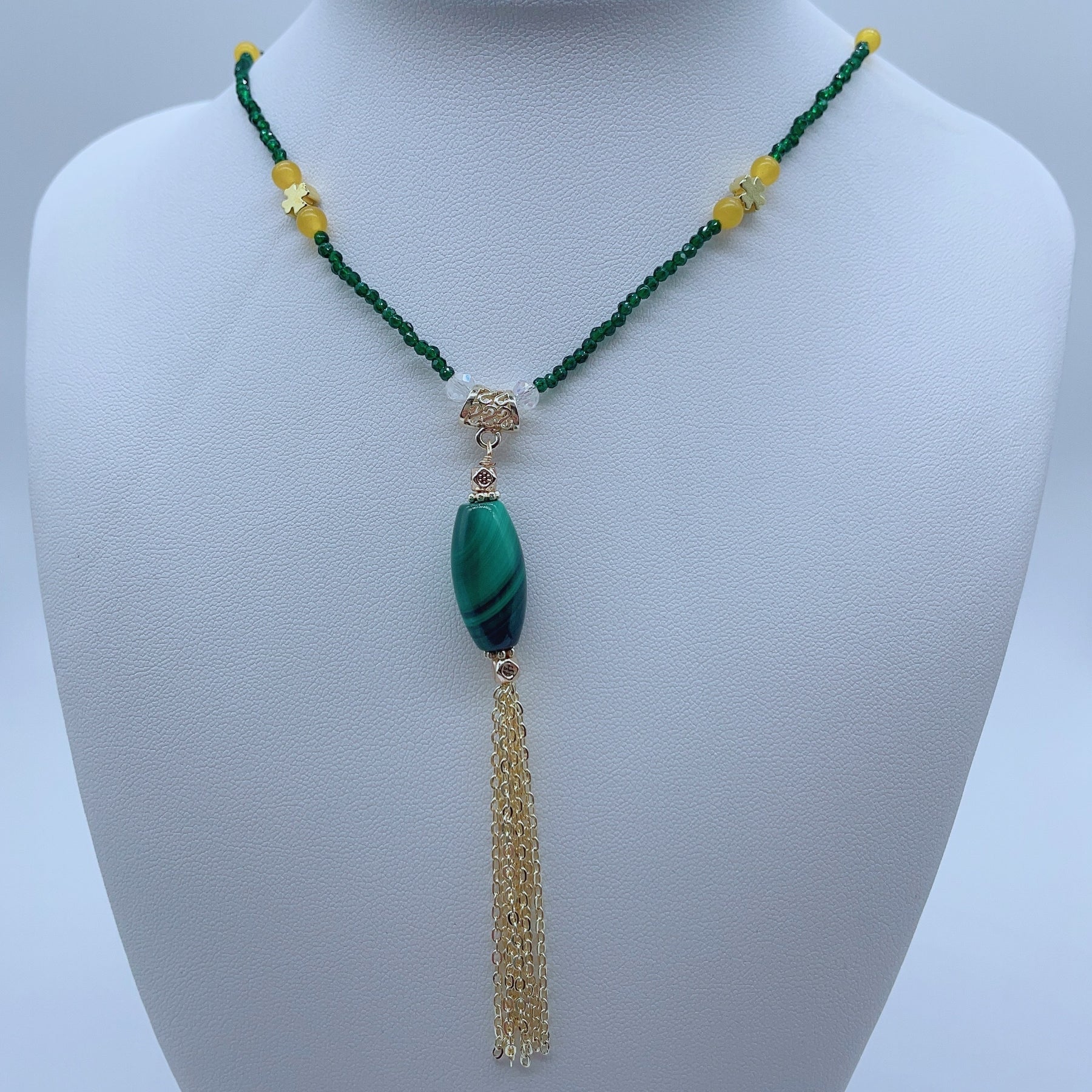 Elevate your look with this natural malachite necklace featuring a trendy tassel design. Perfect for any occasion, this necklace adds a touch of elegance to your outfit.