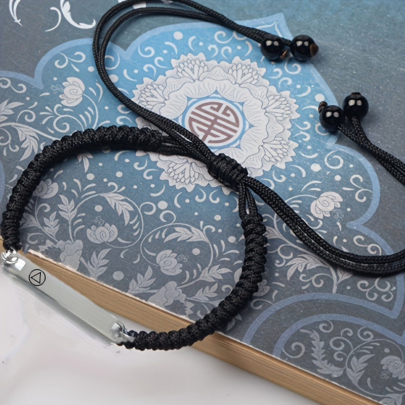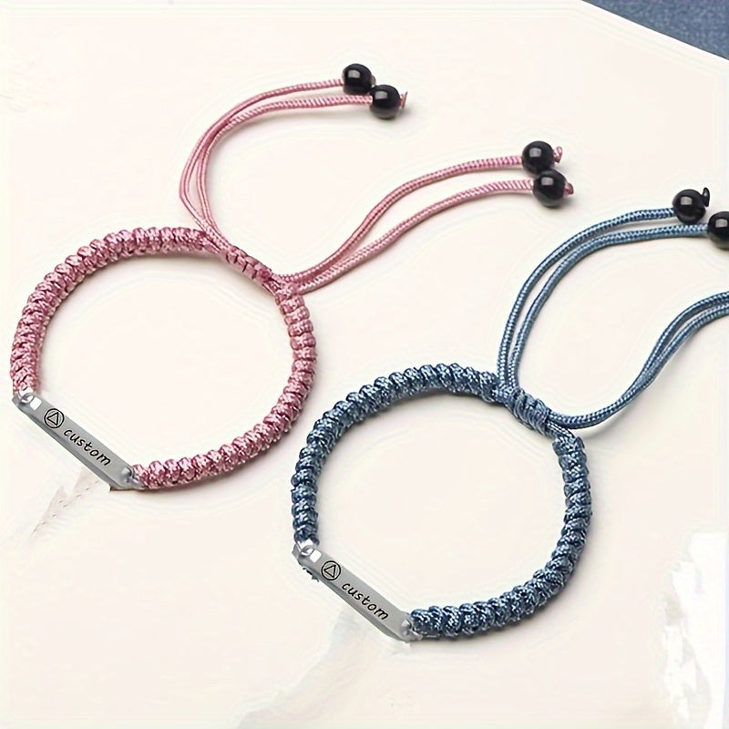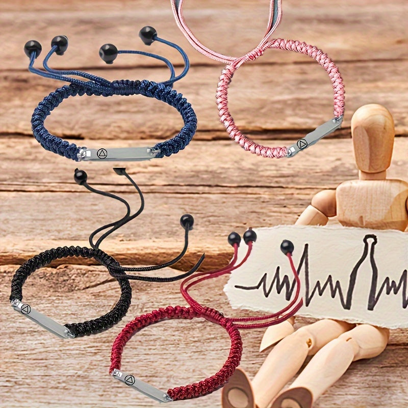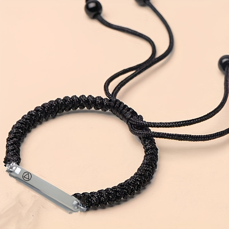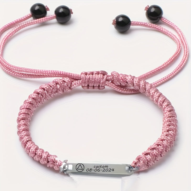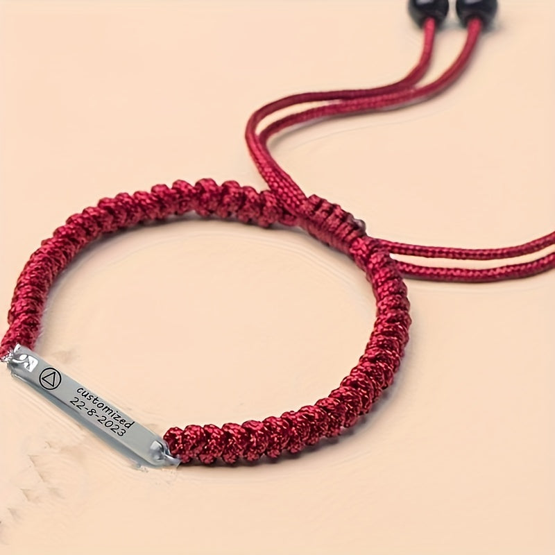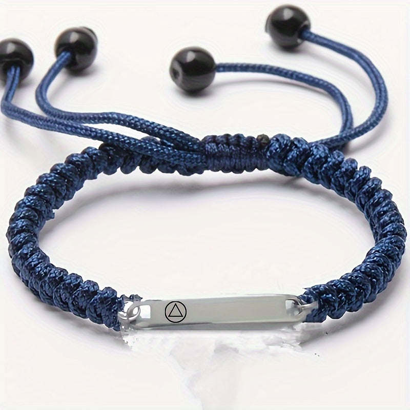 This adjustable woven rope bracelet features a custom engraving and the Alcoholics Anonymous symbol. It serves as a unisex inspirational support band for those in recovery.