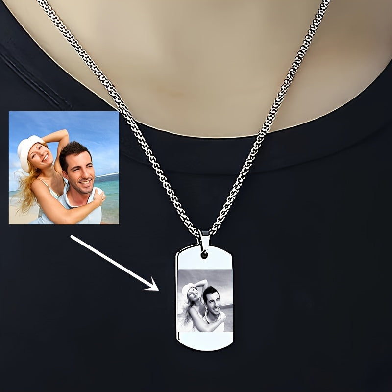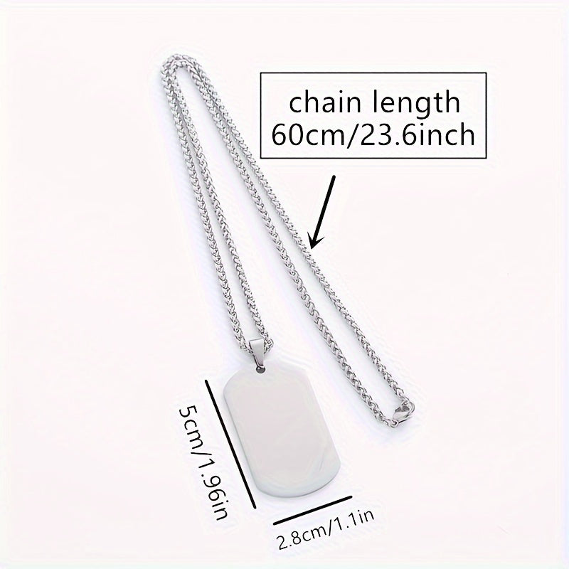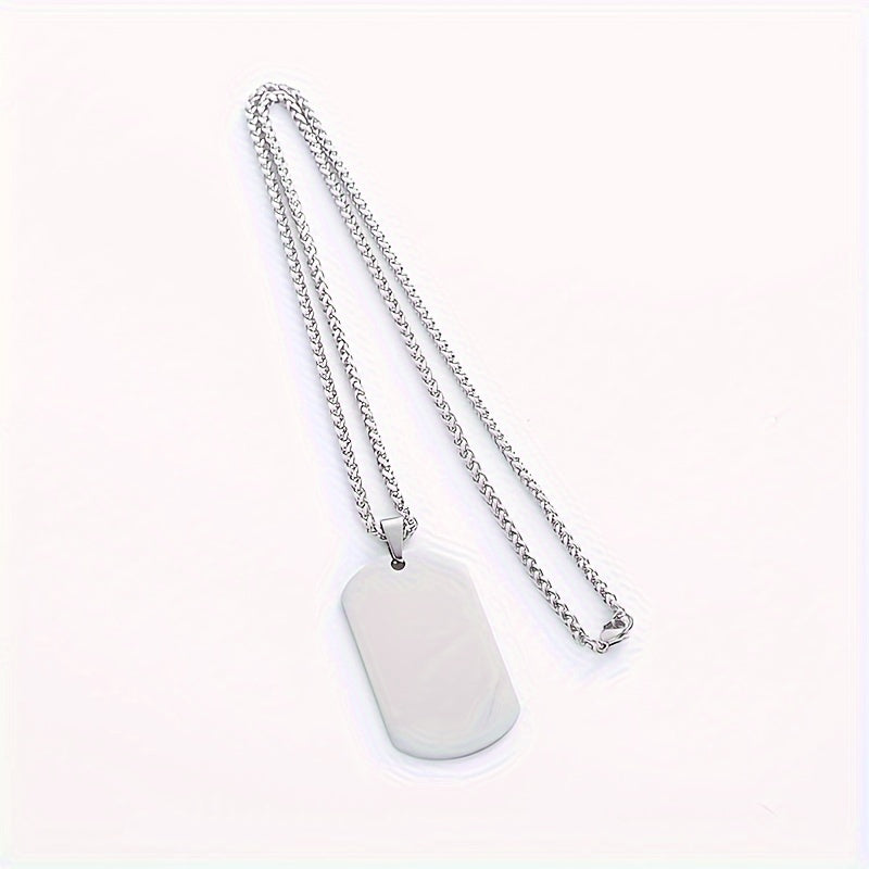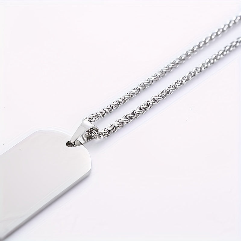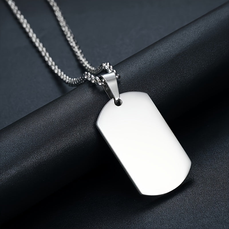 Sleek personalized necklace perfect for casual attire with a unique polished surface. Customize your own message or name on this durable stainless steel dog tag.