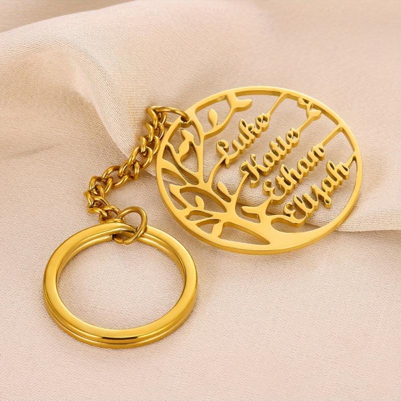 Keep your loved ones close with this personalized keychain featuring a family tree design. Made of high-quality stainless steel with 18K gold plating, this circular tag keychain is a perfect gift for family members.